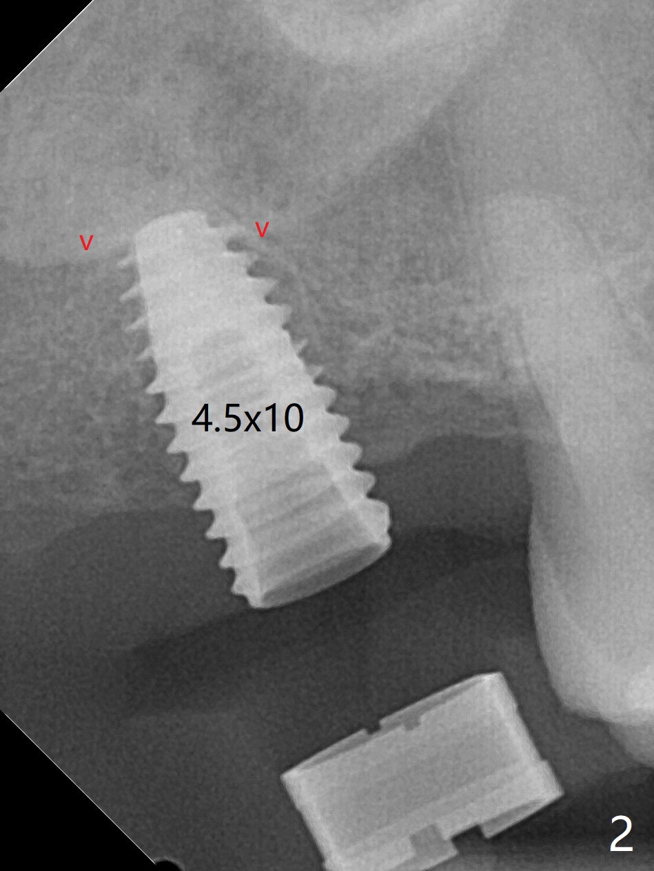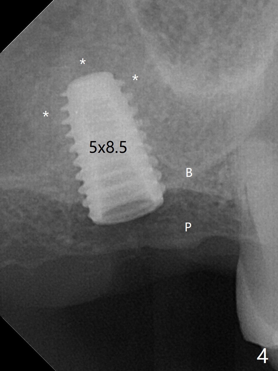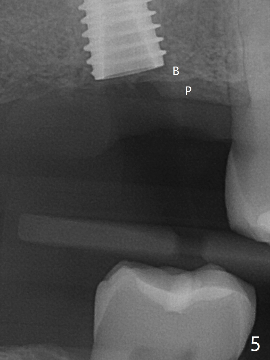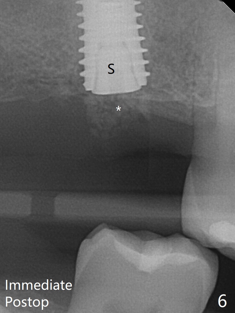 尽管事先准备15号刀片,看到完整2号牙牙槽嵴就舍不得切开。放置以前导板(用于即种),用软组织环形刀做个记号,接着用活检环形刀切取钻洞表面软组织,保存于PRF液体中。术前CT显示3号牙上方粘液囊肿(图一:*),而2号牙上方窦膜薄,总之两者都不好惹(容易感染,窦膜破),提升需要特别小心。完成初步钻洞后,使用17-19毫米长的DIO圆钻,放置粘性骨粉,使用4.5x10毫米报废植体进行提升(到第一横线),结果窦底没有穿(图二:红箭头)。接着使用尖头钻头从原来2.2x5.3毫米一直到3.5x10毫米,几乎每使用一个钻头后都检查窦底完整性,再放置骨粉,使用4.0x10毫米植体提升(到第二横线),好像穿过窦底(图三)。再加骨粉,使用4.5x10毫米植体扭力底,最后放置PRF膜,很难塞入上颌窦,结果只能从钻洞上端近中很小裂口塞入,植入5x8.5毫米正式植体(图四),上颌窦里骨粉呈蘑菇状(*)。临床检查腭侧(P)植体牙槽嵴下,其余骨壁难于判断。而咬翼片却显示植体颊侧(B),腭侧均在牙槽嵴下(图五)。为了减少术后骨质吸收,放置愈合螺帽后(图六:S),植体表面添加骨粉(*),最终把保存的软组织放回原位(二期手术:减少上颌窦与口腔交通,感染),牙周胶水粘固(图七)。术后没有鼻出血。