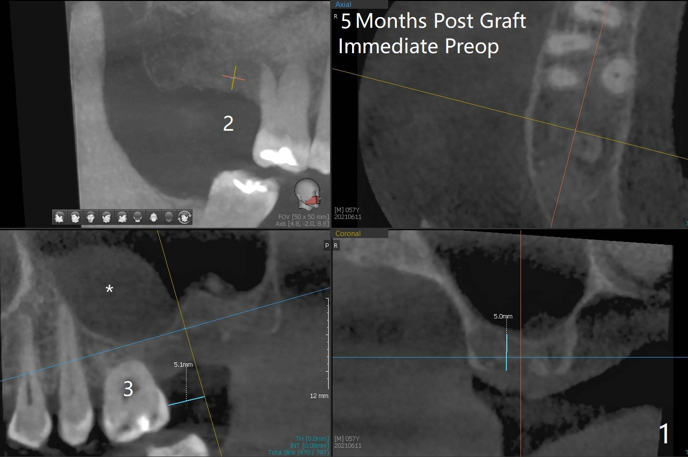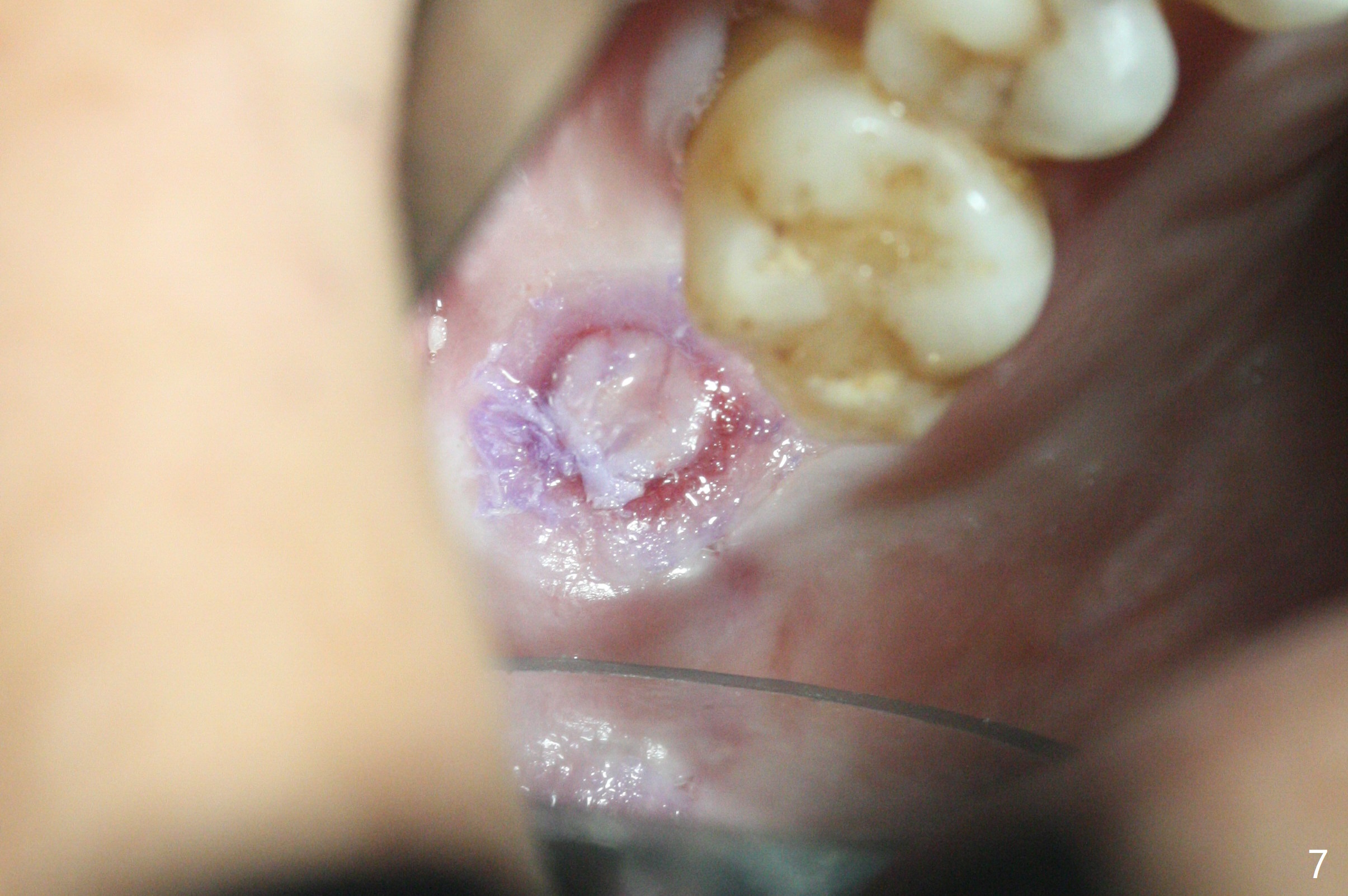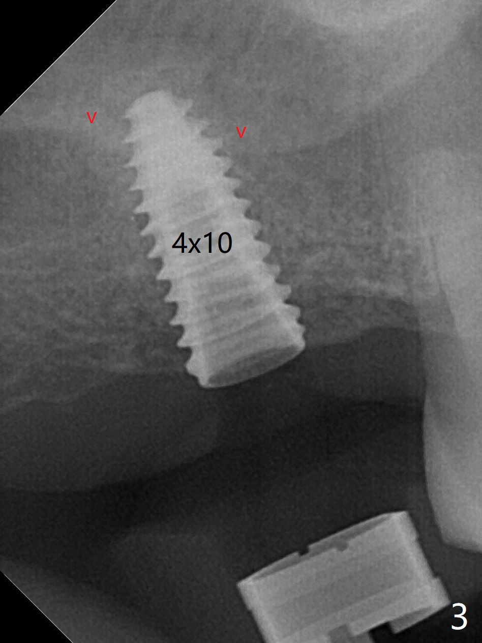 尽管事先准备15号刀片,看到完整2号牙牙槽嵴就舍不得切开。放置以前导板(用于即种),用软组织环形刀做个记号,接着用活检环形刀切取钻洞表面软组织,保存于PRF液体中。术前CT显示3号牙上方粘液囊肿(图一:*),而2号牙上方窦膜薄,总之两者都不好惹(容易感染,窦膜破),提升需要特别小心。完成初步钻洞后,使用17-19毫米长的DIO圆钻,放置粘性骨粉,使用4.5x10毫米报废植体进行提升(到第一横线),结果窦底没有穿(图二:红箭头)。接着使用尖头钻头从原来2.2x5.3毫米一直到3.5x10毫米,几乎每使用一个钻头后都检查窦底完整性,再放置骨粉,使用4.0x10毫米植体提升(到第二横线),好像穿过窦底(图三)。再加骨粉,使用4.5x10毫米植体扭力底,最后放置PRF膜,很难塞入上颌窦,结果只能从钻洞上端近中很小裂口塞入,植入5x8.5毫米正式植体(图四),上颌窦里骨粉呈蘑菇状(*)。临床检查腭侧(P)植体牙槽嵴下,其余骨壁难于判断。而咬翼片却显示植体颊侧(B),腭侧均在牙槽嵴下(图五)。为了减少术后骨质吸收,放置愈合螺帽后(图六:S),植体表面添加骨粉(*),最终把保存的软组织放回原位(二期手术:减少上颌窦与口腔交通,感染),牙周胶水粘固(图七)。术后没有鼻出血。