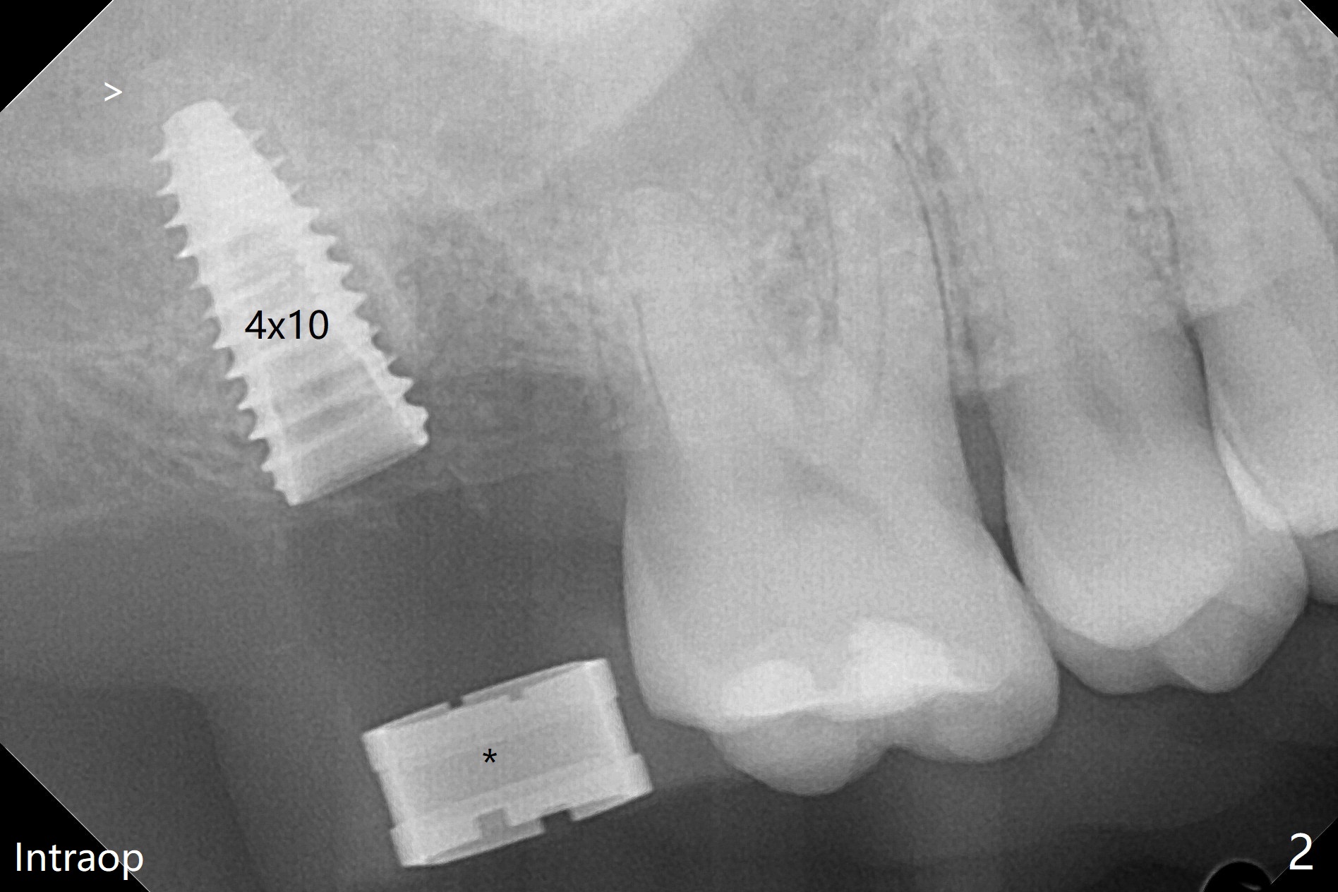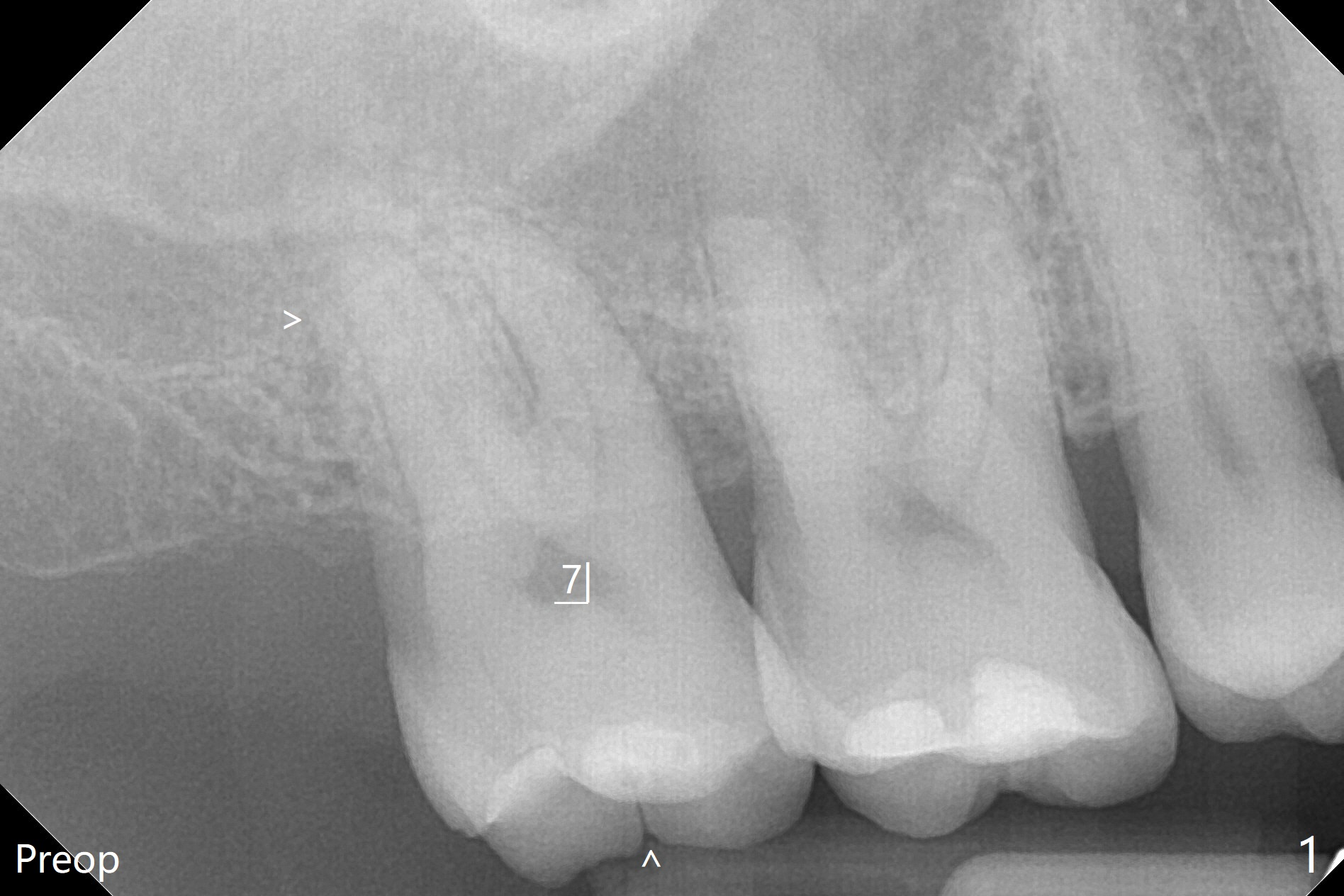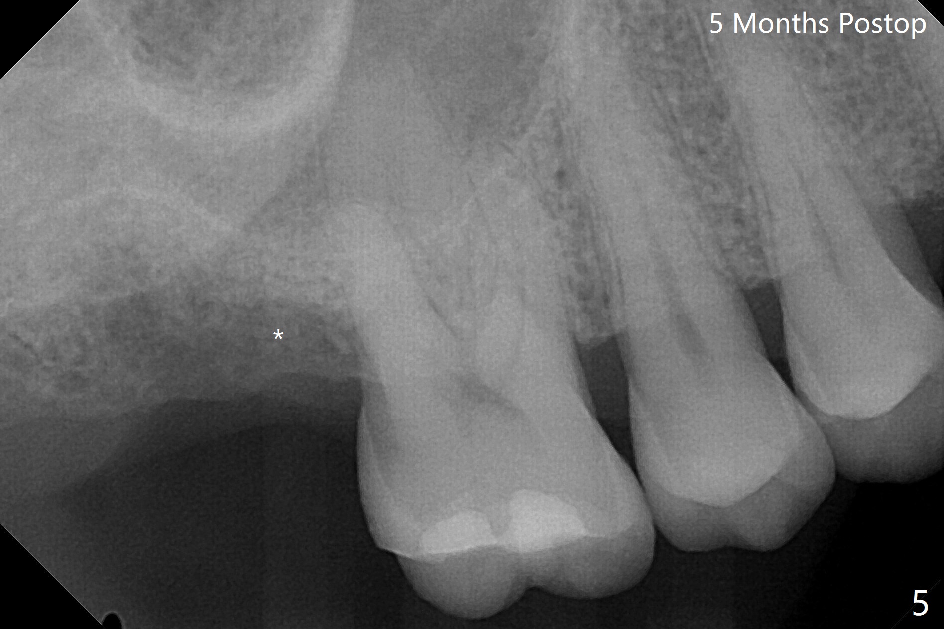 在导航协助下,我们可以一期准确进行上颌窦提升,即刻种植,即刻修复。56岁男(吸烟)右侧上颌窦有粘液囊肿,右上七牙齿折裂(图一(术前):^),CT检查表明植体植入腭侧牙槽窝比较合适(图一:>)。为了减少对囊肿损伤,我们使用导板(图二 *)完成初步钻洞,接近上颌窦底板,然后放置粘性骨(>),用4x10毫米dummy(报废)植体慢速(15 RPM)旋入进行内提升,同时准确控制深度。再次放置骨粉,使用4.5x10毫米报废植体上推;最后放置骨粉后(图三 >),植入正式植体(5x9毫米,扭力大于35Ncm)和修复基台(6.5x4(4)),怀疑后者没有完全就位,后来使用小的基台(图四,并且调整高度),植体和基台周围放置骨粉(*),然后安置临时牙冠。咬颌面没有接触,临时牙冠主要目的是防止骨粉丢失。反复告诉病人不能咬东西。术后两周病人主诉临时牙冠太大,试图减少颊舌侧向,不幸的是却减少近中远中向,造成临时牙冠不稳定。一周后牙冠和基台松动,取出,放置愈合螺帽,牙槽窝基本愈合。病人将术后近四个月复诊,拍摄根尖片和咬翼片,如果骨质愈合良好,尝试在尚未完全愈合的伤口放置小号愈合基台。术后5个月牙冠粘固后拧紧植体松动,取出(图五(*:缺损)),植骨。四个月后骨质高度近5毫米(图六)。再次植入尽量避免窦膜穿孔(粘液囊肿),塞入PRF膜。Return to Upper Molar Immediate Implant, Prevent Molar Periimplantitis (Protocols, Table) No Deviation 不理想病例 开场白Xin Wei, DDS, PhD, MS 1st edition 08/10/2020, last revision 06/12/2021