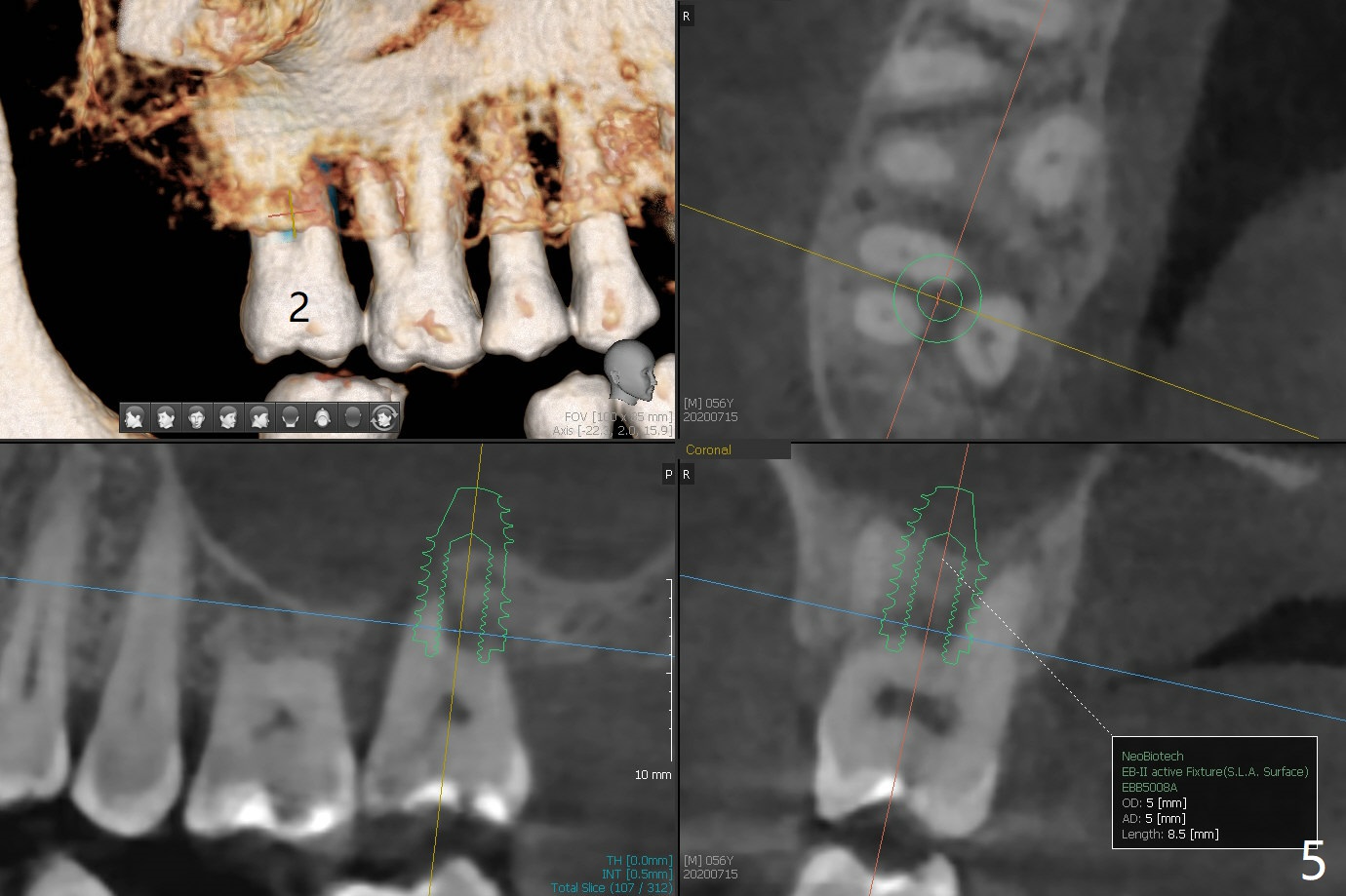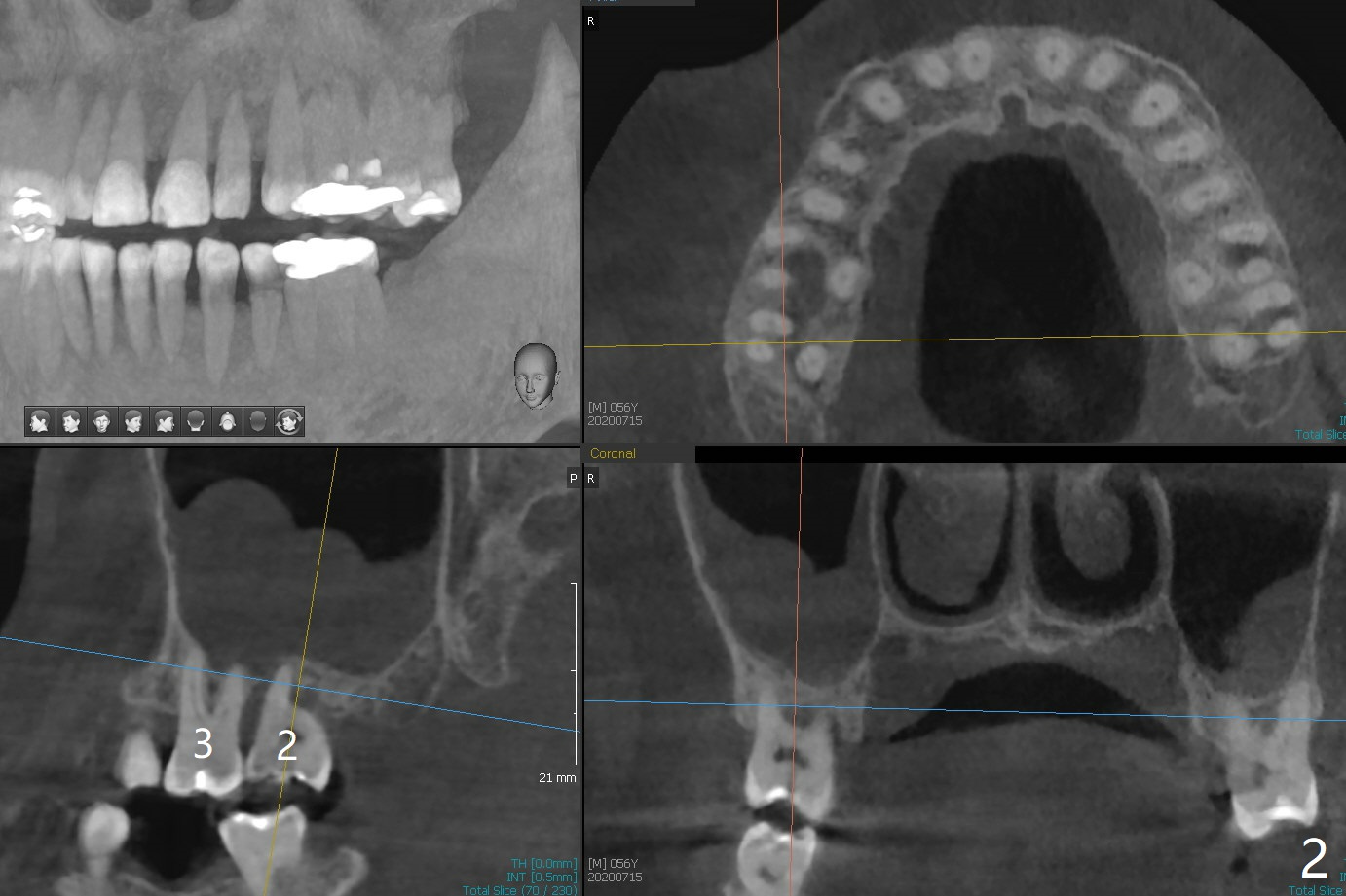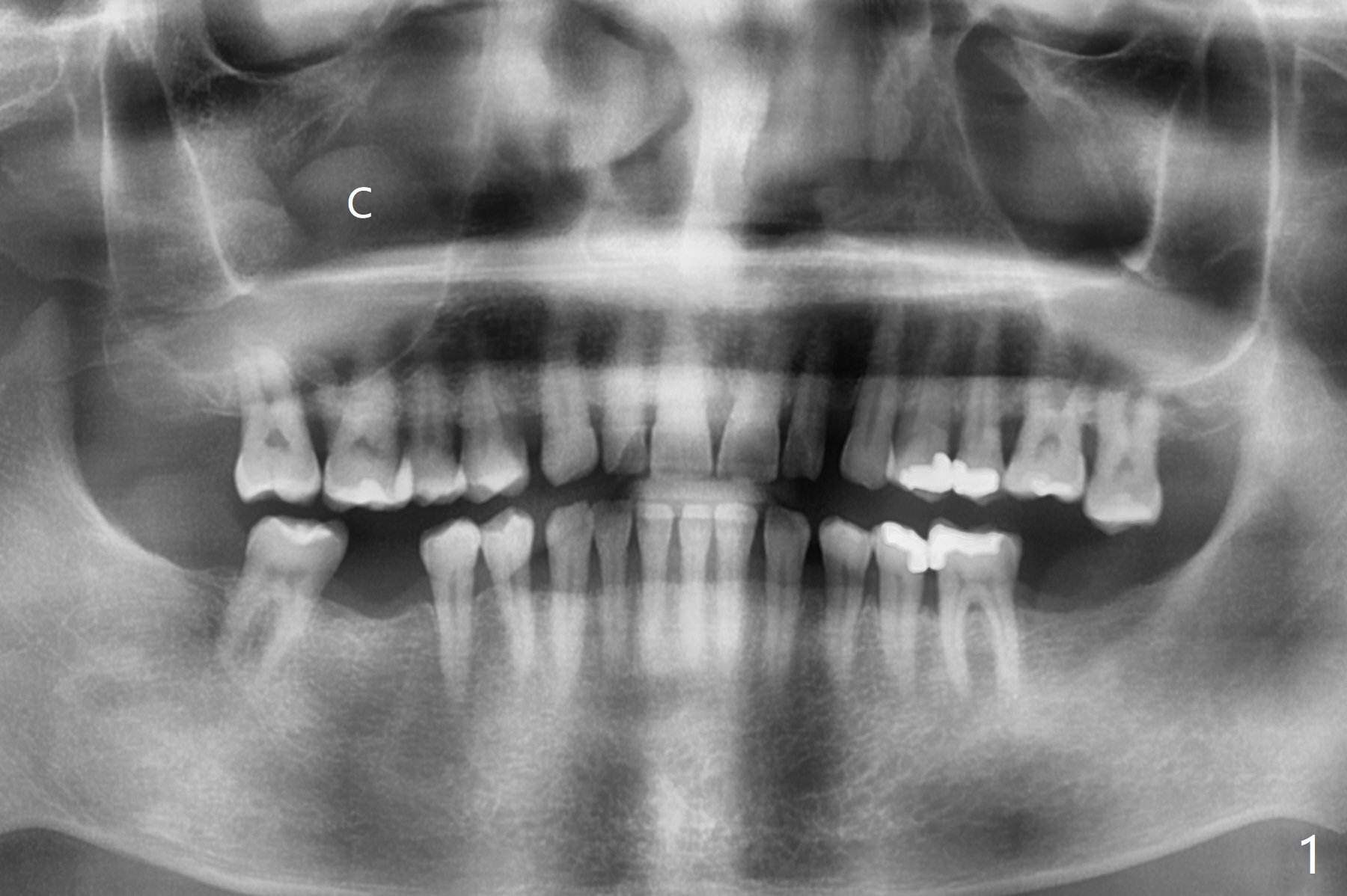 A 56-year-old man (smoker) has pain at #2 (Fig.1-3 thickened sinus membrane (R>L), C: mucous retention cyst) associated with subgingival crack (Fig.4 arrowheads). A 5x8.5 mm implant will be immediately placed with sinus lift aided by PRF membrane (Fig.5). A narrow implant will be placed at #30 (Fig.6).