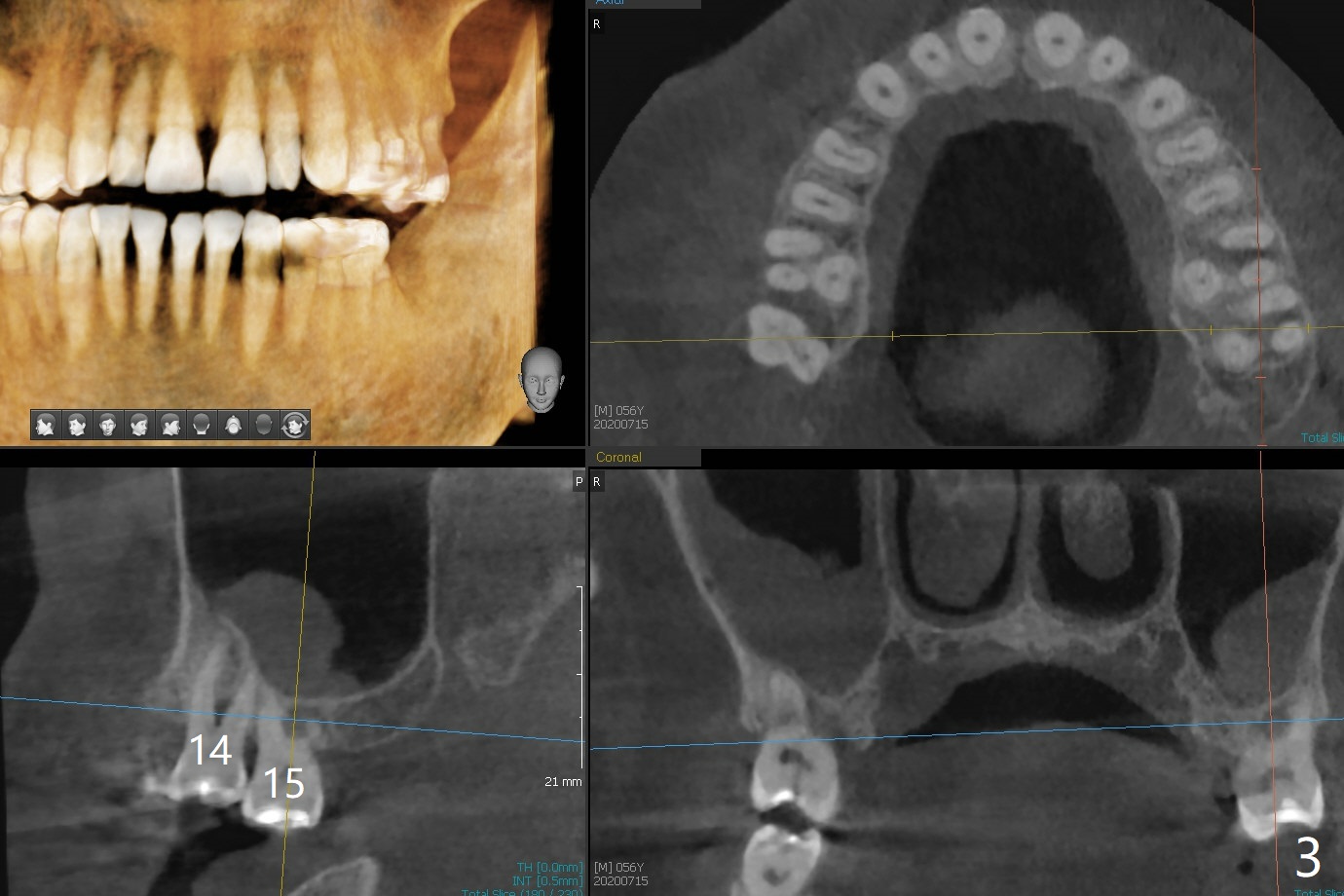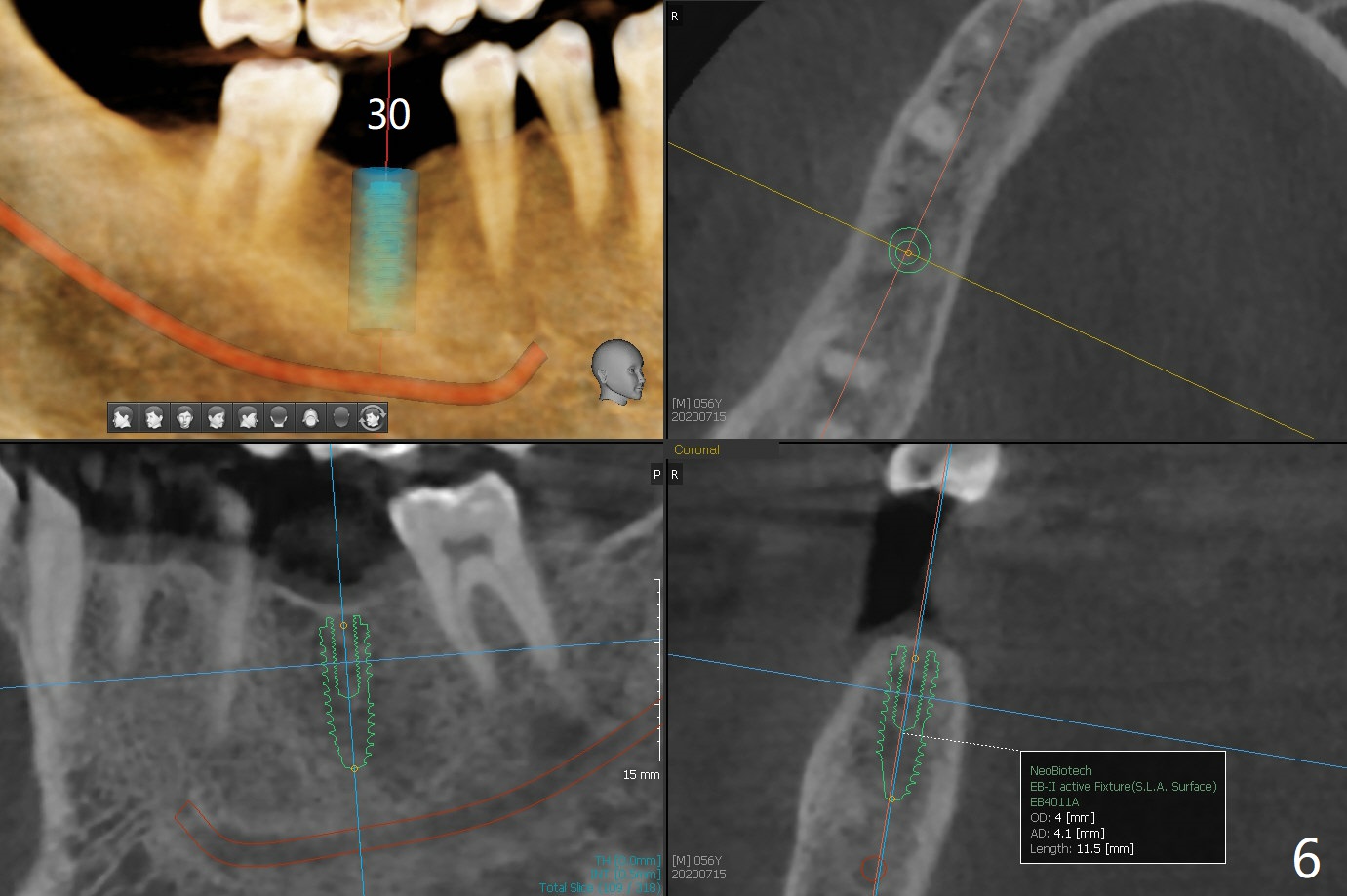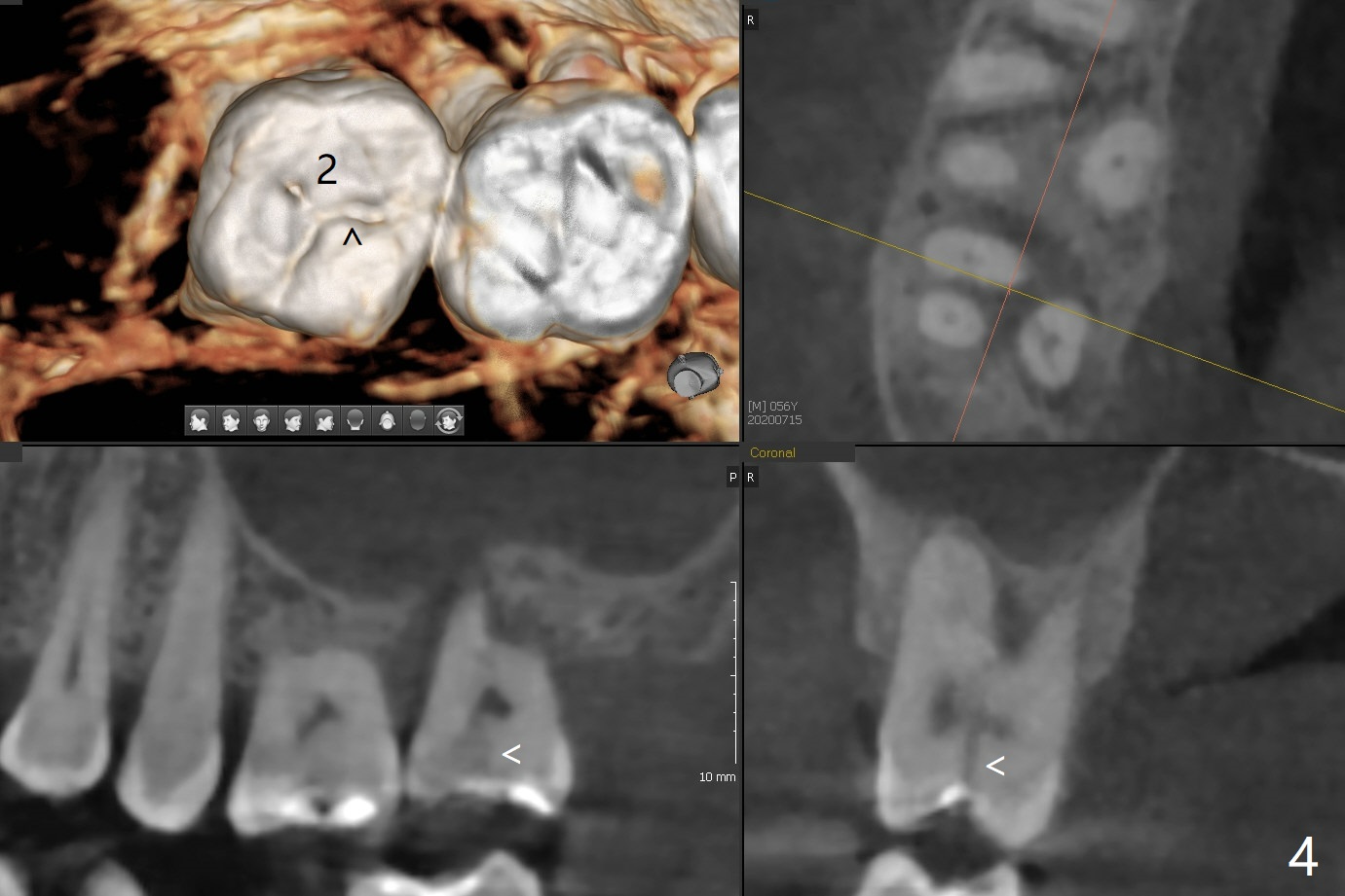 A 56-year-old man (smoker) has pain at #2 (Fig.1-3 thickened sinus membrane (R>L), C: mucous retention cyst) associated with subgingival crack (Fig.4 arrowheads). A 5x8.5 mm implant will be immediately placed with sinus lift aided by PRF membrane (Fig.5). A narrow implant will be placed at #30 (Fig.6).