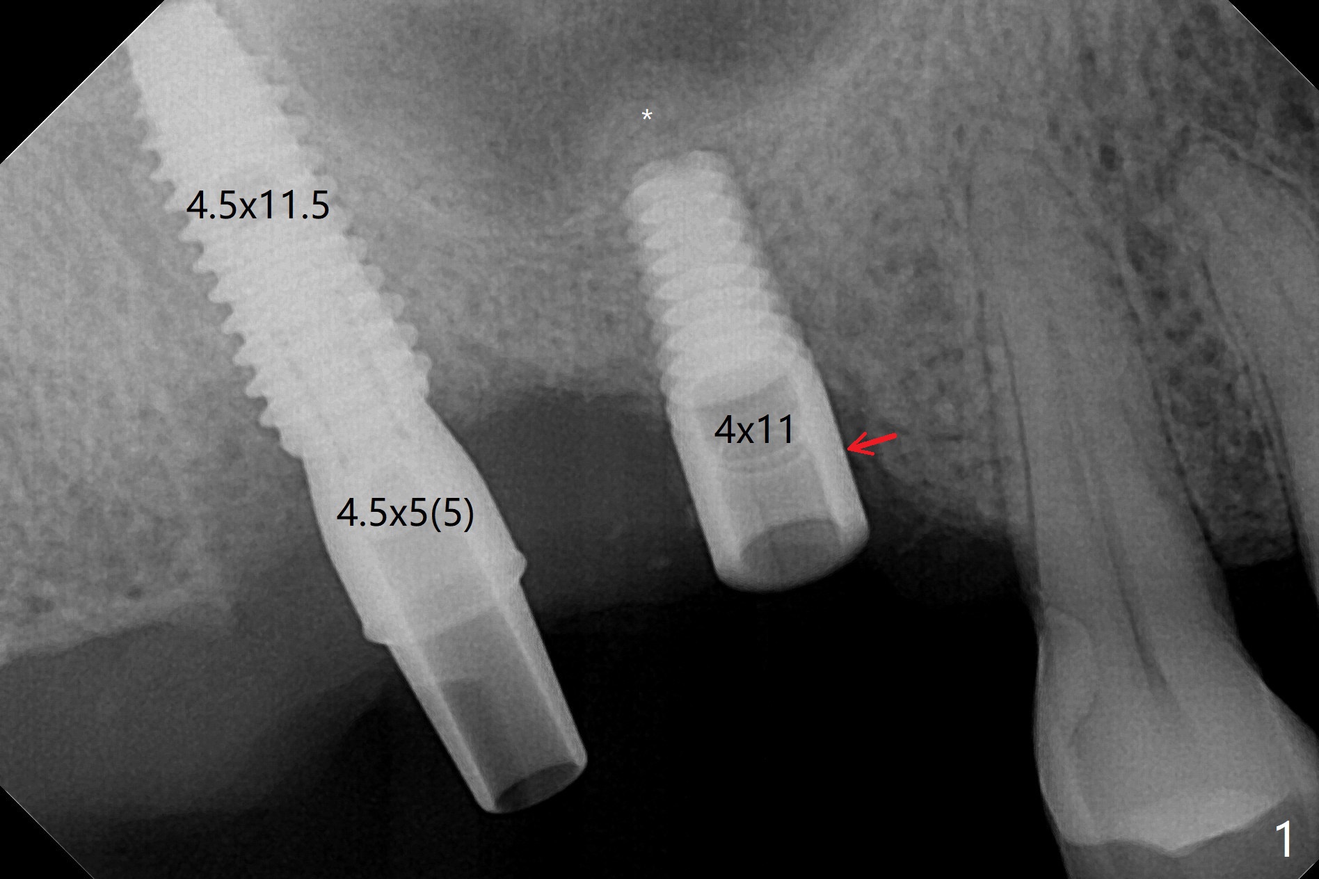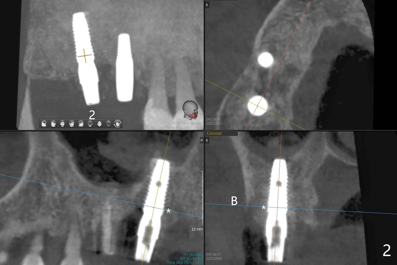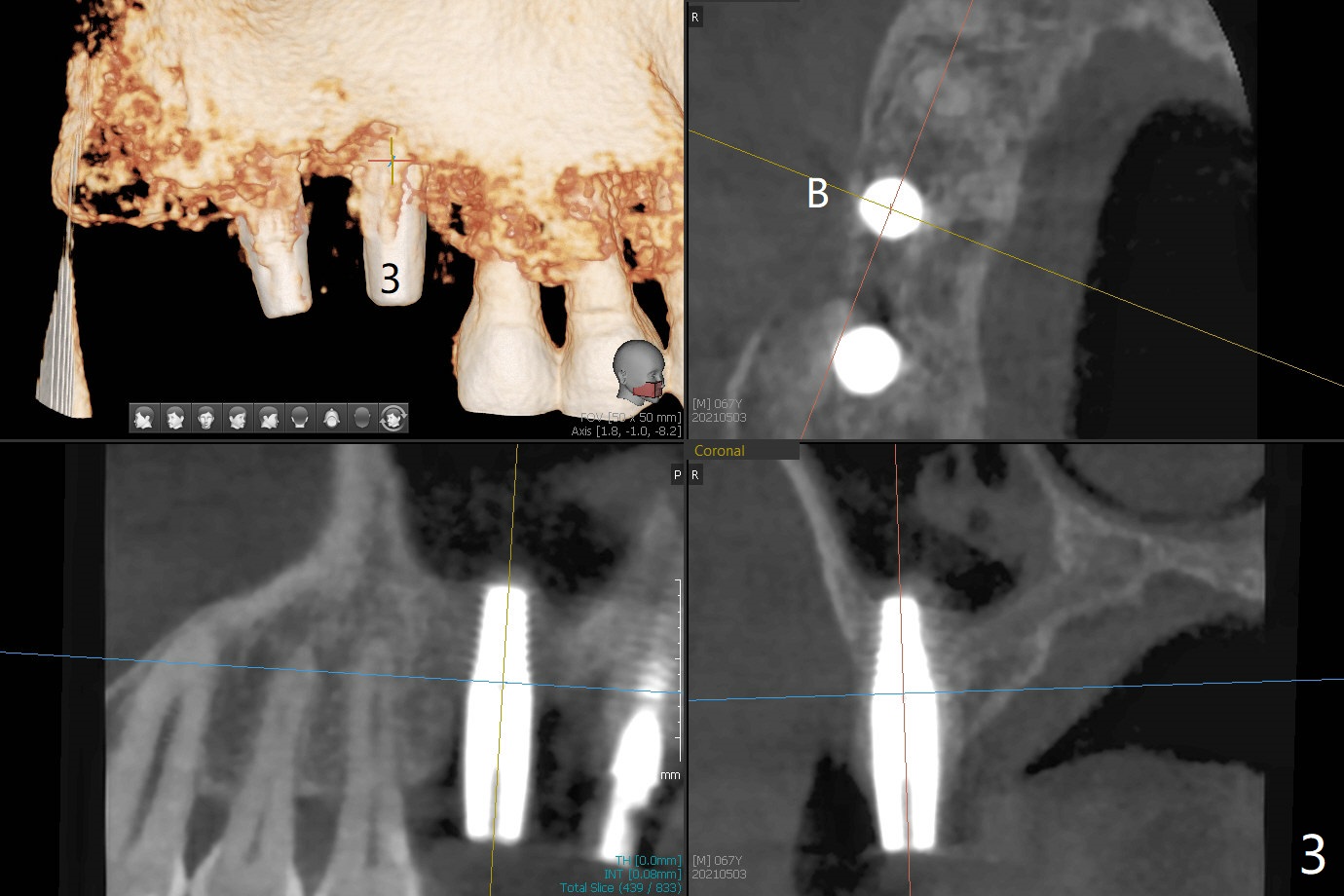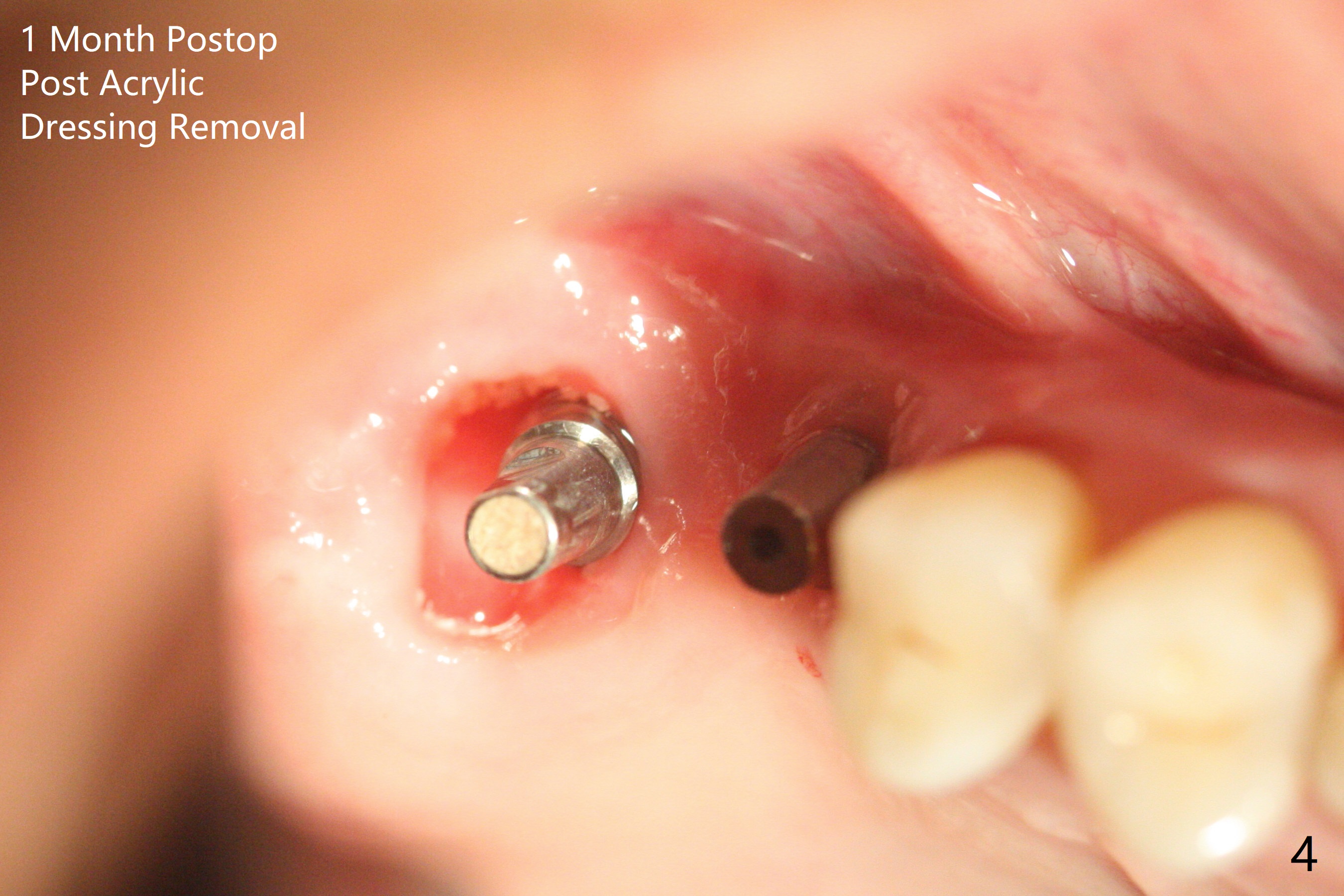 尽管2号牙植体比设计长,上颌窦提升顺利(图一,二)。虽然3号牙植体颊侧仍有骨质(图三:B),由于近中骨质多,徒手植入时植体远中偏移(图一:红箭头)。术后一个月树脂敷料撤除,2号牙牙槽窝,3号牙伤口愈合(图四)。