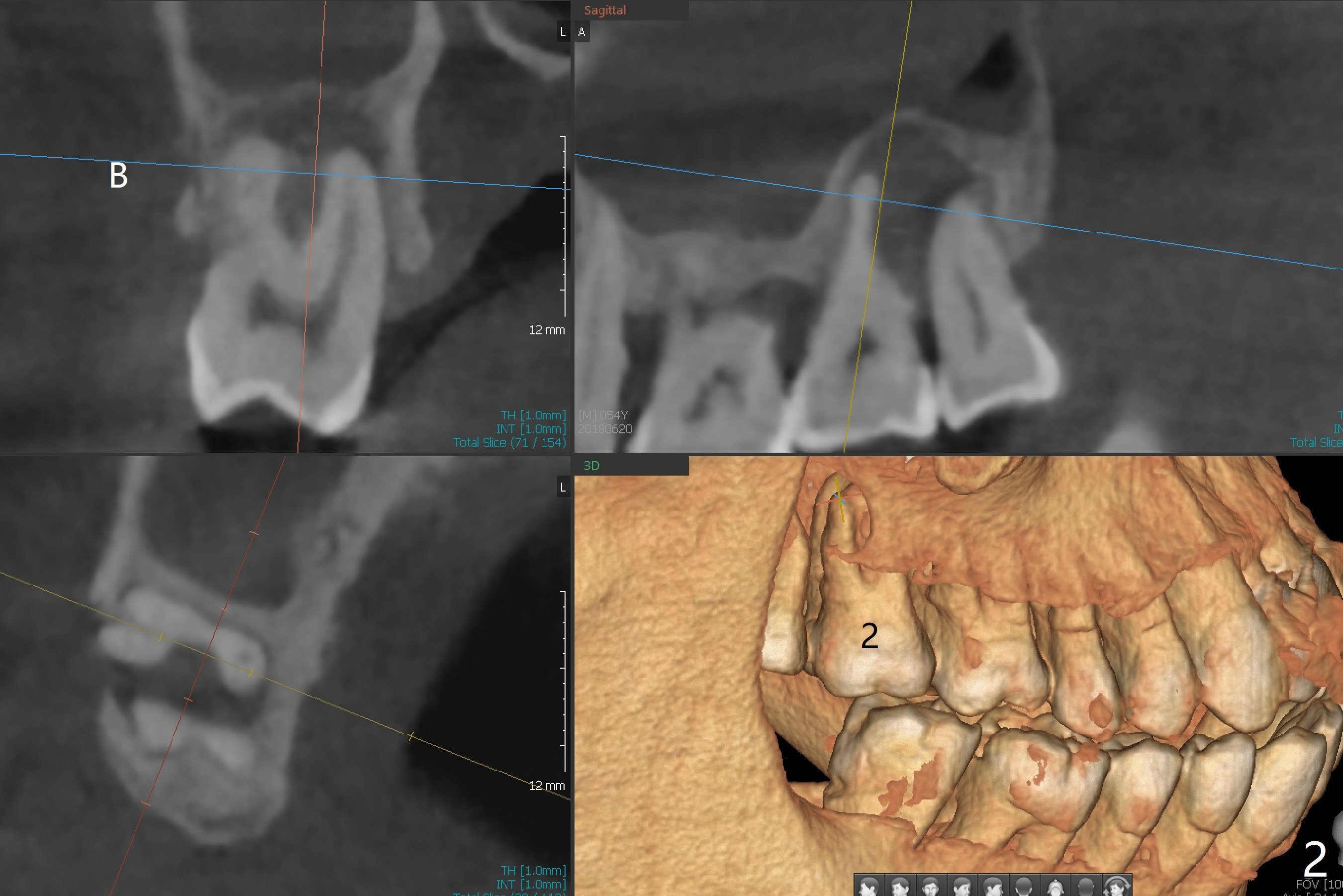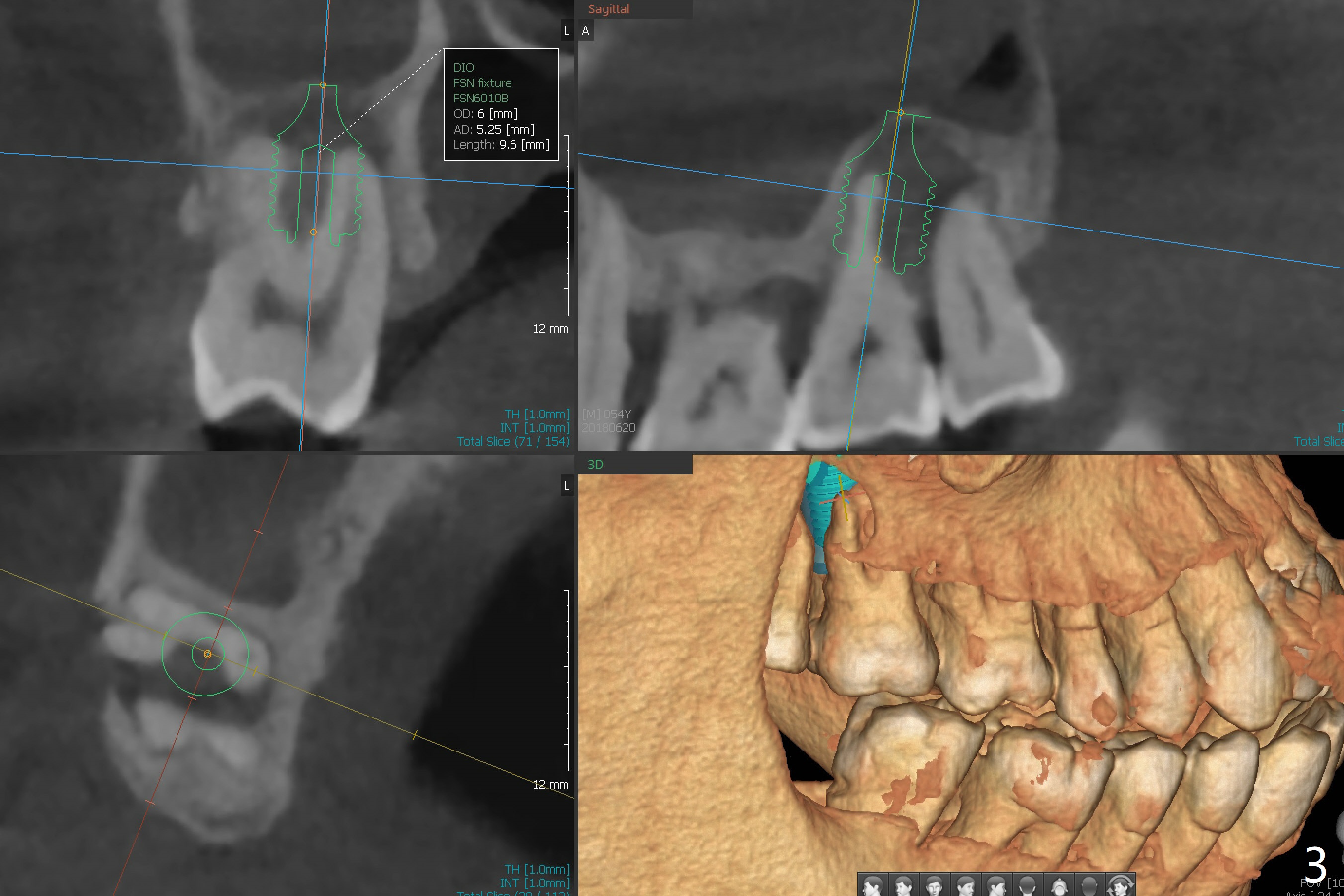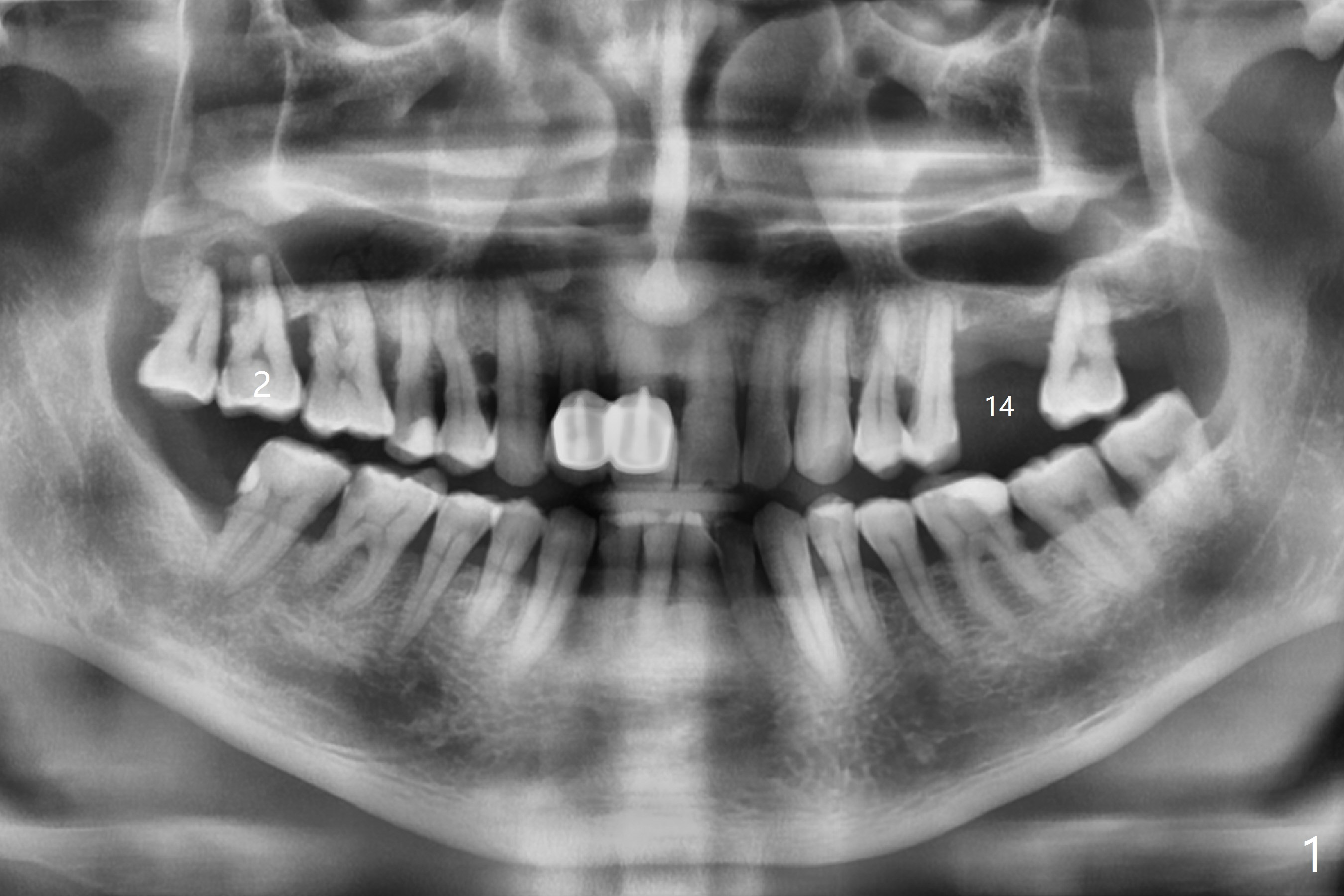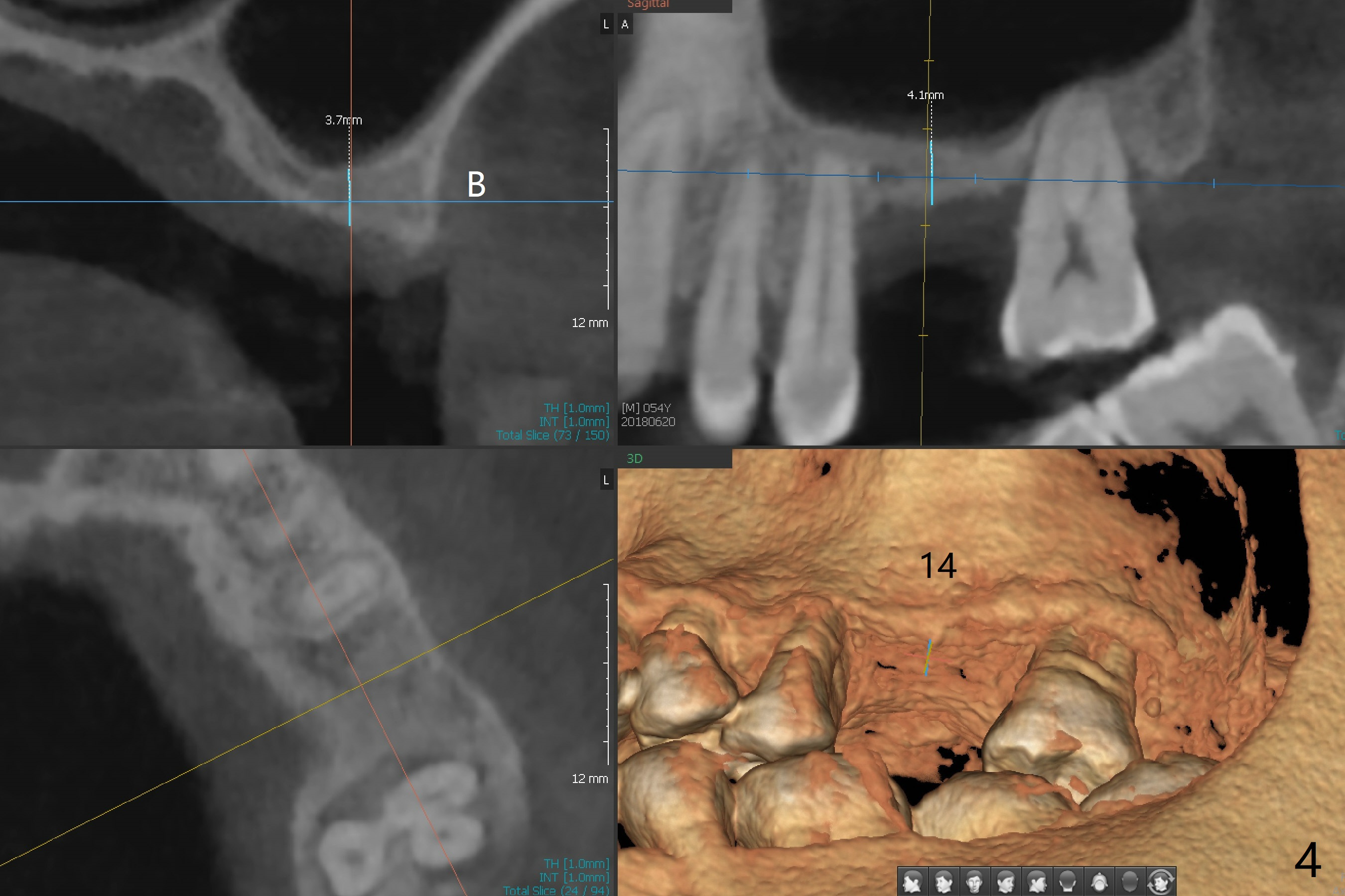 A 54-year-old man presents to office with a request to get a tooth back in the upper left posterior region (Fig.1 #14, wearing RPD). Upon examination, he feels that the tooth #2 is mobile, requiring more urgent care (Fig.2). The infection also involves the tooth #1. Extraction of the latter seems to be imminent. At either site, bone height is limited. Sinus lift is expected with PRF. Place an implant that just passes the sinus floor for stability, e.g., 5-6x10 mm at #2 (Fig.3), but not too long into the sinus. At the 2nd stage (Fig.4), use Magic drill with 2 mm stopper as a tissue punch. Then with 3 mm stopper start osteotomy, followed by Magic lifter, PRF/bone graft and dummy implant or tap. More bone graft and definitive implant. In fact the patient wants to have #14 implant first.