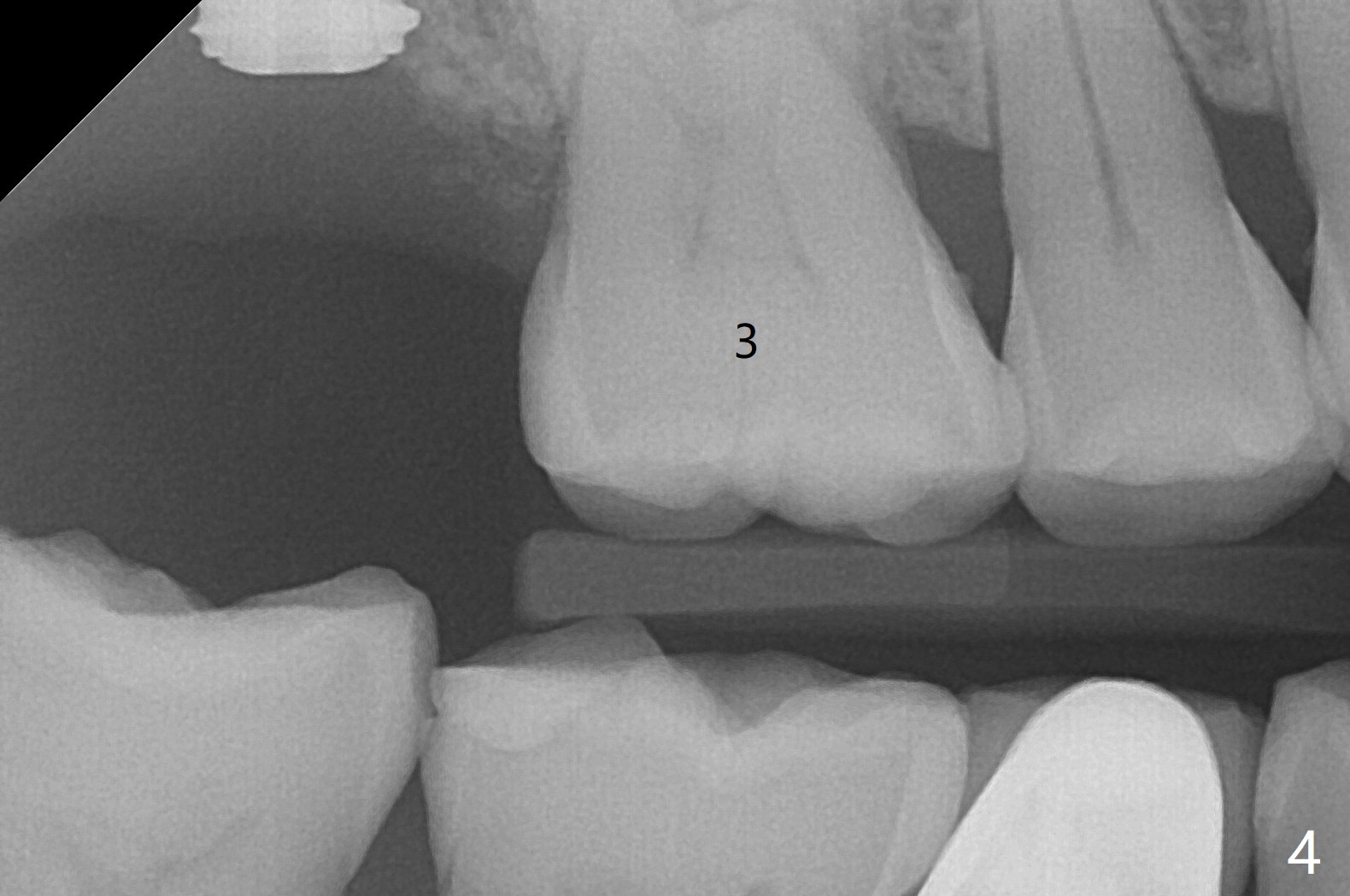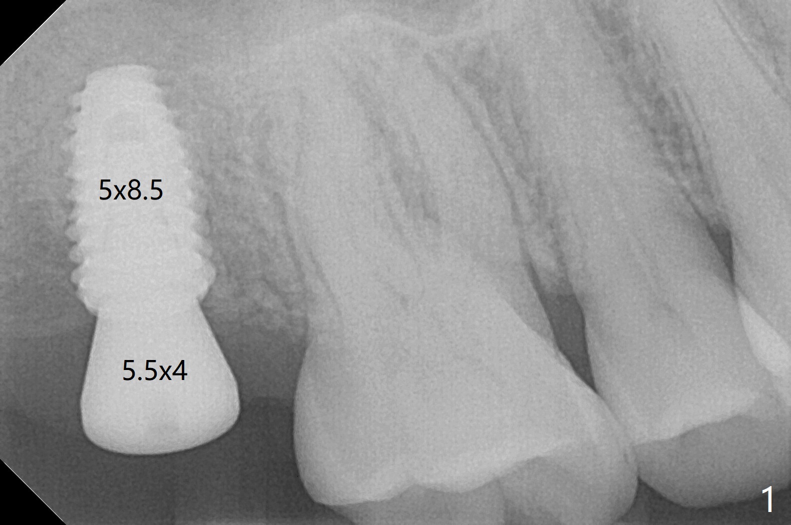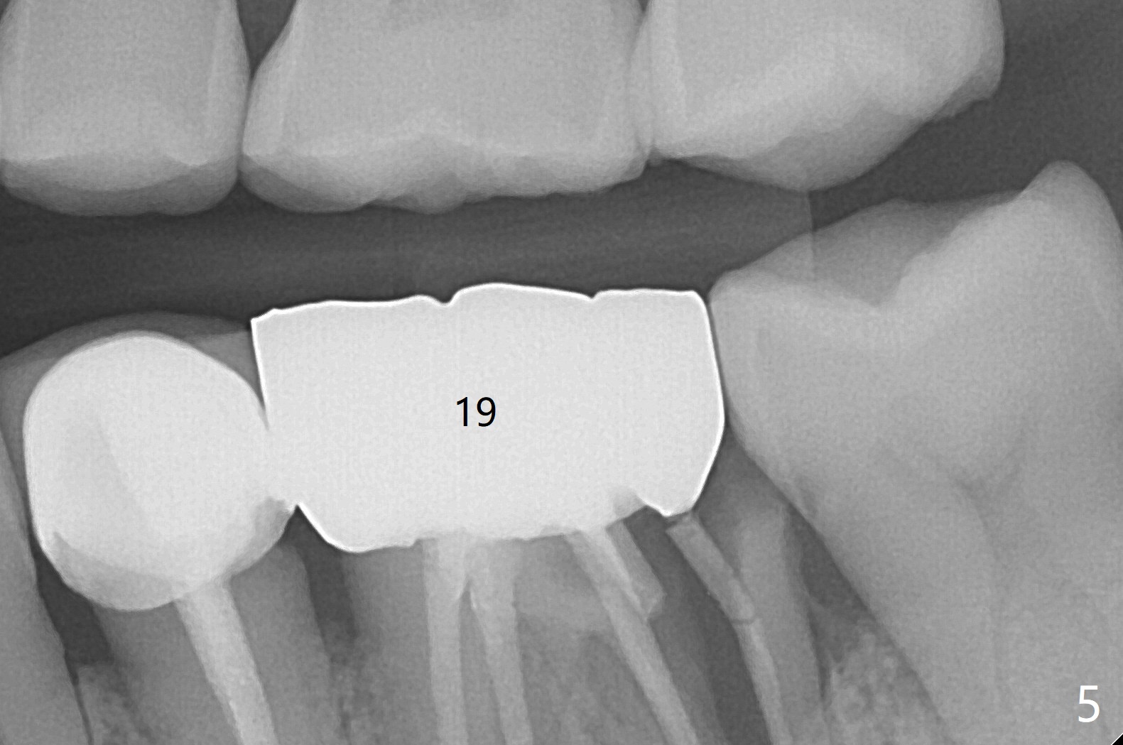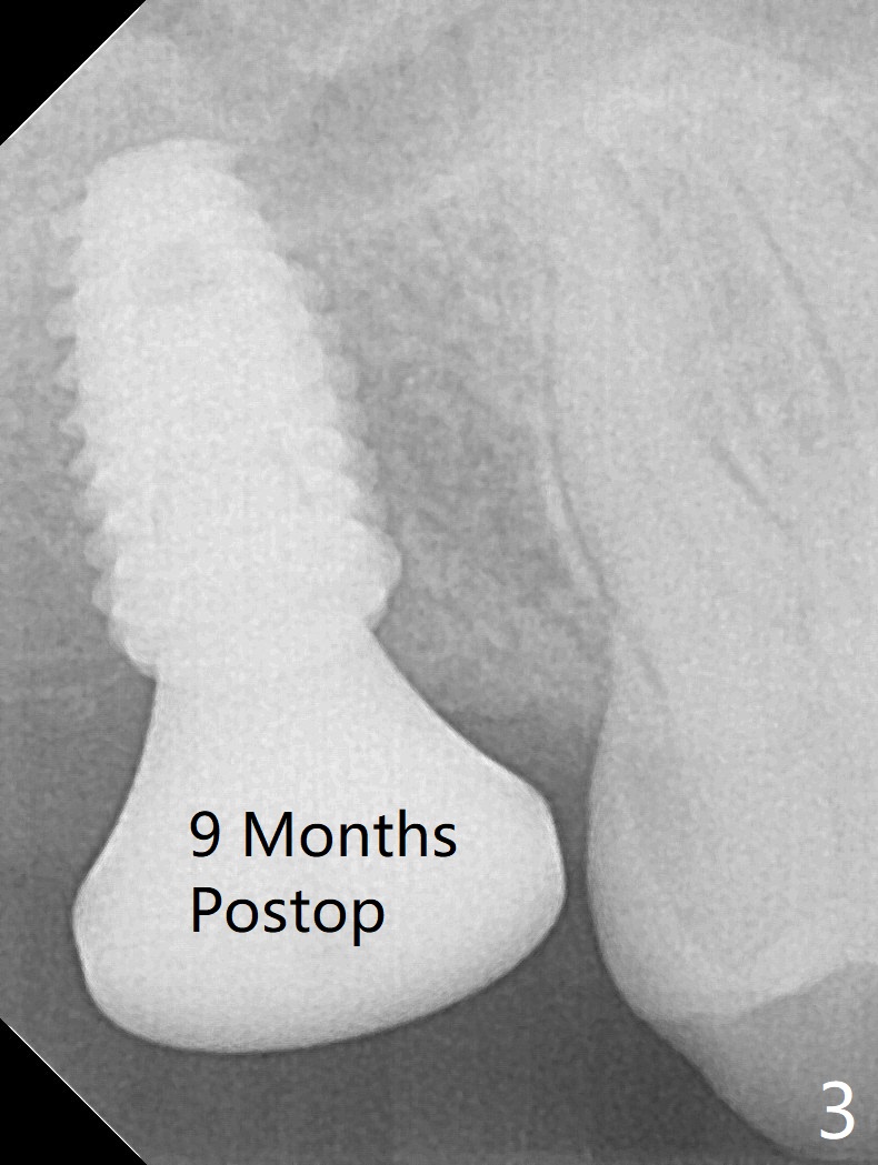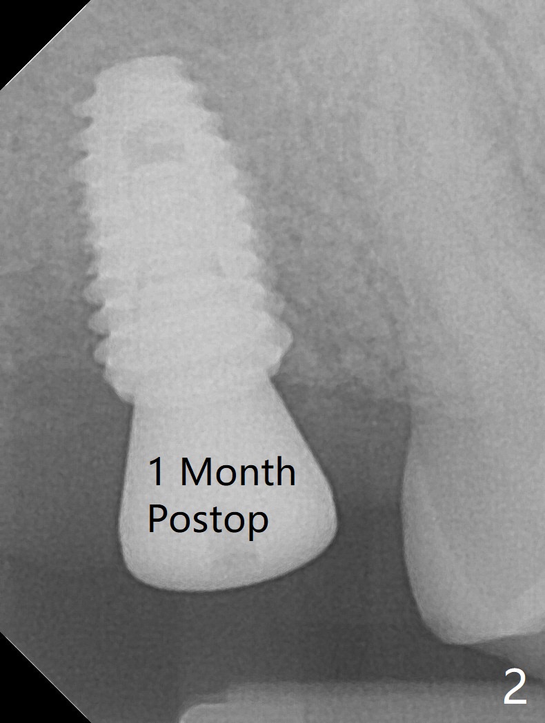 In spite of underprep (4.0x8.5 mm last drill), a 5x8.5 mm implant is placed at #2 with insertion torque ~ 15 Ncm (Fig.1). In addition to the large defect post implant removal with 4.5 month bone graft, he is a heavy gagger with limited mouth opening. Drill cylinders may not engage the metal sleeve precisely. A 5.5x4 mm healing abutment is placed with low emergency profile. The procedure, although difficult, finishes in a timely manner. Otherwise it would be a disaster for the patient and operator. PA taken 1 month postop shows slightly subcrestal placement (Fig.2). When a cemented abutment is placed 4 months postop, there is tenderness. In fact the implant is mobile. A 8x5 mm healing abutment is placed. Nine months postop, the implant remains slightly mobile (Fig.3); a healing screw is placed. The tooth #3 has sign and symptom of crack 13 months postop (Fig.4), related to root fracture of #19 (Fig.5, bruxism). In fact the tooth cracks nonsalvageable post RCT, 9 months post #2 healing screw, 21 months postop. Socket preservation will be carried out with sticky bone and PRF, while #2 implant will be uncovered, followed by placement of a short cemented abutment to hold periodontal dressing. Upper Molar Immediate Implant, Trajectory Xin Wei, DDS, PhD, MS 1st edition 11/27/2018, last revision 07/03/2021