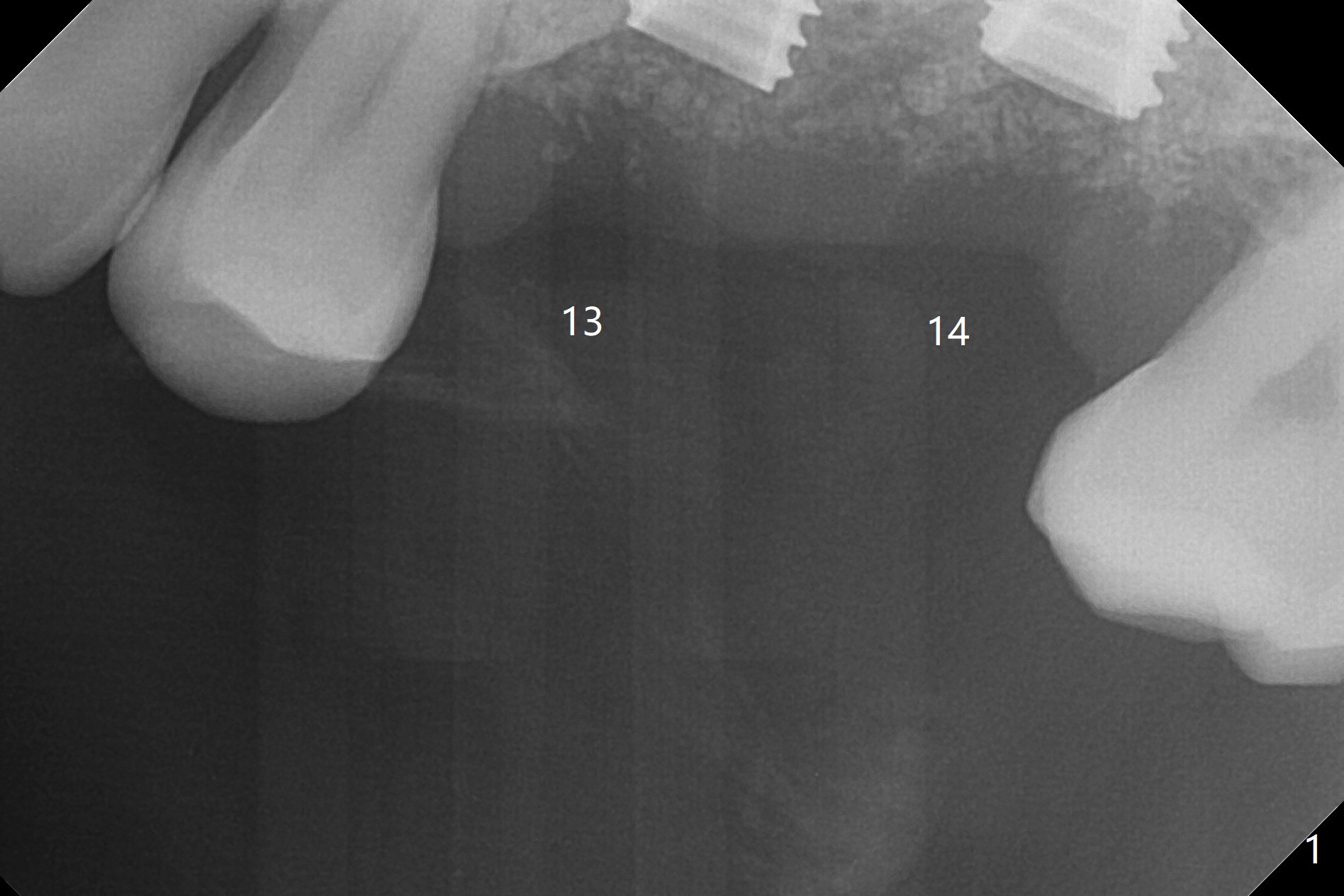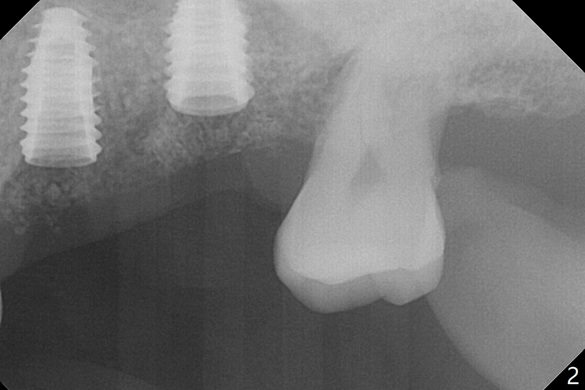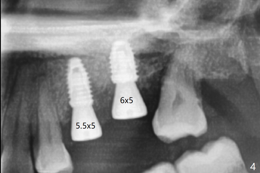 After placement of a 4.5x8.5 mm implant at #13, a vertical anchor pin is used, which is helpful for #14 osteotomy (Fig.1-3). One hand is free. Sinus lift with 2.8 mm reamer is not efficient, since it is difficult to feel stopper. A 5x7.3 mm implant has to be removed from the site of #14 for use of Magic Expanders from 3.0 to 4.3 mm at the depth of 13 mm (gingival level). Autogenous bone harvested from osteotomy is used for sinus lift. It appears that the implants are placed deep; healing abutments with 5 mm cuff are placed (Fig.4 (extraoral bitewing)).