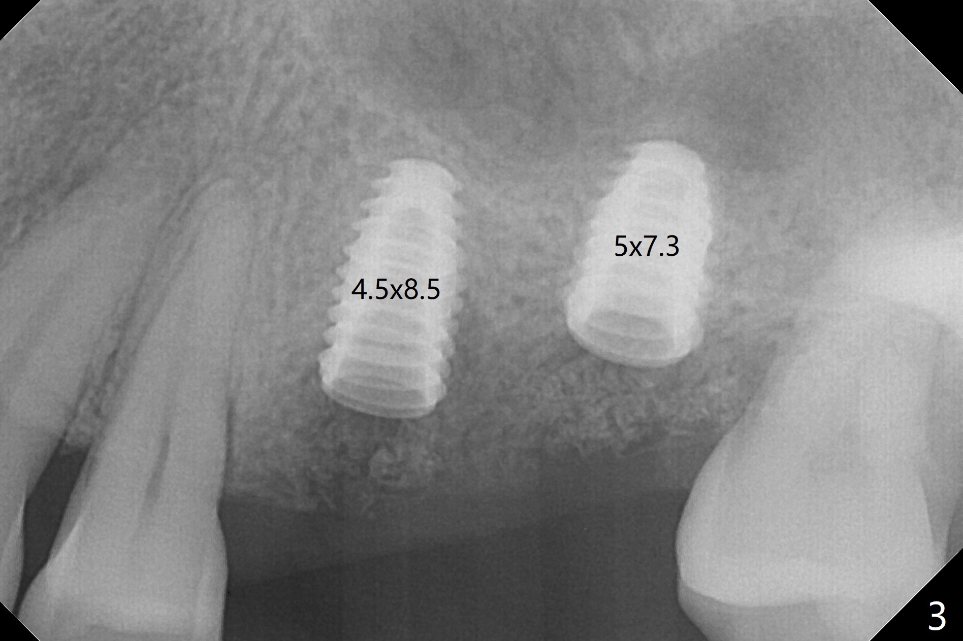 The existing guide will be reused to start osteotomy with point drill with 2 O-rings and 2.2x7.3 mm drill with 3 O-ring, followed by 5x5 cm CT with a parallel pin from Bicon kit. Bone expanders #3 and 4 (1.7/3.1 and 2.4/3.7) will be used slowly with depth control. Dummy implants (4.0 and 4.5x10 mm) will be placed for further expansion before placement of bone graft and a 5x7.3 mm definitive implant.