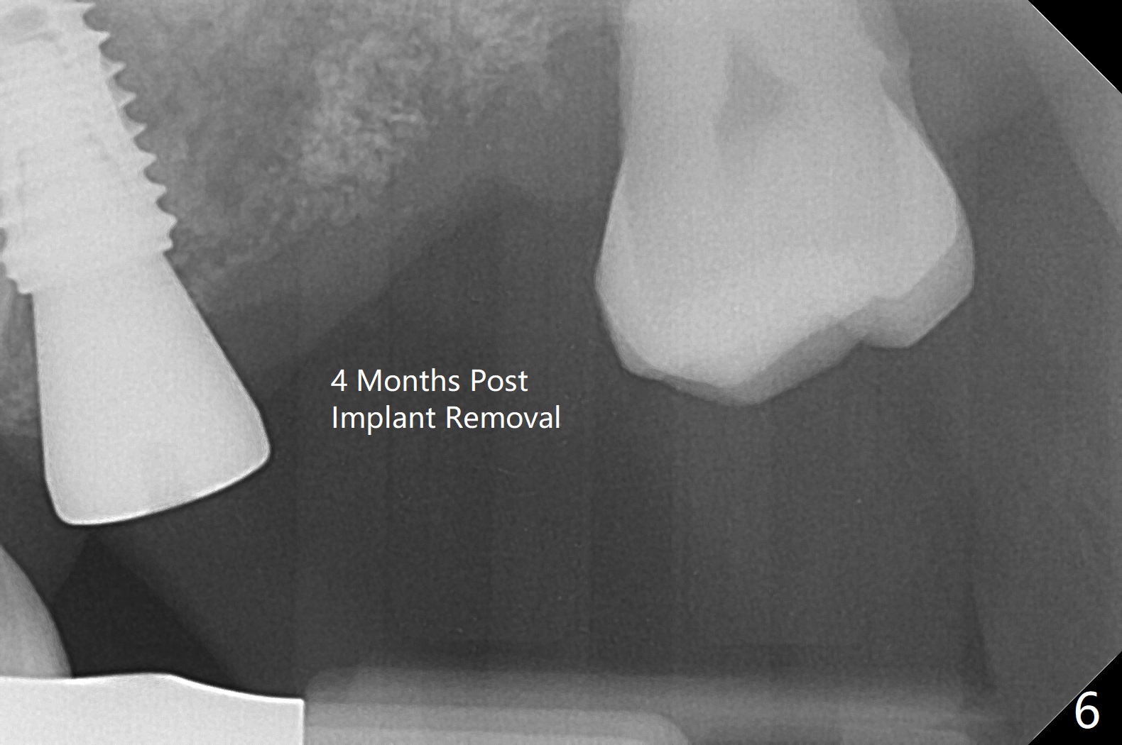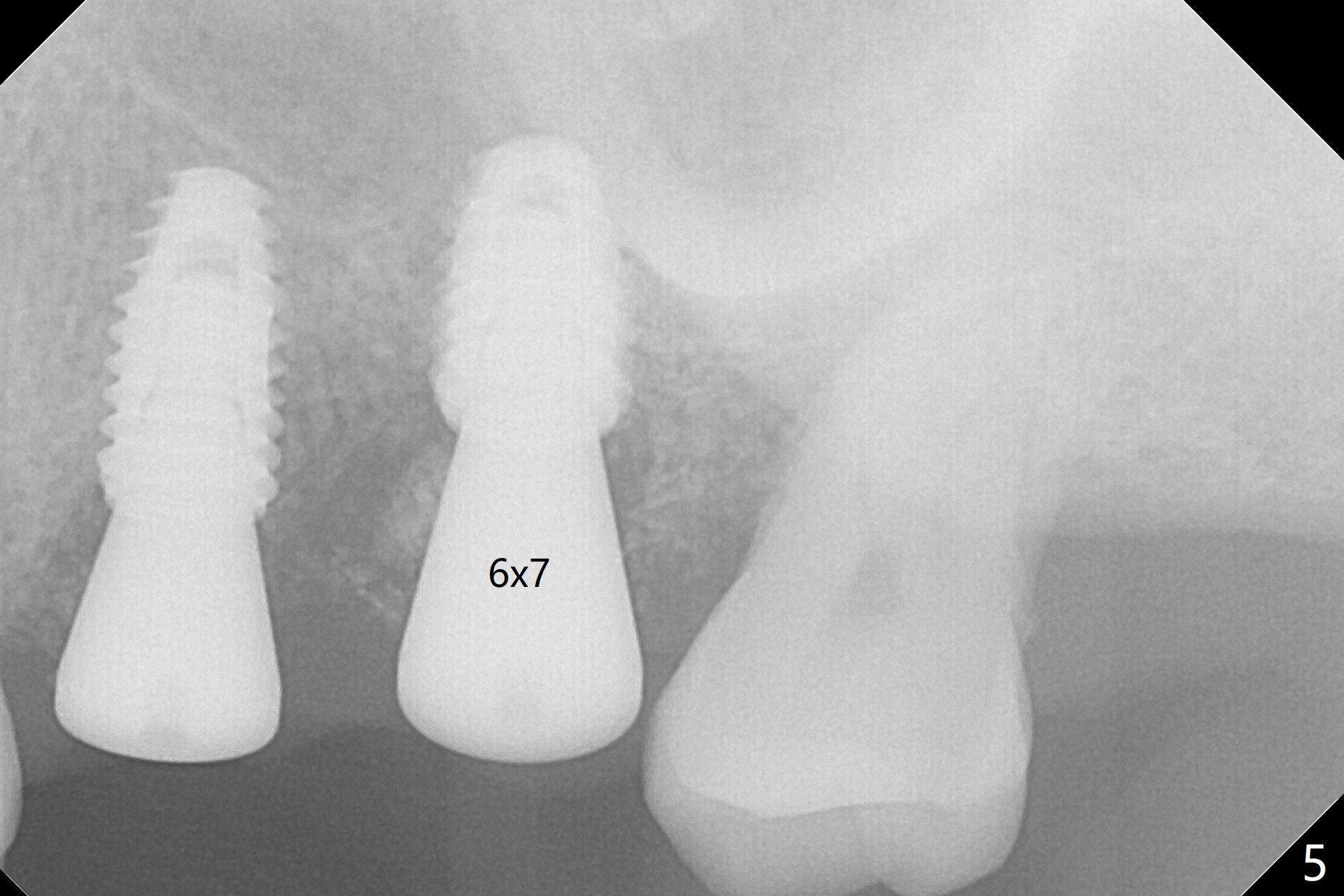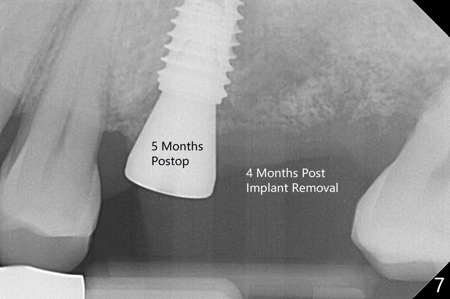 Six days later, "pain is less". Percussion of #13 healing abutment causes headache. There is no mobility at #13 or 14. The buccal gingiva is severely erythematous and edematous at #14. Chlorhexidine irrigation is conducted. After removal of the slightly subgingival healing abutment without pain, a 6x7 mm one is placed with severe pain. After local anesthesia, the implant seems to be mobile. The new abutment is advanced ~ 1 mm (Fig.5). Augmentin is prescribed. One week later there is no sign or symptom of infection. It appears that Augmentin should be prescribed after sinus surgery. The implant at #14 is removed with bone graft 1 month post placement. The graft appears to heal 4 months post implant placement (Fig.6,7 (5 months post placement at #13)).
