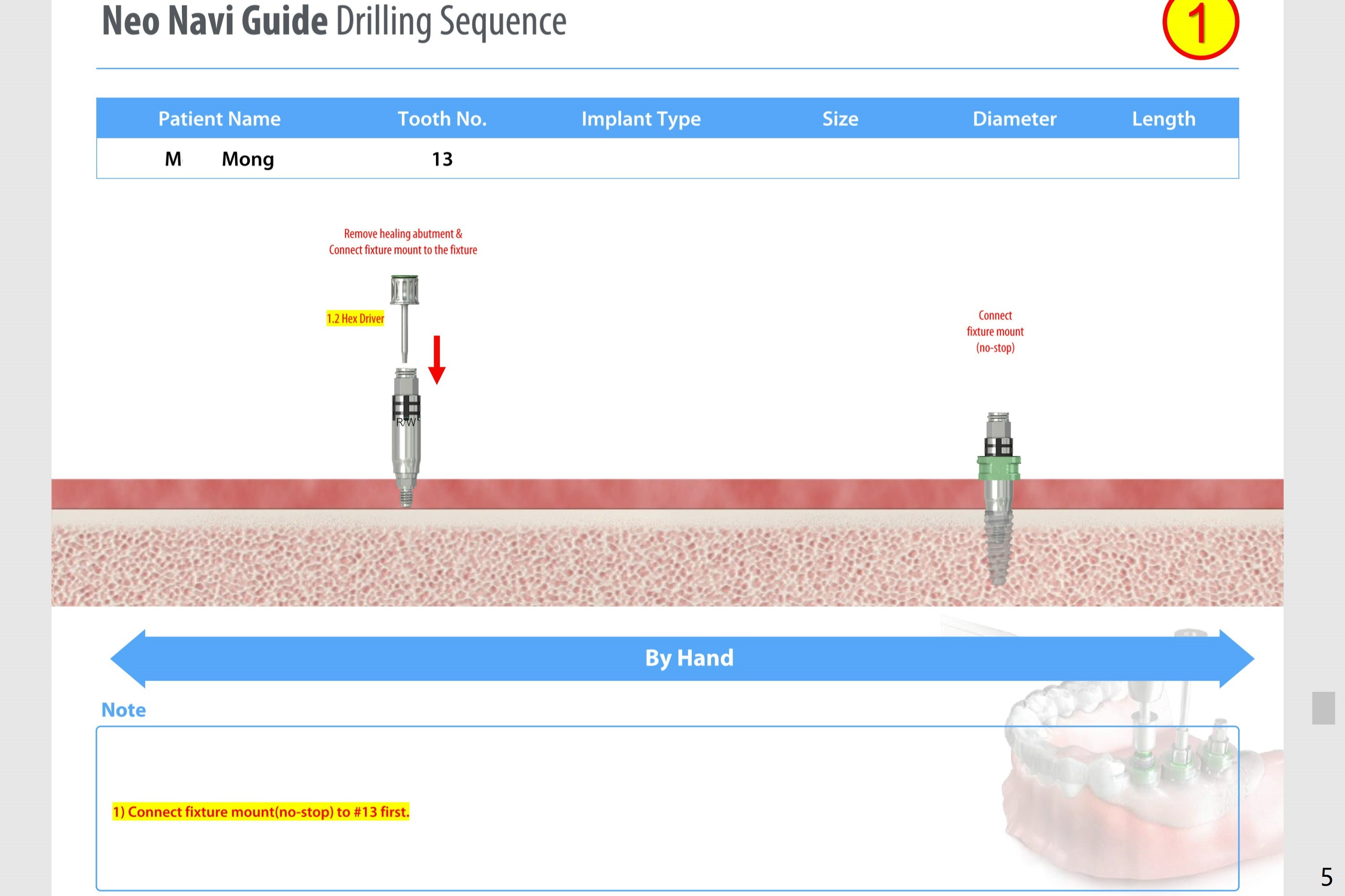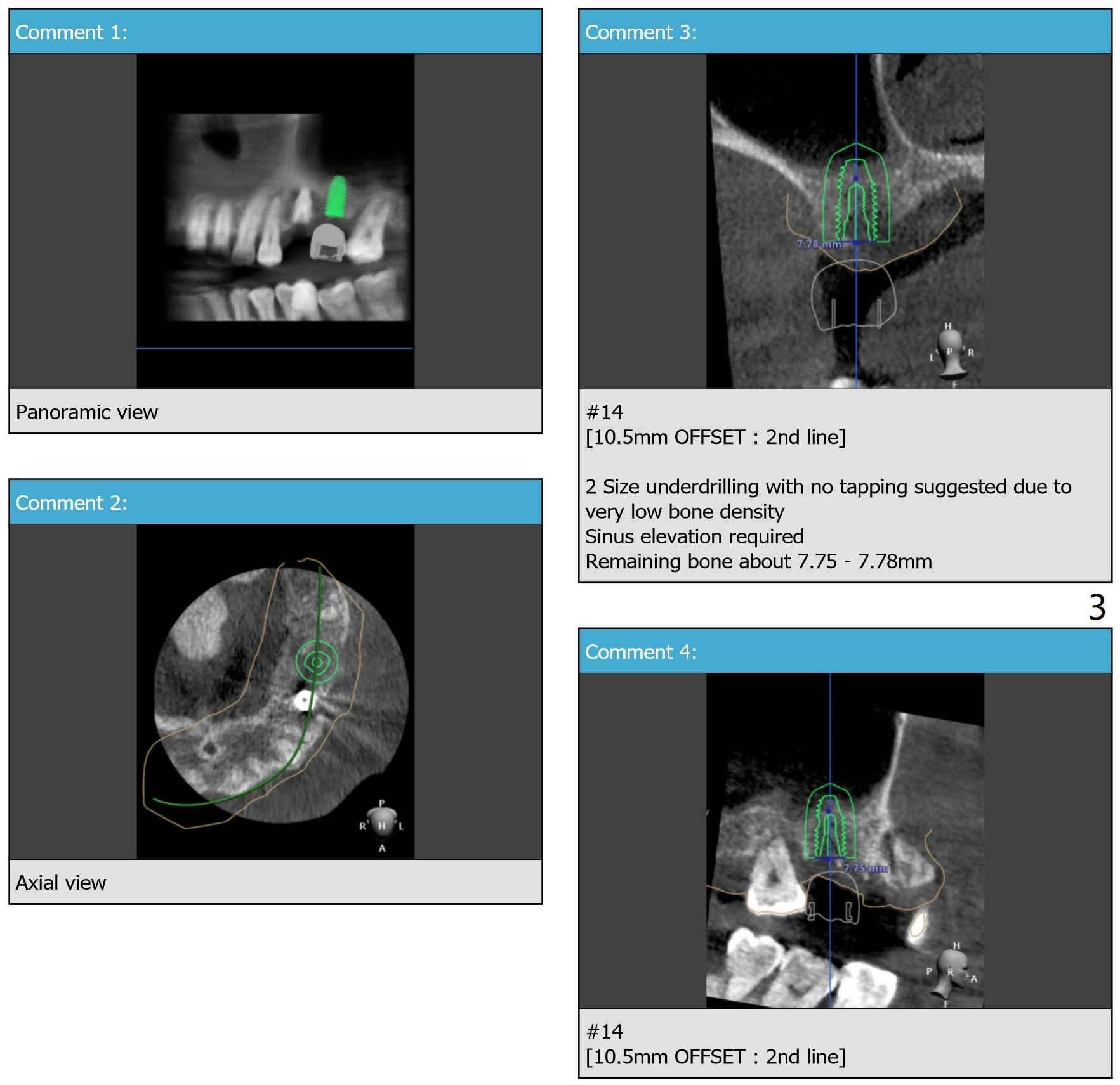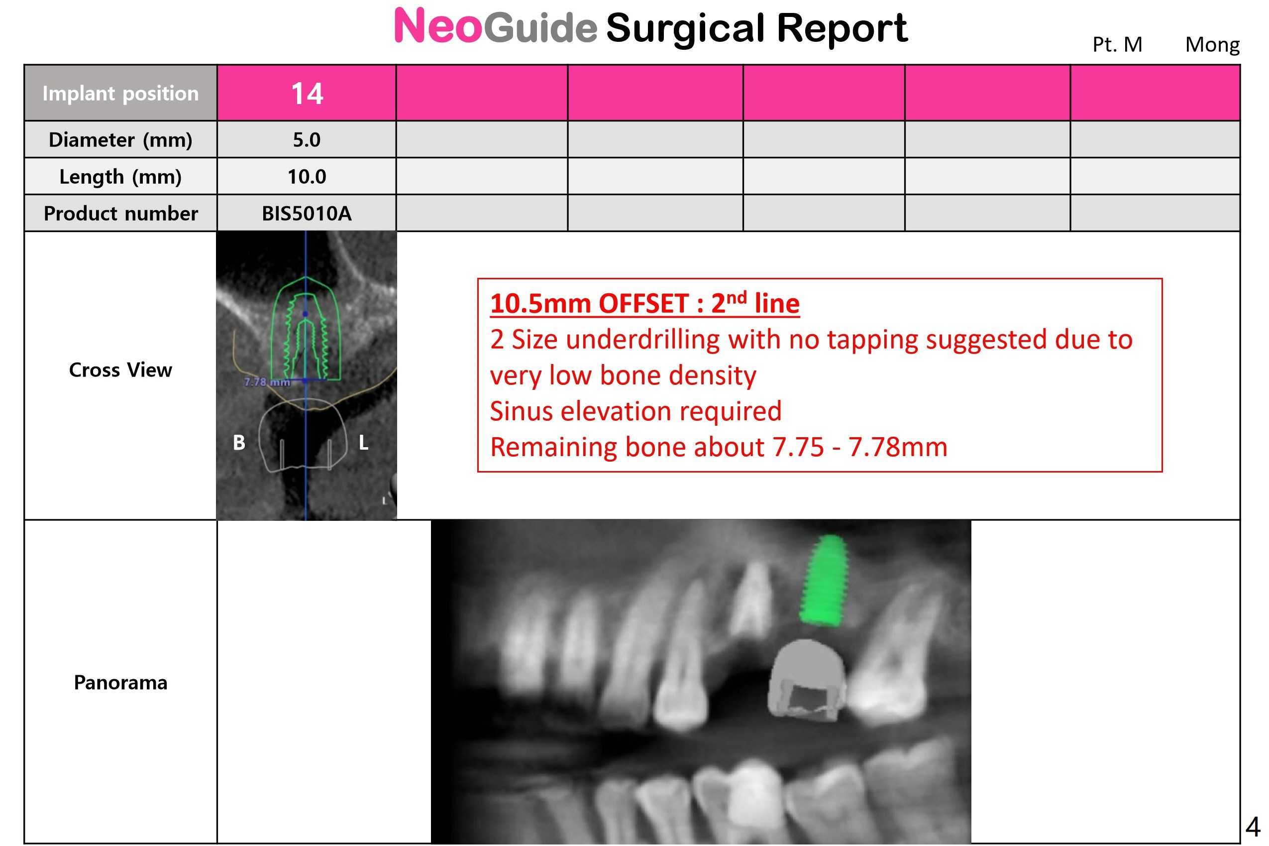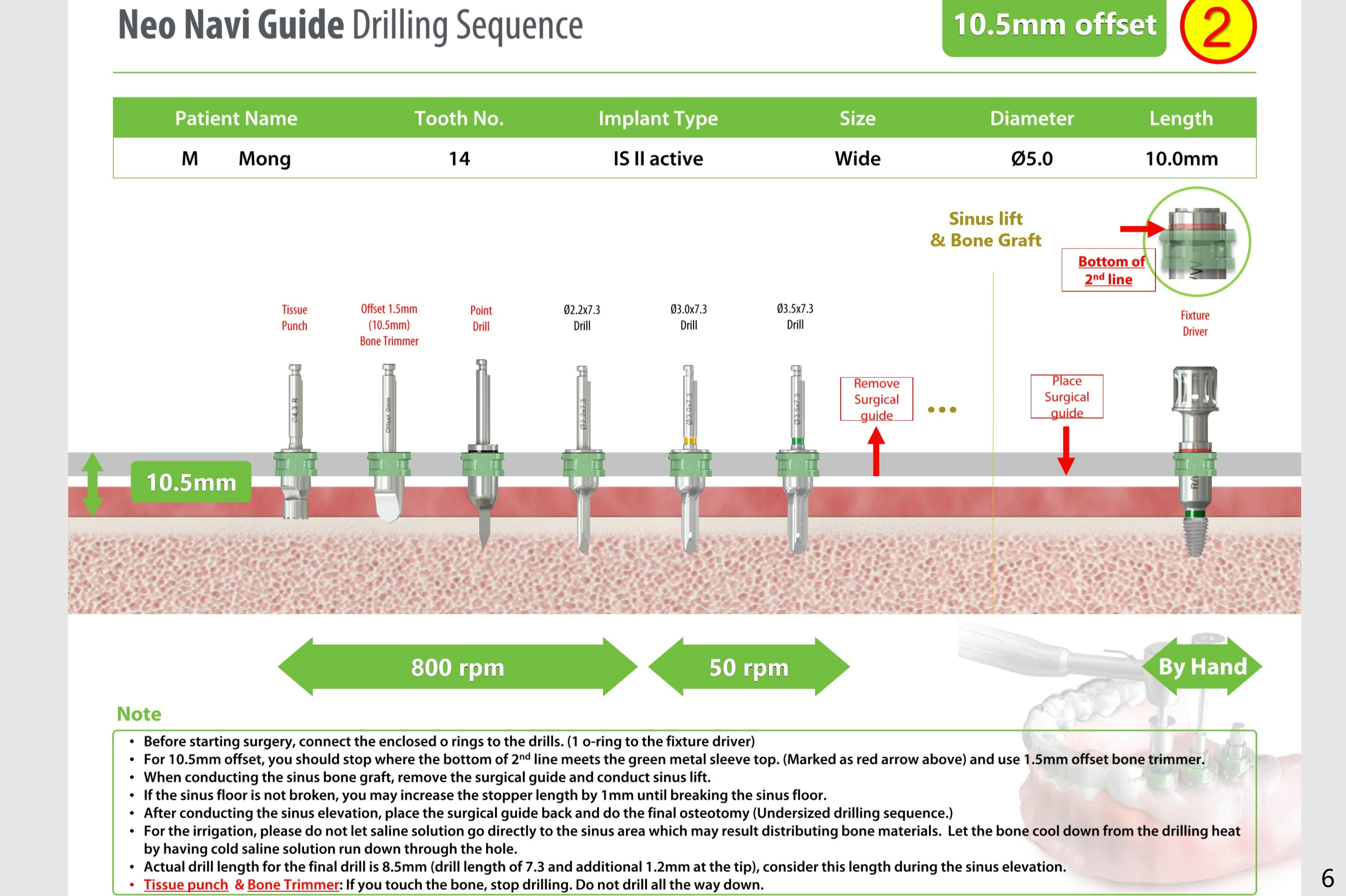 Since bone density is low 3 months post 2nd loss, under drilling, sinus lift for a longer implant (7.3 vs. 10 mm) and PRFx2 are required. One for sinus lift, the other for wound closure (prepare suture). If primary stability is low, no healing abutment is used. Prepare 4 and 4.5x10 dummy implants for sinus lift.
