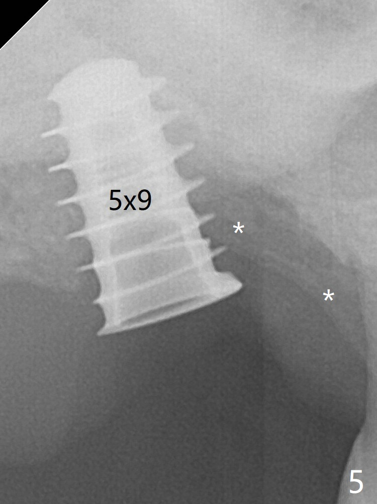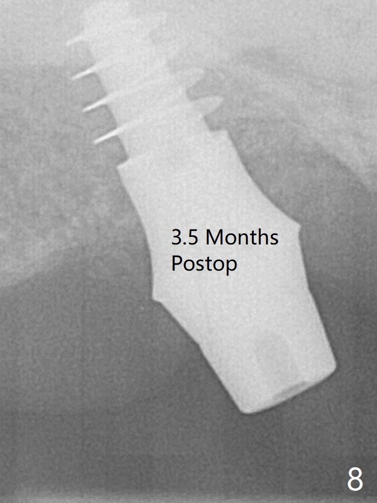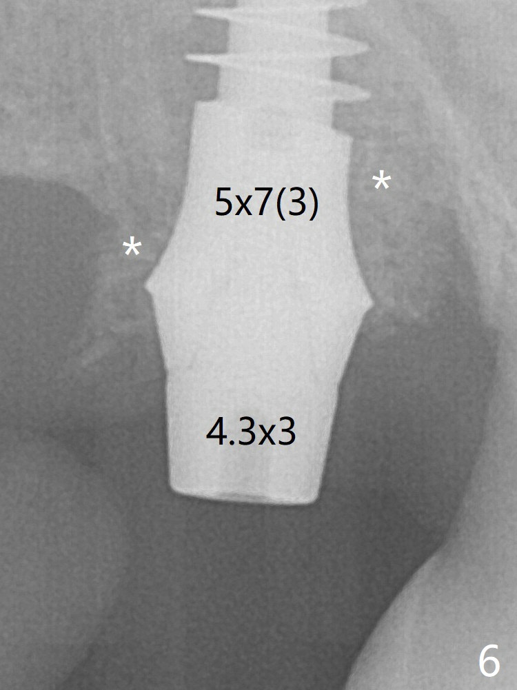 Trajectory is found to be off when 5x9 mm dummy FC implant is placed with stability (Fig.5 (*: defect)). The final implant, Magicore (5x7(3)mm, >29 Ncm), appears to be placed too deep for restoration (Fig.6,7); a screw retained crown may be a solution. PRF membrane and Vanilla (allograft) are used for sinus lift (no sinus membrane perforation). Following Vanilla graft in the socket gap (Fig.6 *), another piece of PRF membrane is used to cover socket opening. The membrane is fixed in place with suture and periodontal dressing. When a FC implant is placed too deep, a pair abutment with longer cuff will solve the problem. With Magicore, the diameter of abutment is unable to change. The implant seems to have osteointegrated 3.5 months postop (Fig.8). After change to 4.3x5 mm solid abutment and mesial surface adjustment, impression is taken for early loading because of removal of #14 implant. In fact the patient is satisfied with mastication improvement at #2 later on.