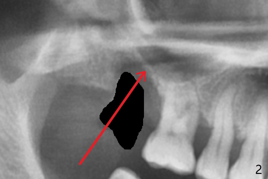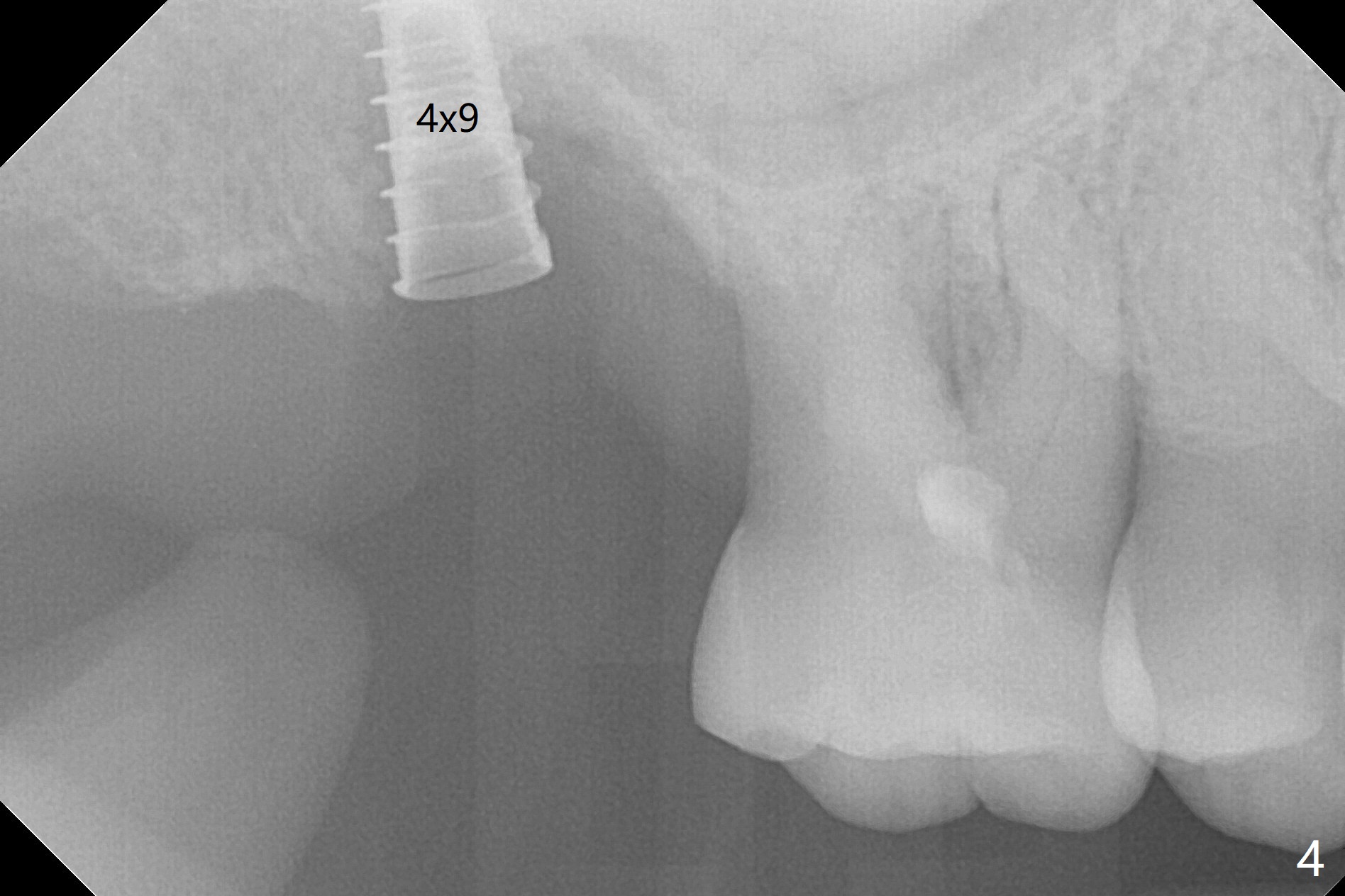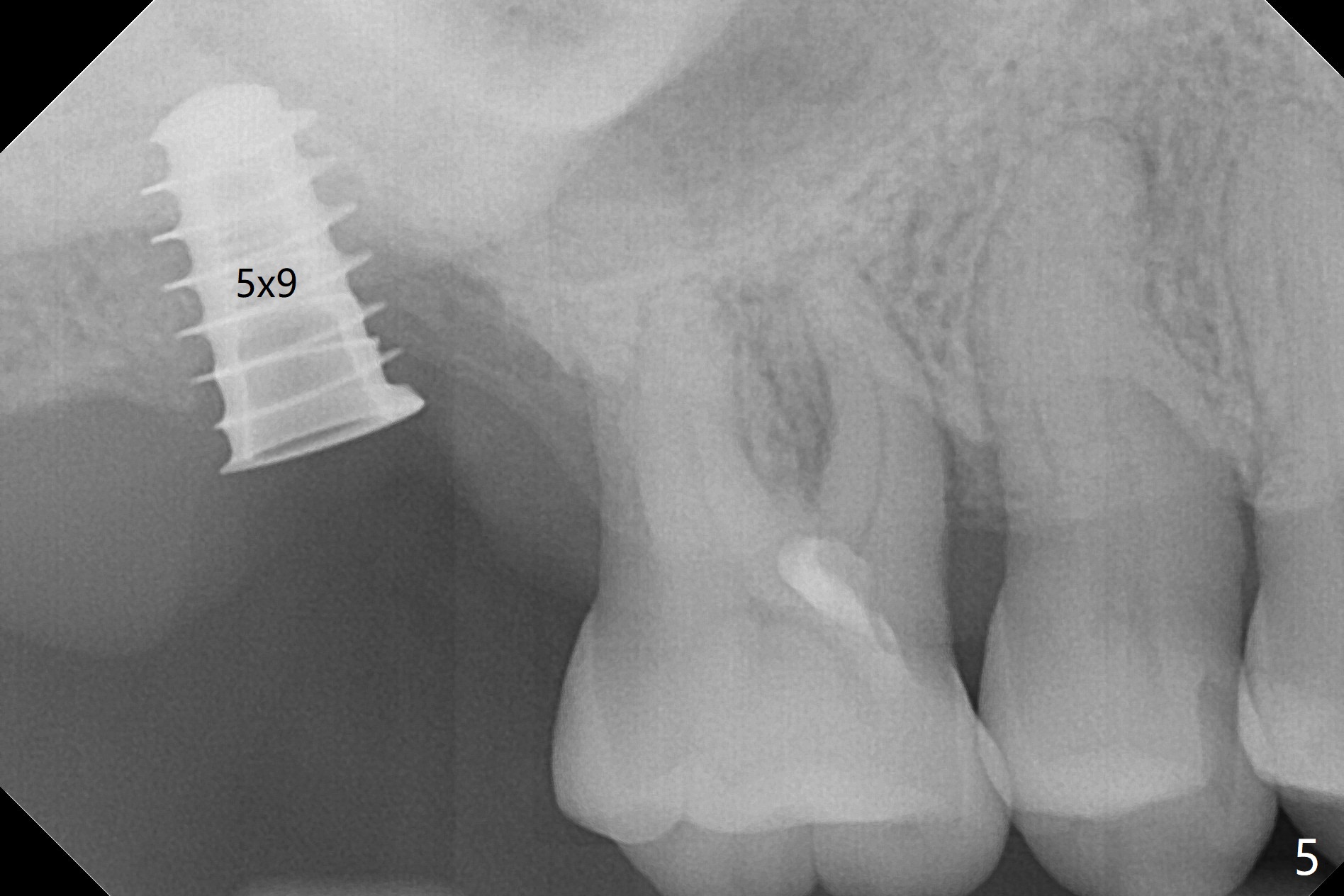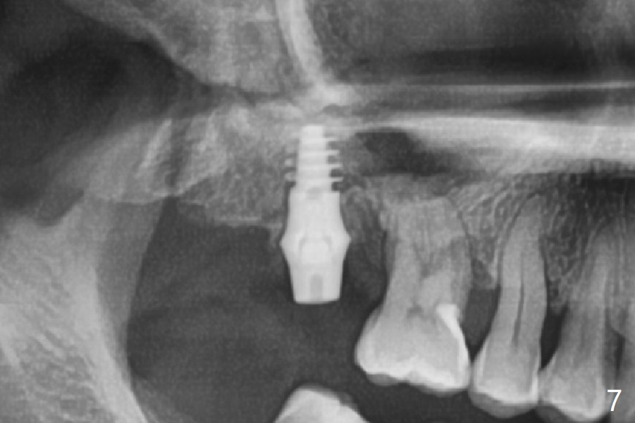 After extraction of the tooth #2 (Fig.1), osteotomy is supposed to be initiated in the mesial slope (Fig.2 arrow). With Magic Expanders (3-4.8 mm), osteotomy ends up in the bottom of the socket (Fig.3). Trajectory is found to be off when 4x9 and 5x9 mm dummy FC implants are placed with stability (Fig.4,5). The final implant, Magicore (5x7(3)mm, >29 Ncm), appears to be placed too deep for restoration (Fig.6,7); a screw retained crown may be a solution. PRF membrane and Vanilla (allograft) are used for sinus lift (no sinus membrane perforation). Following Vanilla graft in the socket gap (Fig.6 *), another piece of PRF membrane is used to cover socket opening. The membrane is fixed in place with suture and periodontal dressing. The implant seems to have osteointegrated 3.5 months postop (Fig.8). After change to 4.3x5 mm solid abutment and mesial surface adjustment, impression is taken for early loading because of removal of #14 implant. In fact the patient is satisfied with mastication improvement at #2 later on.