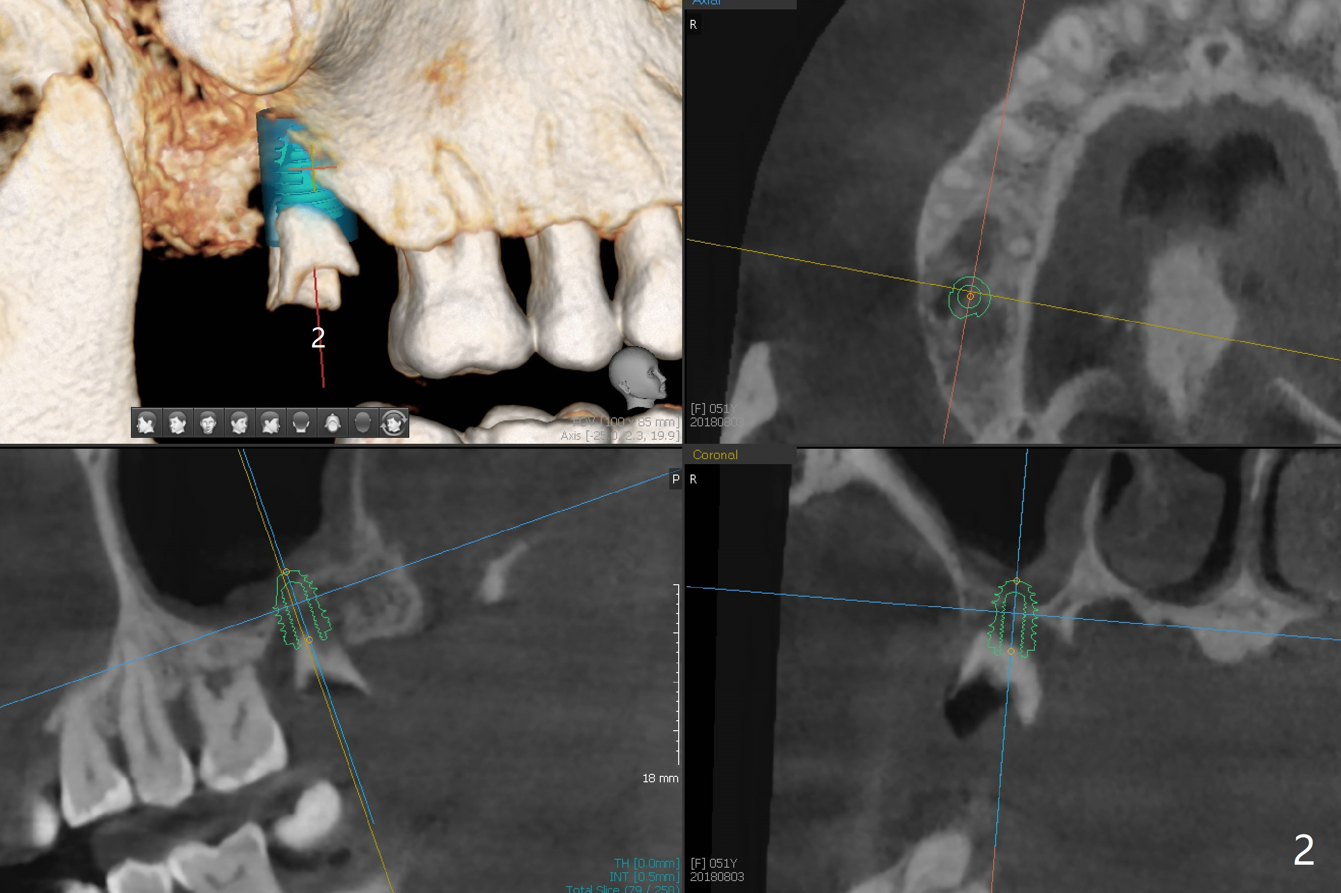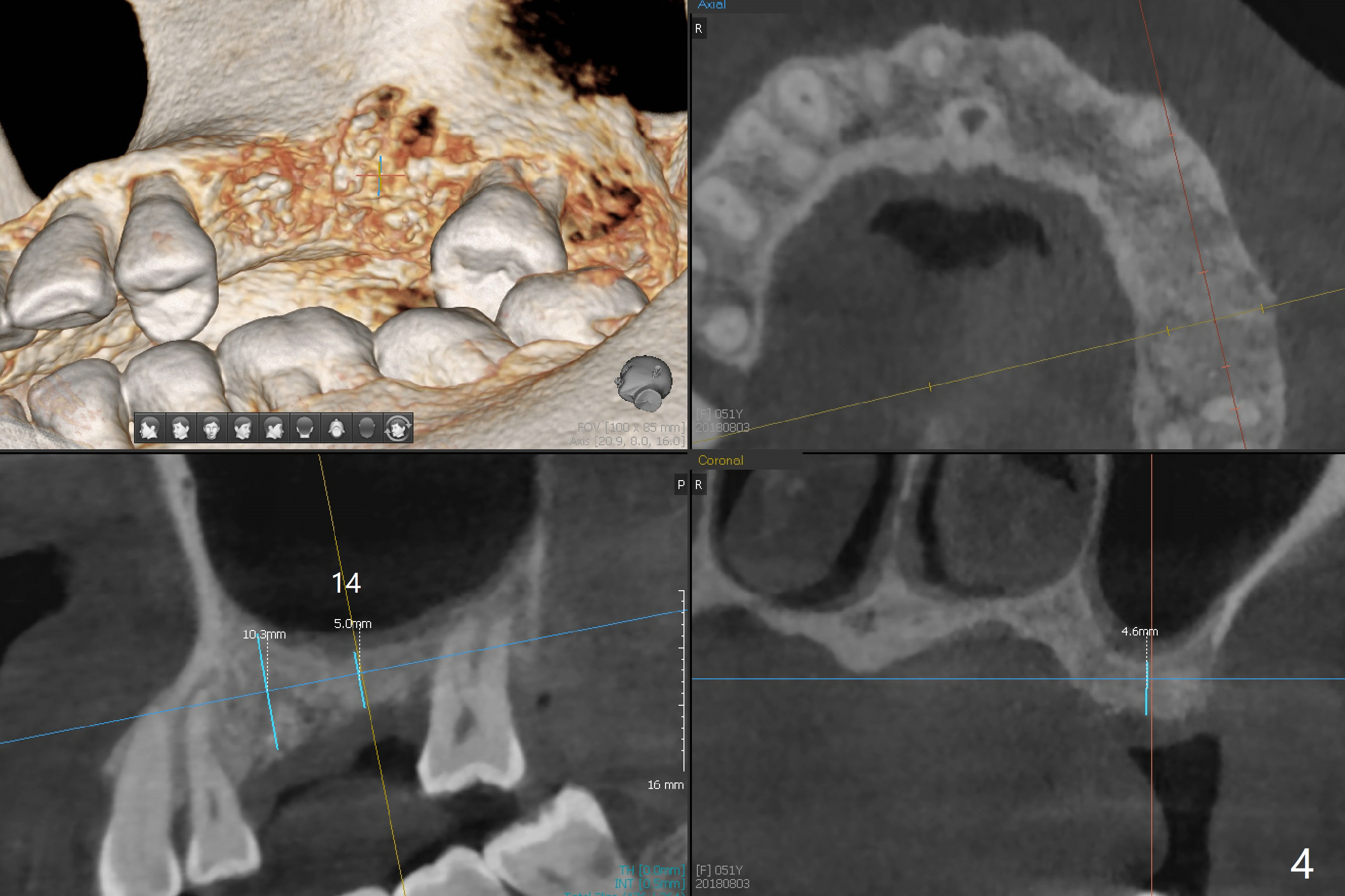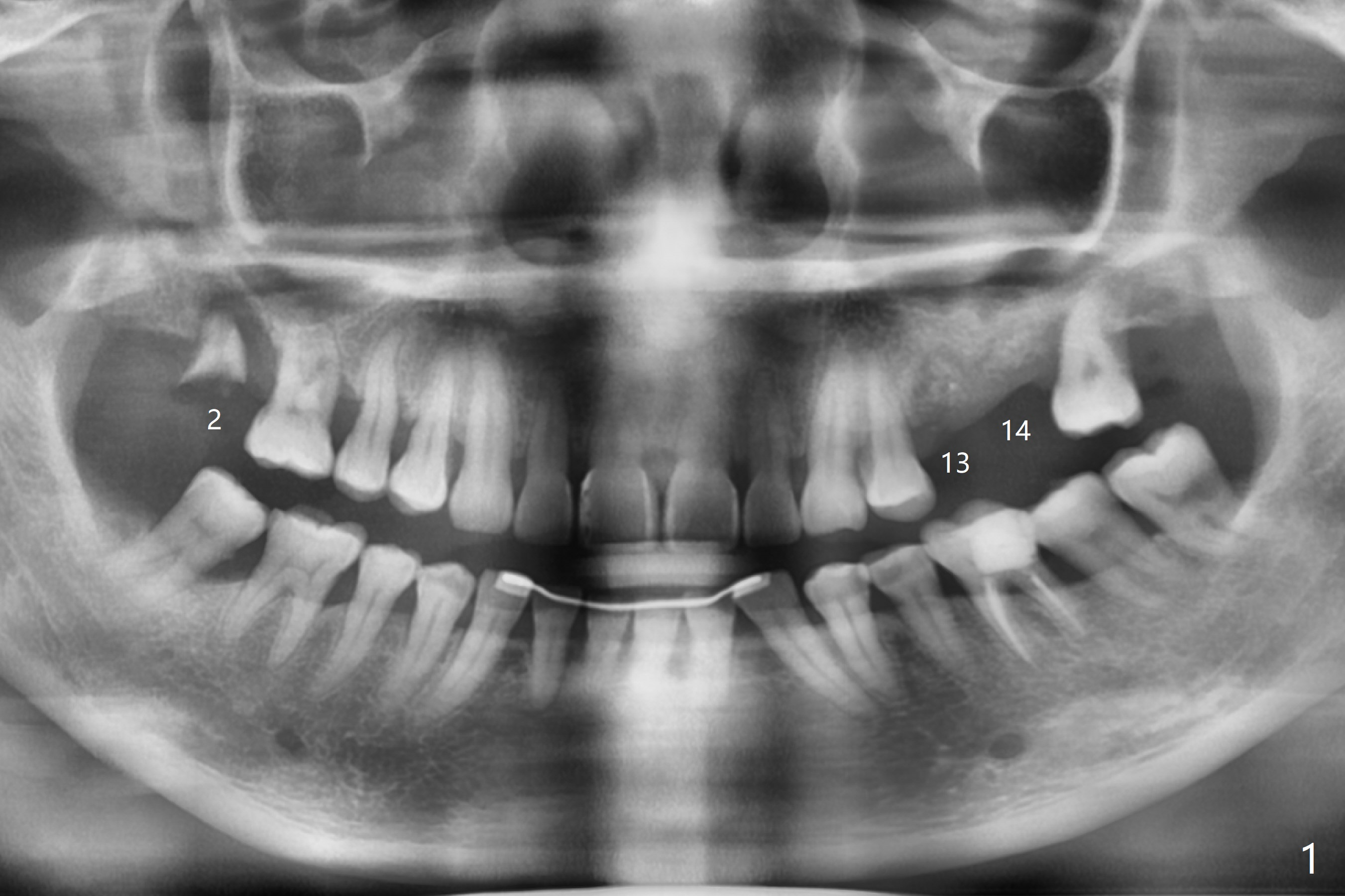 A 51-year-old woman with apparent chronic periodontitis (Fig.1) has the teeth #13 and 14 extracted with socket preservation in her home country 3 months earlier (Fig.3,4). The bone height associated with the residual roots at #2 is short; a 5x7.3 mm implant seems to be appropriate (Fig.2). Use Magic expanders and sinus lifter. The implant will be Magicore or consistent with those at #13 and 14. Prepare 2 pieces of PRF membrane for sinus lift and buccal defect. Osteotomy at #13 should be palatal (Fig.3 red line instead of blue one) to obtain more of the apical native bone for primary stability. Prescribe Augmentin after sinus lift. Osteotomy at #14 should be a little bit more distal because of the mesial shift of the tooth #15 (Fig.4). Early provisional to hold the edentulous space and limited ortho may be required. A guide will be made for #13 and 14.