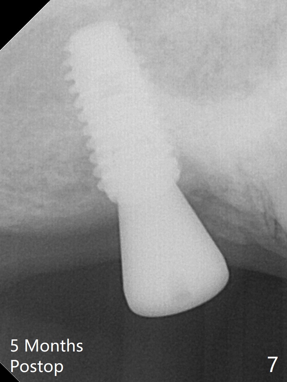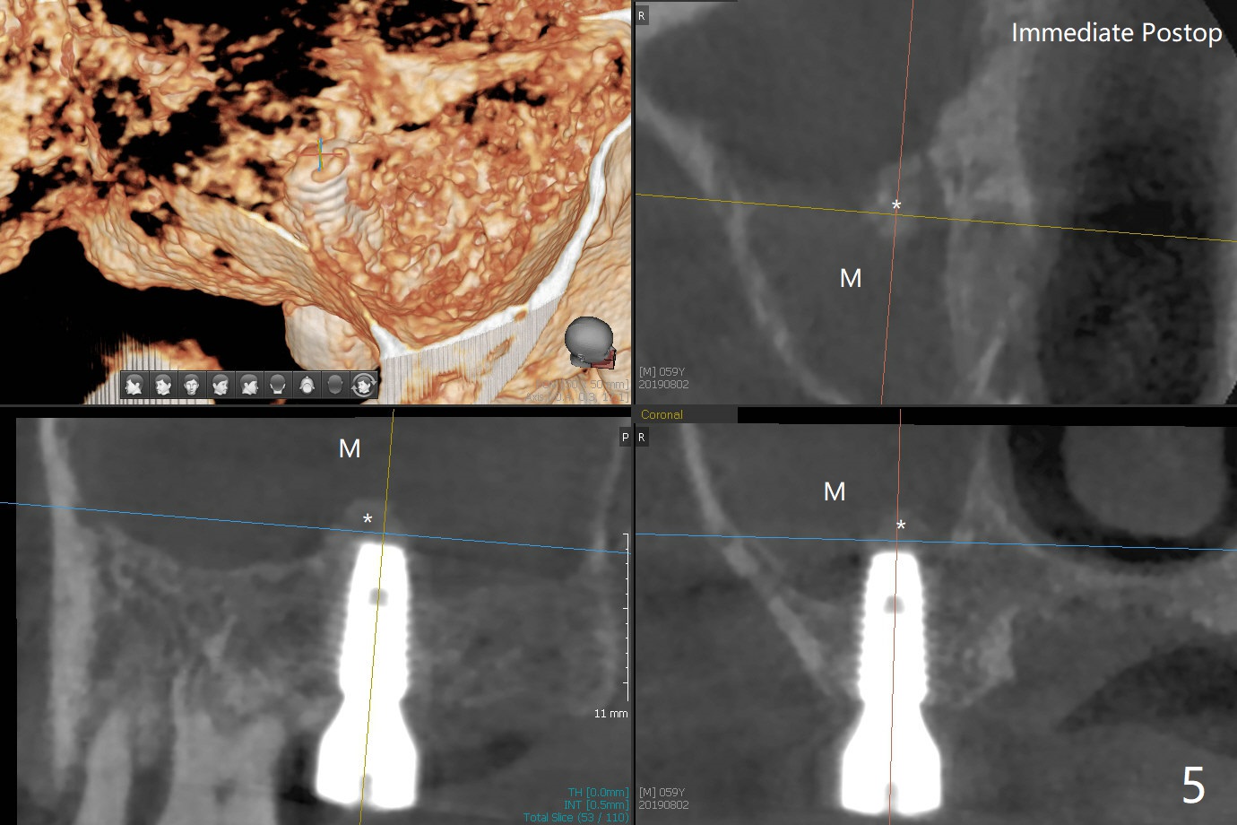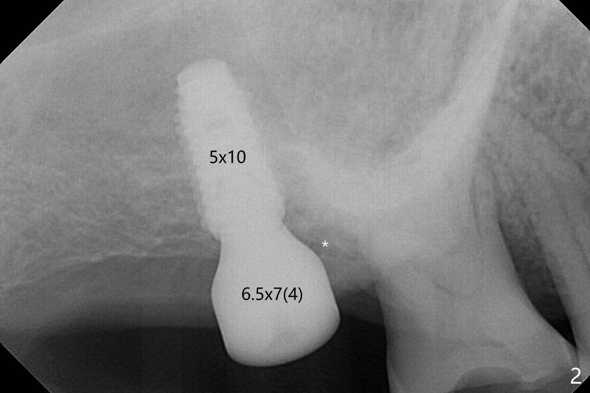 Two things happen immediately before this surgery. A SM implant is found to fail related to bruxism and poor oral hygiene, ~ 5 years in function; a UF implant will be used instead. DIO Sinus Approach Kit has not been autoclaved; therefore the free-hand one has to be used with caution. In fact the procedure goes on apparently smoothly in spite of the fact that the patient with medical knowledge is nervous about the risk of sinus lift. After 4.0x8.5 mm Neo Navi drill with 12 mm offset, the 3.6 mm sinus safety drill is used from 7 to 9 mm in length, followed by water balloon, PRF membranes (x2) and mixture of autogenous bone graft and allograft and 4.5x10 mm dummy implant (Fig.1). The definitive implant is placed with satisfactory stability (Fig.2), but a 6.5x7(4) mm healing abutment is close to the mesial crest (*). The former is reloaded following 6.0 mm Bone Profile Drill (Fig.3) and then is changed to a 6x6 mm IS one. The patient reports nasal hemorrhage immediately returning home, but there is no similar episode a few hours later. Re-analysis of preop (Fig.4) and immediate postop (Fig.5) CT shows that water balloon technique in fact swells the sinus membrane (M) instead elevating it. It is safe to place more bone graft (Fig.5 *). There is pain when the 6x6 mm healing abutment is being removed nearly 5 months postop (Fig.6.7). The patient complains of mild sinus discomfort, although panoramic X-ray does not show abnormality (Fig.8). He will return for recheck for implant stability (low bone density) before impression 2-4 months later.
