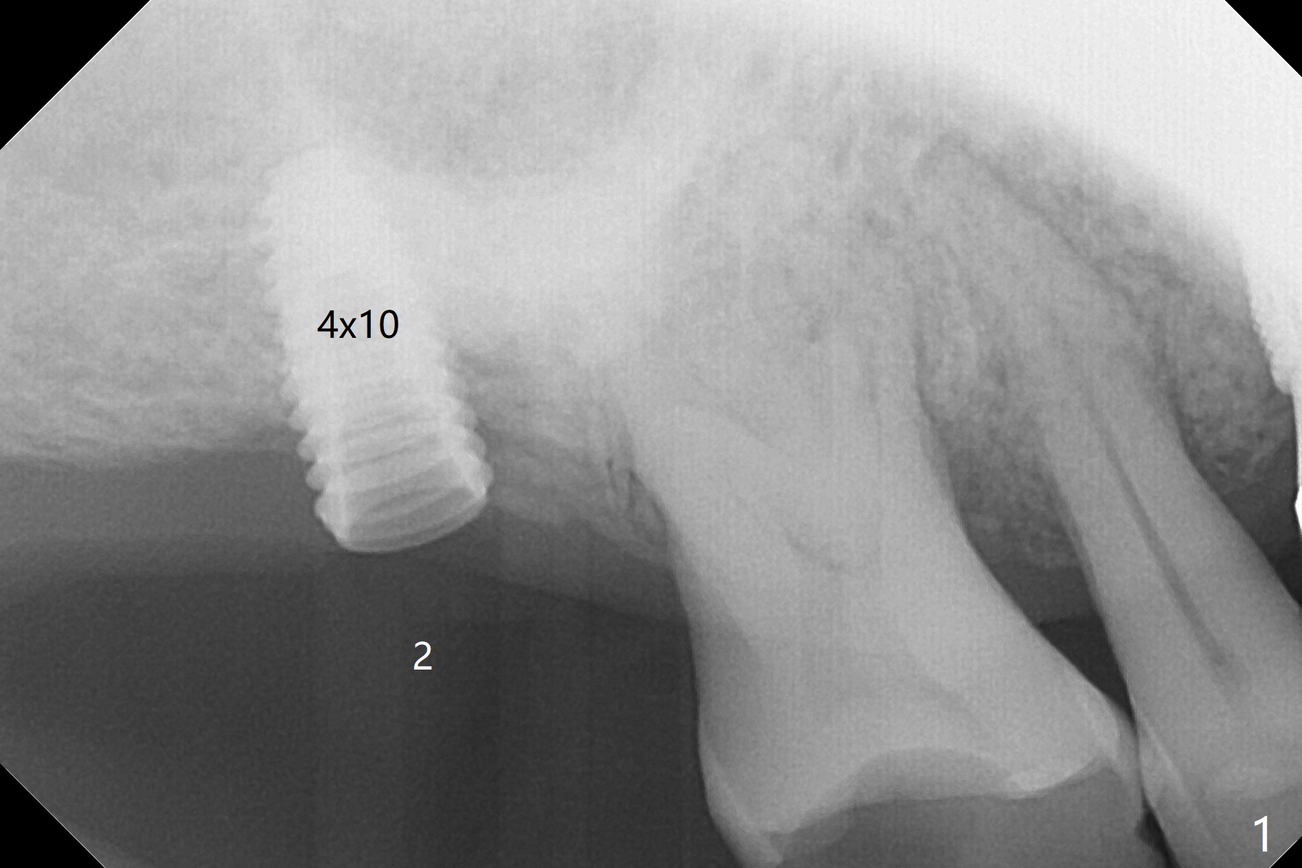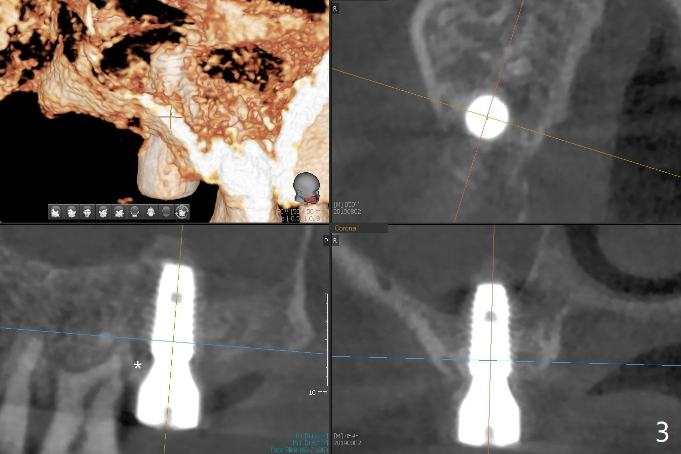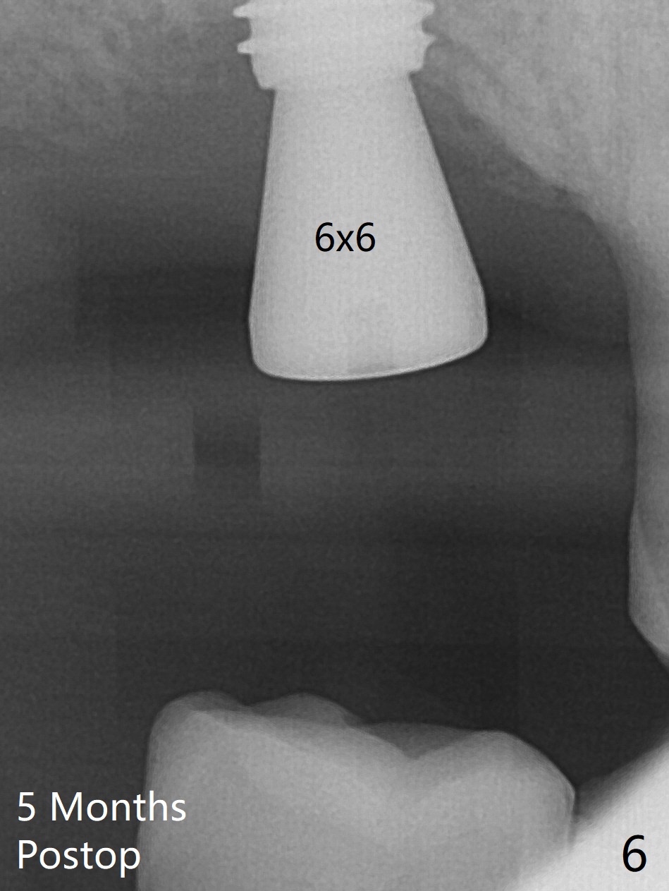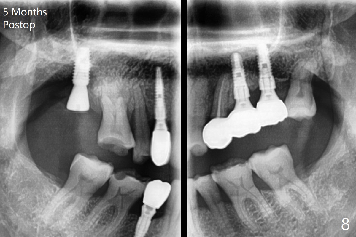 Two things happen immediately before this surgery. A SM implant is found to fail related to bruxism and poor oral hygiene, ~ 5 years in function; a UF implant will be used instead. DIO Sinus Approach Kit has not been autoclaved; therefore the free-hand one has to be used with caution. In fact the procedure goes on apparently smoothly in spite of the fact that the patient with medical knowledge is nervous about the risk of sinus lift. After 4.0x8.5 mm Neo Navi drill with 12 mm offset, the 3.6 mm sinus safety drill is used from 7 to 9 mm in length, followed by water balloon, PRF membranes (x2) and mixture of autogenous bone graft and allograft and 4.5x10 mm dummy implant (Fig.1). The definitive implant is placed with satisfactory stability (Fig.2), but a 6.5x7(4) mm healing abutment is close to the mesial crest (*). The former is reloaded following 6.0 mm Bone Profile Drill (Fig.3) and then is changed to a 6x6 mm IS one. The patient reports nasal hemorrhage immediately returning home, but there is no similar episode a few hours later. Re-analysis of preop (Fig.4) and immediate postop (Fig.5) CT shows that water balloon technique in fact swells the sinus membrane (M) instead elevating it. It is safe to place more bone graft (Fig.5 *). There is pain when the 6x6 mm healing abutment is being removed nearly 5 months postop (Fig.6.7). The patient complains of mild sinus discomfort, although panoramic X-ray does not show abnormality (Fig.8). He will return for recheck for implant stability (low bone density) before impression 2-4 months later.