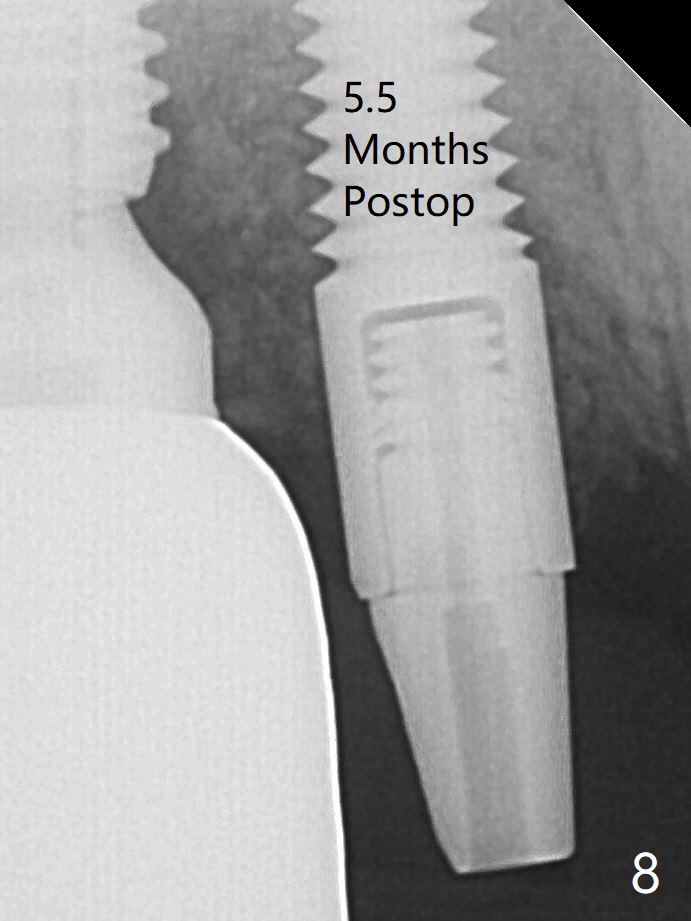 A 4x14 mm dummy implant is placed free hand (Fig.1). Following initial placement of a final 4x17 mm implant and bone graft (Fig.2 *), the crown and abutment of #3 and the guide are reseated for correct implant trajectory. The guide has to be removed for final depth control of the tissue-level implant. More bone graft is inserted mesial of #4 implant with a 3.5x5 mm abutment (Fig.3 *). The implant at # 4 seem to have osteointegrated, especially mesial, nearly 5.5 months postop (Fig.7,8 (BW)).