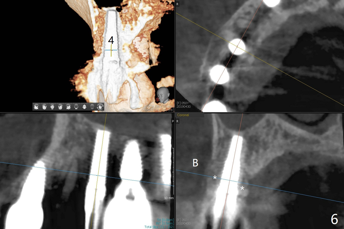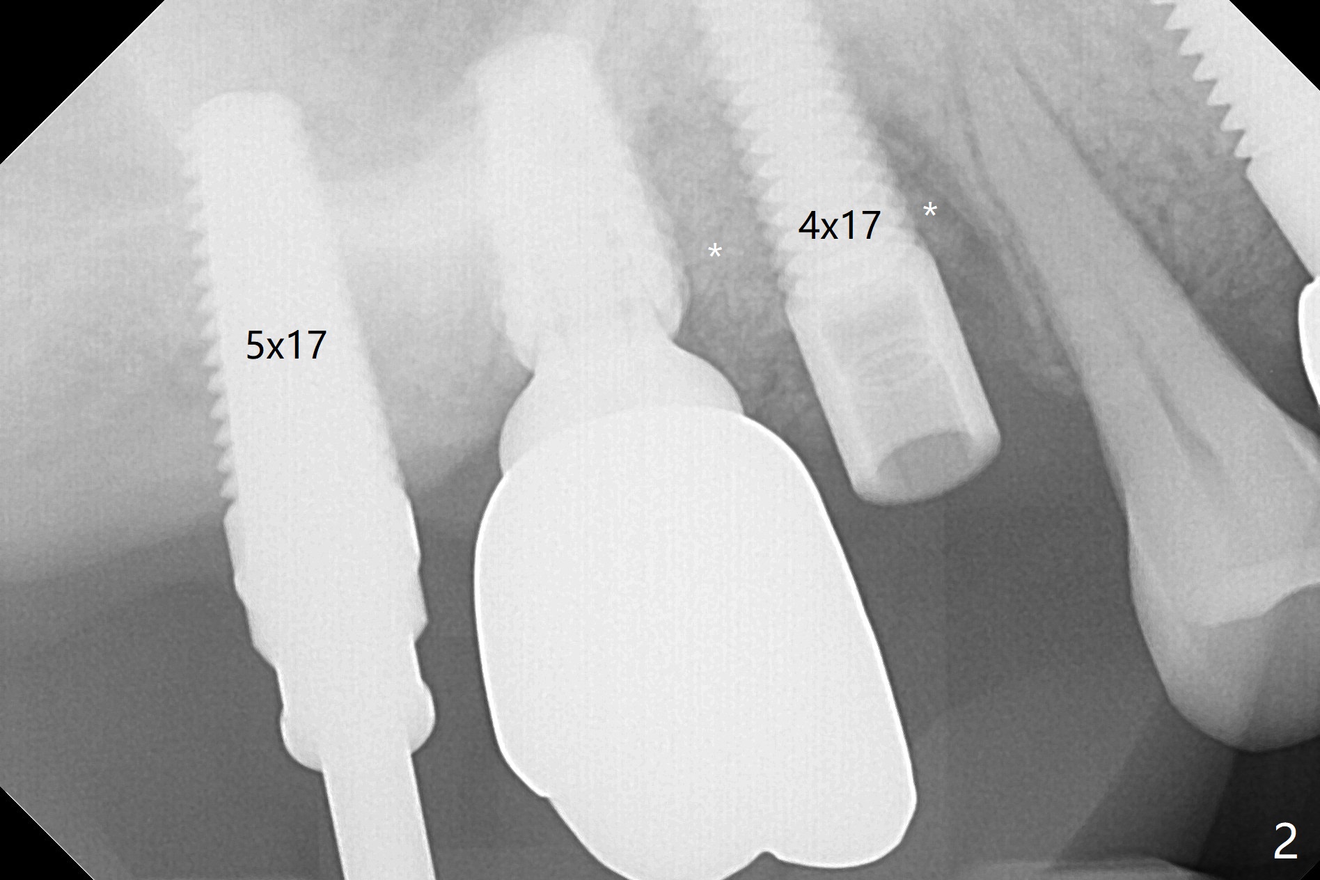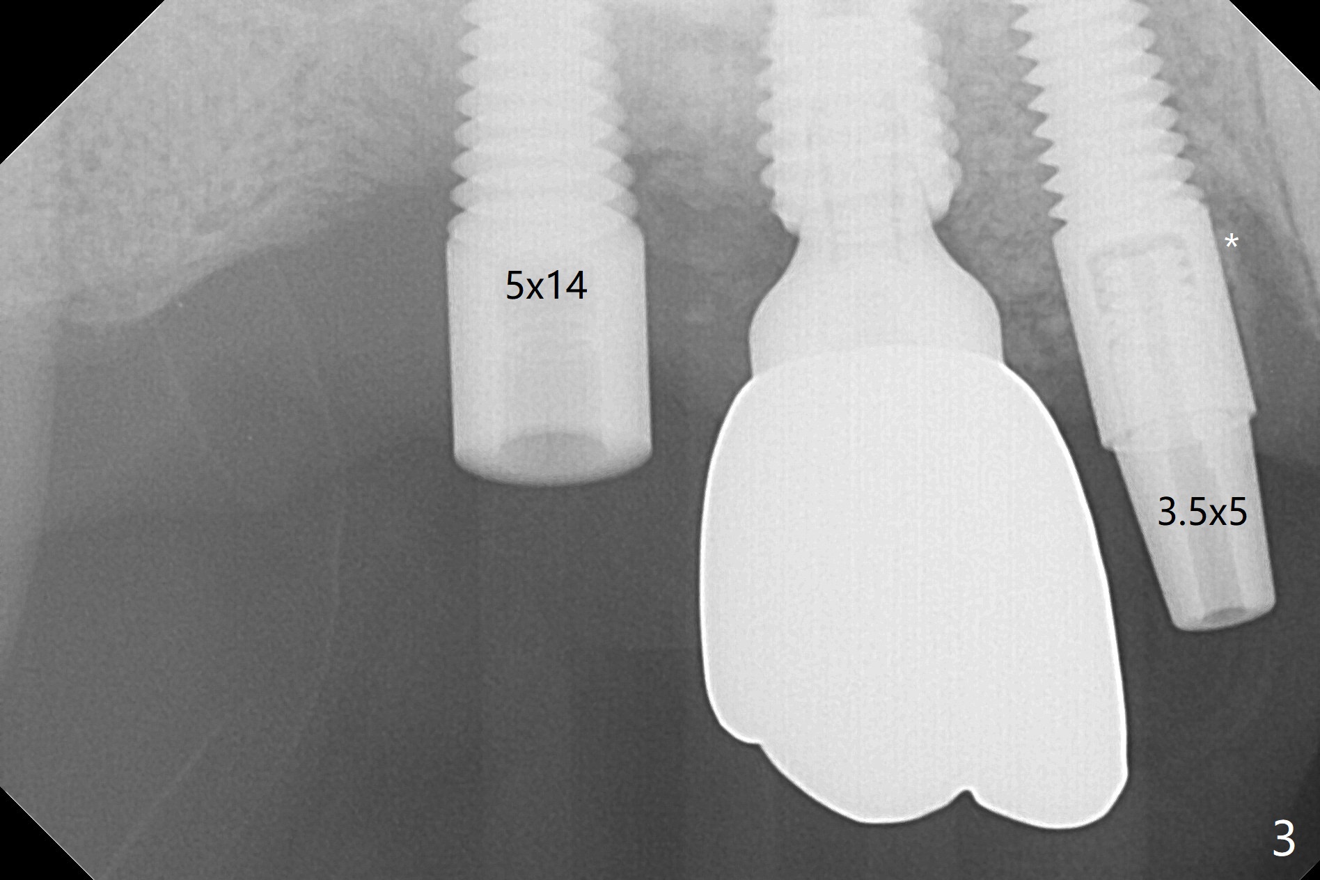 After osteotomy using bone-level implant guide at #4, the crown and abutment at #3 has to be removed to place a 4x14 mm tissue-level dummy implant because of the narrow space of #4 and implant placement angulation (Fig.1). Following initial placement of a final 4x17 mm implant and bone graft (Fig.2 *), the crown and abutment of #3 and the guide are reseated for correct implant trajectory. The guide has to be removed for final depth control. With the same mode, a 5x17 mm tissue-level tap is used at #2 following bone-level osteotomy with guide. A 5x14 mm tissue-level implant is placed with >50 Ncm (later placed deeper), while more bone graft is inserted mesial of #4 implant with a 3.5x5 mm abutment (Fig.3 *). Bone graft is introduced into the sinus using guided sinus lift kit (Fig.4,5 (CT sagittal and coronal sections)) * (D: distal, P: palatal)). The coronal half of the implant at #4 is covered by bone graft (Fig.6 *) buccal (B) and palatal within the deep socket. The implants at #2 and 4 seem to have osteointegrated nearly 5.5 months postop (Fig.7,8 (BW)). A 4.5x5 mm unipost is later placed at #2 with long chamfer margin. It appears that the abutment at #3 is wide. The hex is worn. It changes to a 5.5x7(4) mm one. After abutment adjustment for parallelism, a provisional FPD is fabricated. The latter will be adjusted for papilla formation between implants to reduce food impaction.