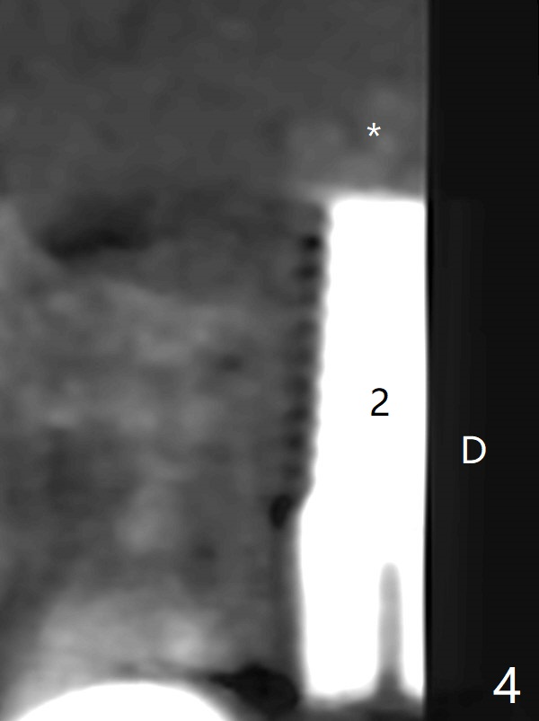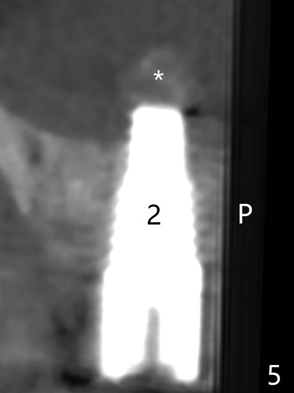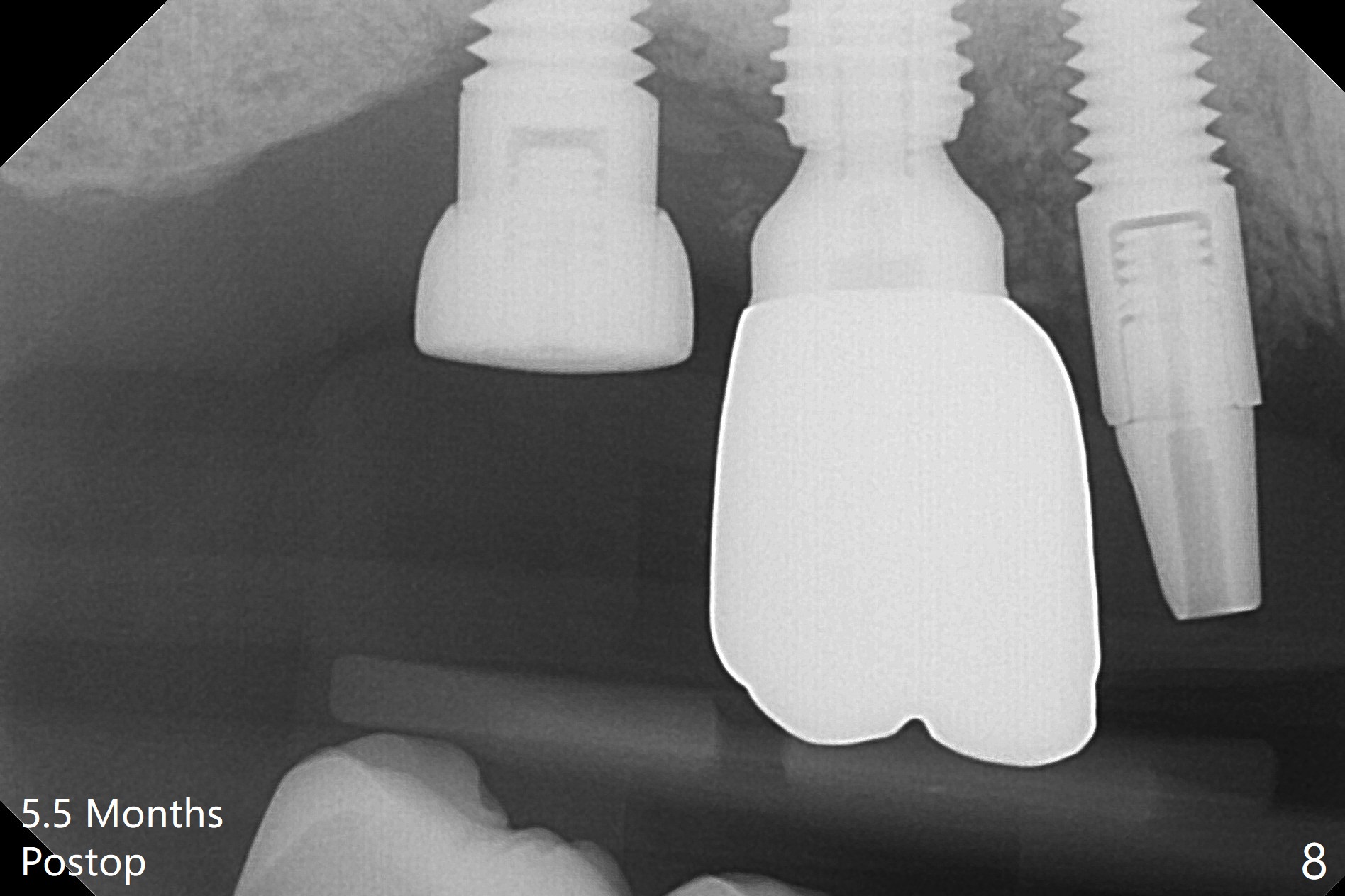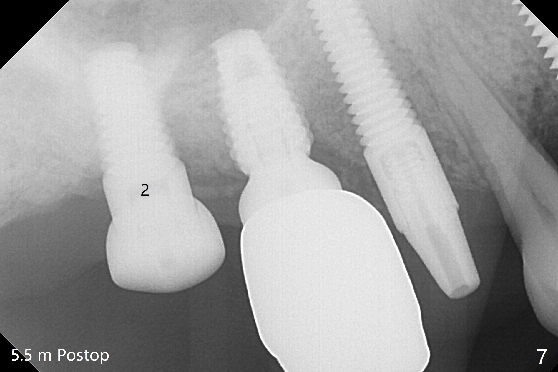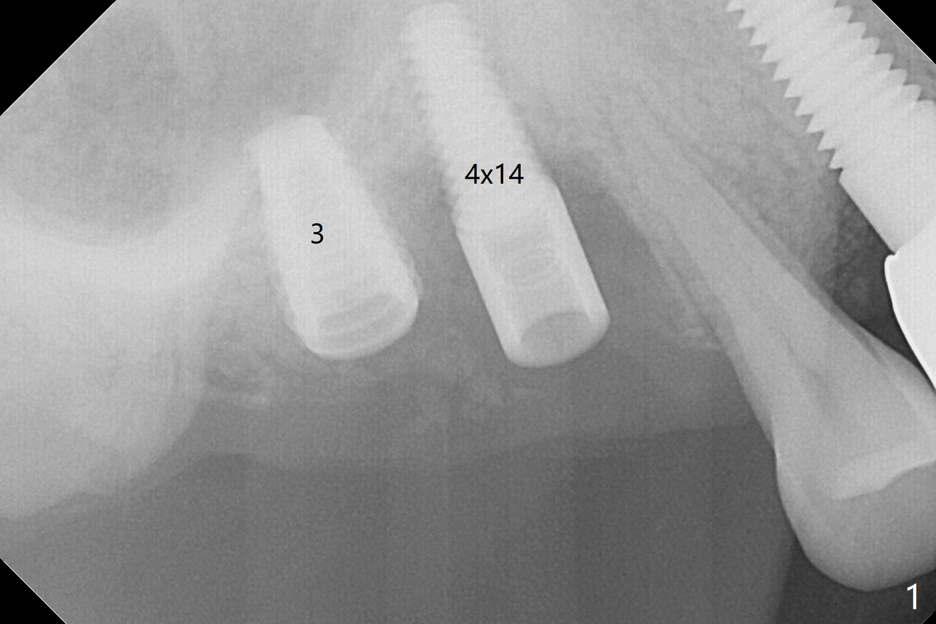 After osteotomy using bone-level implant guide at #4, the crown and abutment at #3 has to be removed to place a 4x14 mm tissue-level dummy implant because of the narrow space of #4 and implant placement angulation (Fig.1). Following initial placement of a final 4x17 mm implant and bone graft (Fig.2 *), the crown and abutment of #3 and the guide are reseated for correct implant trajectory. The guide has to be removed for final depth control. With the same mode, a 5x17 mm tissue-level tap is used at #2 following bone-level osteotomy with guide. A 5x14 mm tissue-level implant is placed with >50 Ncm (later placed deeper), while more bone graft is inserted mesial of #4 implant with a 3.5x5 mm abutment (Fig.3 *). Bone graft is introduced into the sinus using guided sinus lift kit (Fig.4,5 (CT sagittal and coronal sections)) * (D: distal, P: palatal)). The coronal half of the implant at #4 is covered by bone graft (Fig.6 *) buccal (B) and palatal within the deep socket. The implants at #2 and 4 seem to have osteointegrated nearly 5.5 months postop (Fig.7,8 (BW)). A 4.5x5 mm unipost is later placed at #2 with long chamfer margin. It appears that the abutment at #3 is wide. The hex is worn. It changes to a 5.5x7(4) mm one. After abutment adjustment for parallelism, a provisional FPD is fabricated. The latter will be adjusted for papilla formation between implants to reduce food impaction.