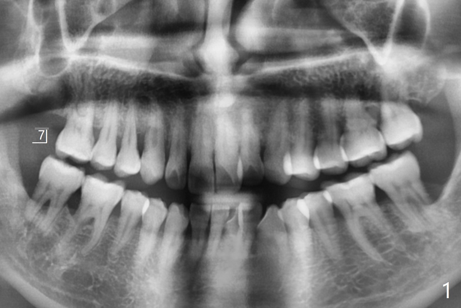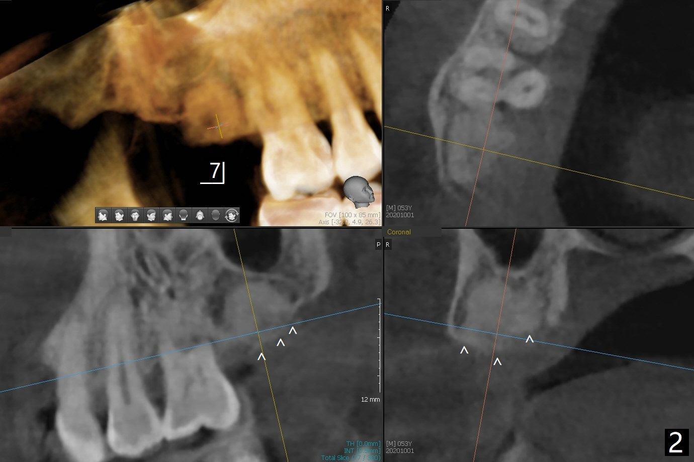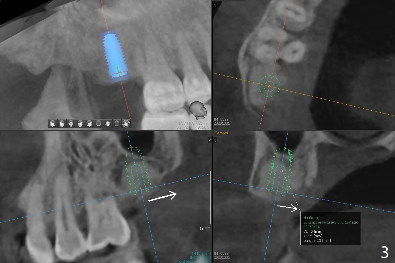 53岁男一年前在别的诊所做右上7拔牙植骨,现在要求植牙(图一),其余牙齿骨质吸收严重,植牙更显得重要。缺牙区植骨密度正常,但是牙槽嵴不平(图二:箭头),导板种植,植体可能偏向低处(阻力低的区域:远中,腭侧(图三:箭头)),几年后可能出现螺纹暴露。