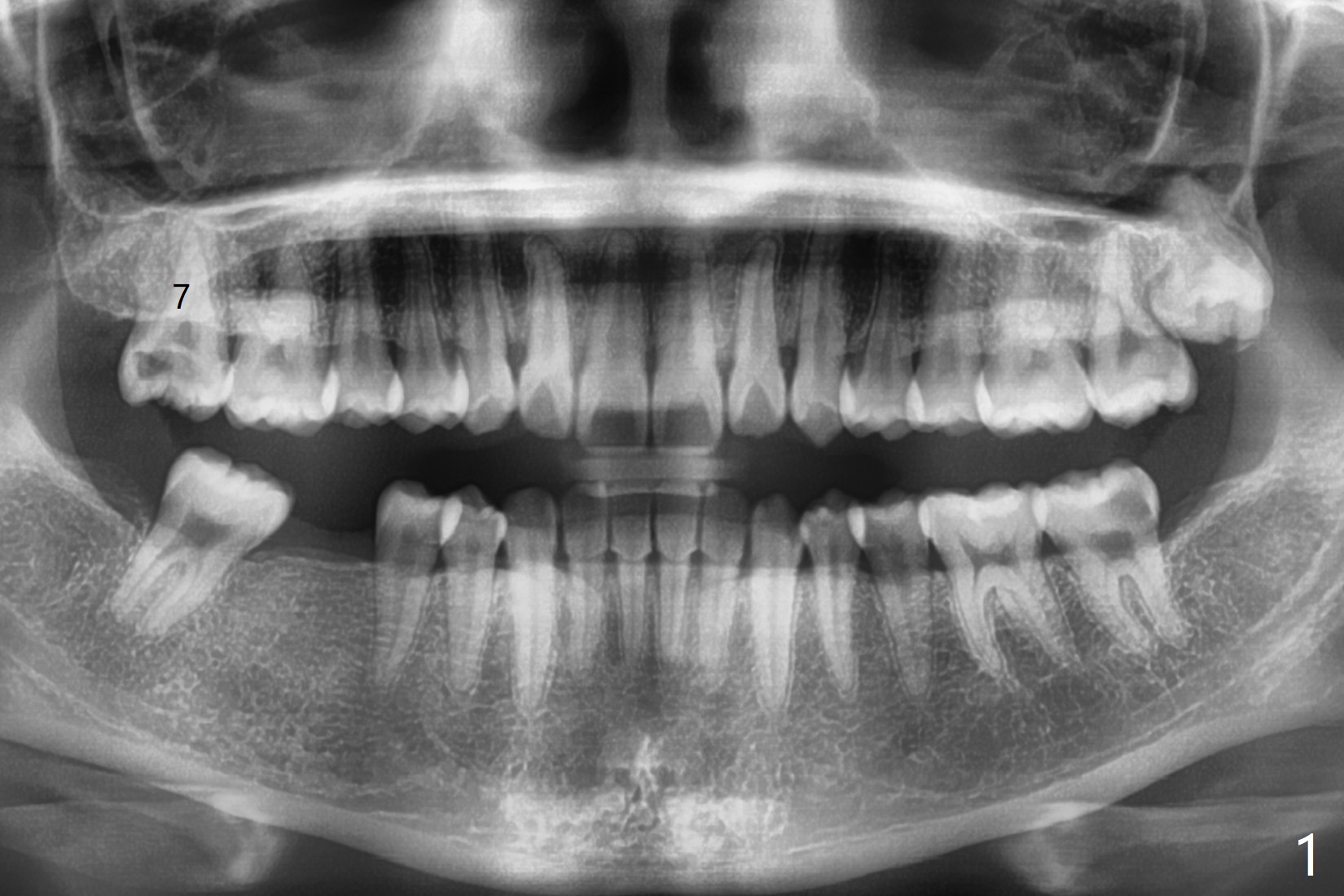 23岁女留学生,即将毕业回国,右上7夜间痛(图一),远中龈下龋,牙龈增生,局部垂直距离小。两三天考虑后,她回来深洗(图二),同意拔除,植骨(皮质,图三),放置GEM Cap,牙周胶水固定,有限垂直距离,肥大颊粘膜,觉得缝合困难。放置间隙保持器必须压到胶原膜,牙周敷料必须放置,防止保持器颊侧臂刺激粘膜。上颌第二磨牙植骨很麻烦,如果使用粘性骨粉,就方便多了。在做深洗时,可以抽血制备PRF,不浪费时间,但愿效果好(信则灵)。