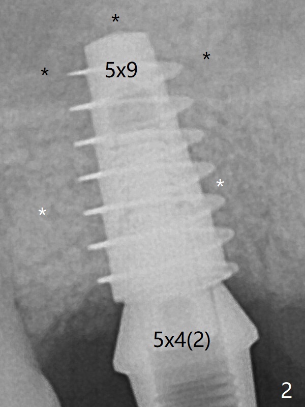 After placing bone graft into the sinus and the osteotomy (Fig.2 black *), a 5x9 mm implant is placed with >30 Ncm. Second round of bone graft is placed around the implant, including DB defect (white *). Then a 5x4(2) mm pair abutment is placed, followed by the third round of bone graft (Fig.3 *). If the abutment were placed prior to the 2nd round of the bone graft, the latter would be unable to reach the deepest implant threads or the defect.