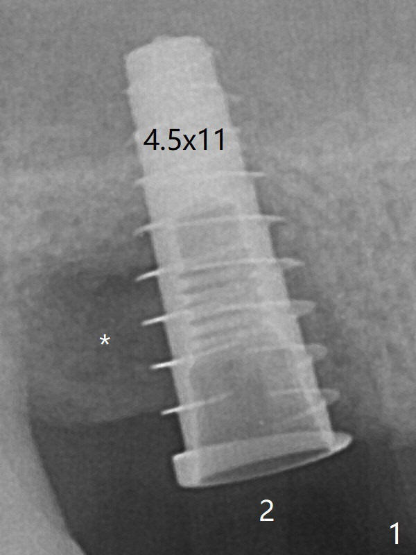 The tooth #2 has severe distobucal (DB) infection before and after extraction (Fig.1 *); sinus lift is done with 4.5x11 mm dummy implant using guide.