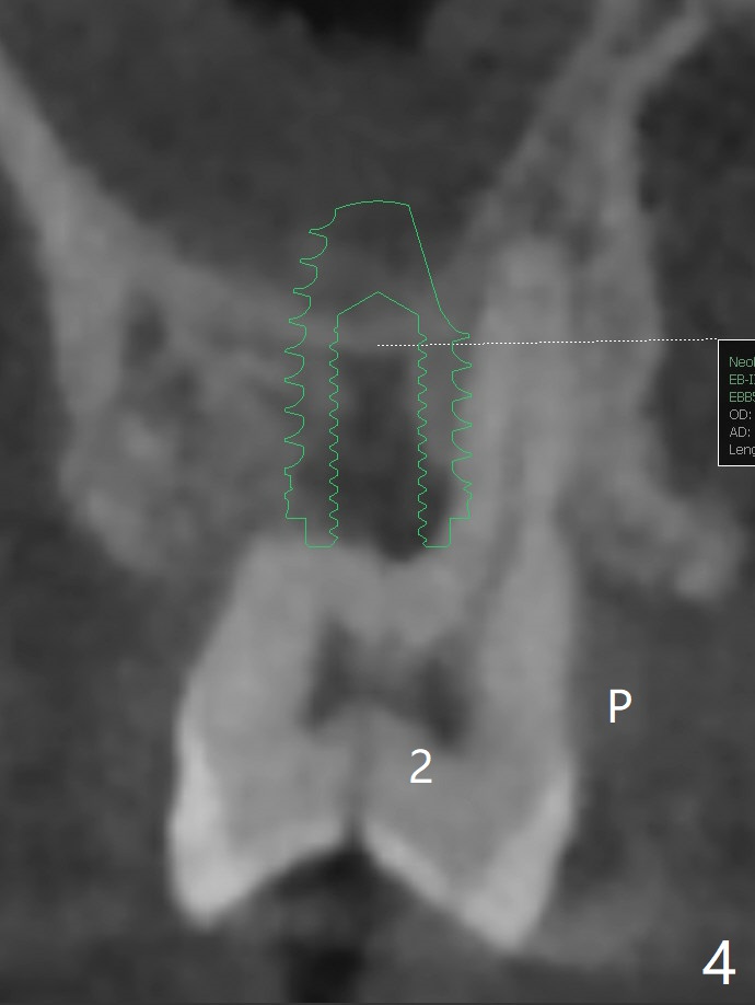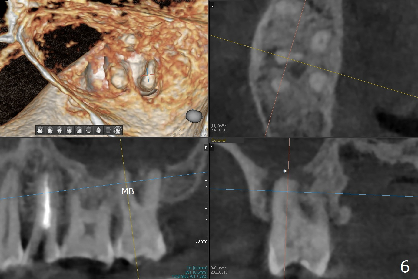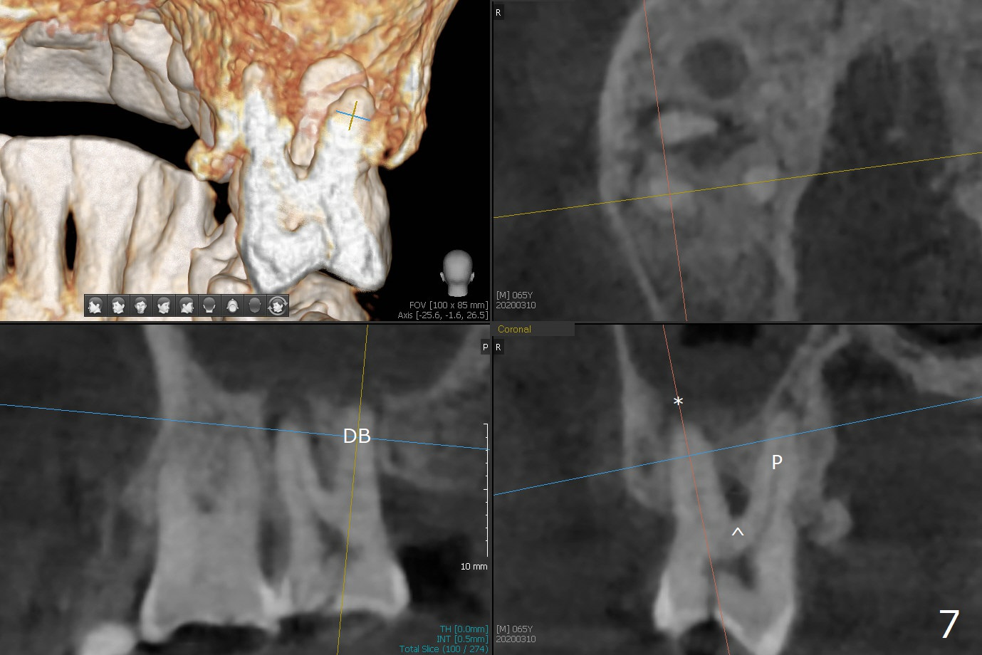 After implant placement at #13 six months post bone graft (Fig.1), reexami-nation shows that the tooth #2 cracks (Fig.2-4). The bony defect area is easier to identify with CT (between MB and P roots of #2) than without CT (M) for #13. There is no bone height reduction after extraction of #15 (Fig.5). Due to new coronal virus outbreak, the patient wants extraction first. The sinus floor perforates (*) apical to MB (Fig.6) and DB (Fig.7) roots. After debridement, sinus lift will be conducted using allograft hydrated with GEM21S liquid portion. The same mix will be used for socket preservation. With high concentration of growth factor, it is hoped that bone density in the sockets will increase quick and high enough for future implant, as compared to #13 of the same patient.