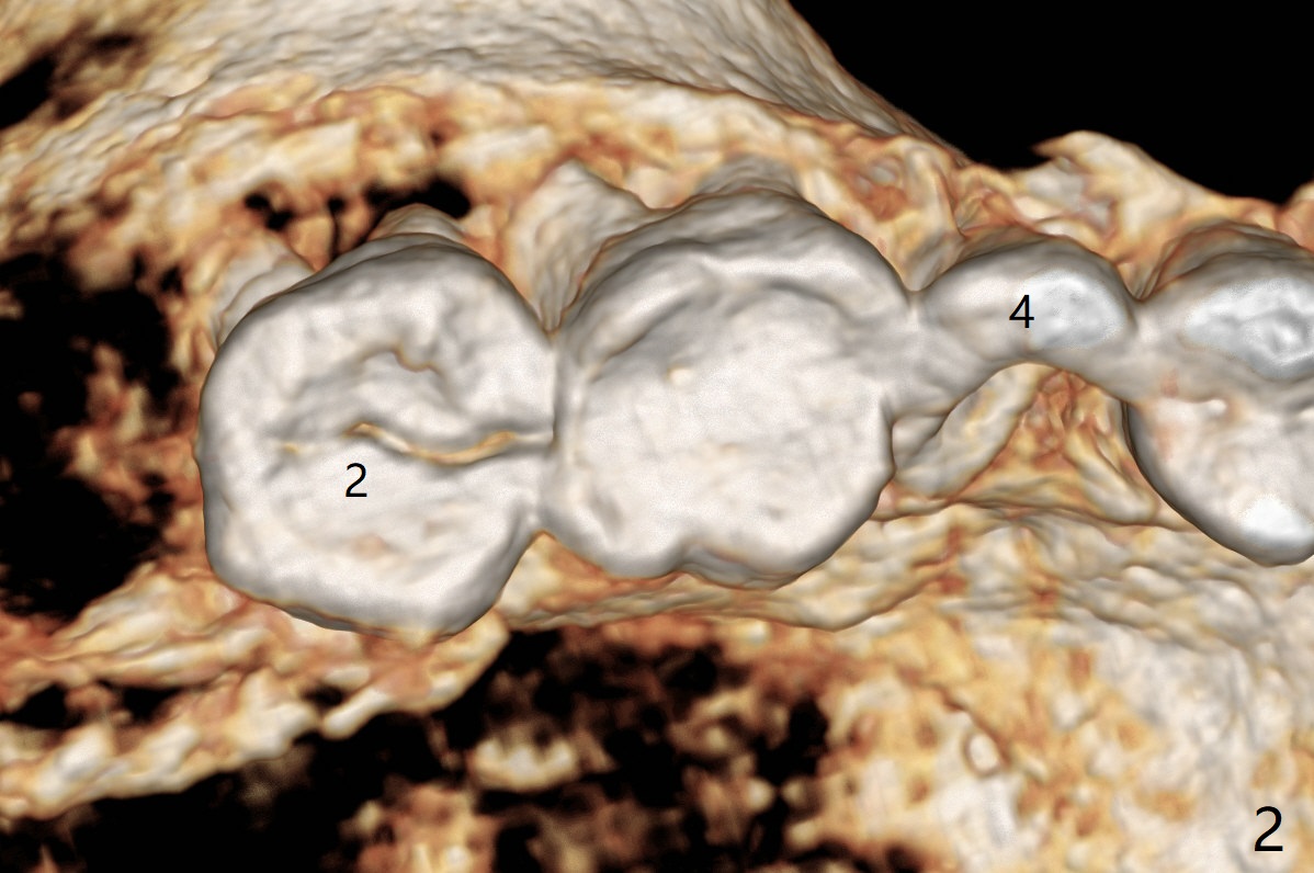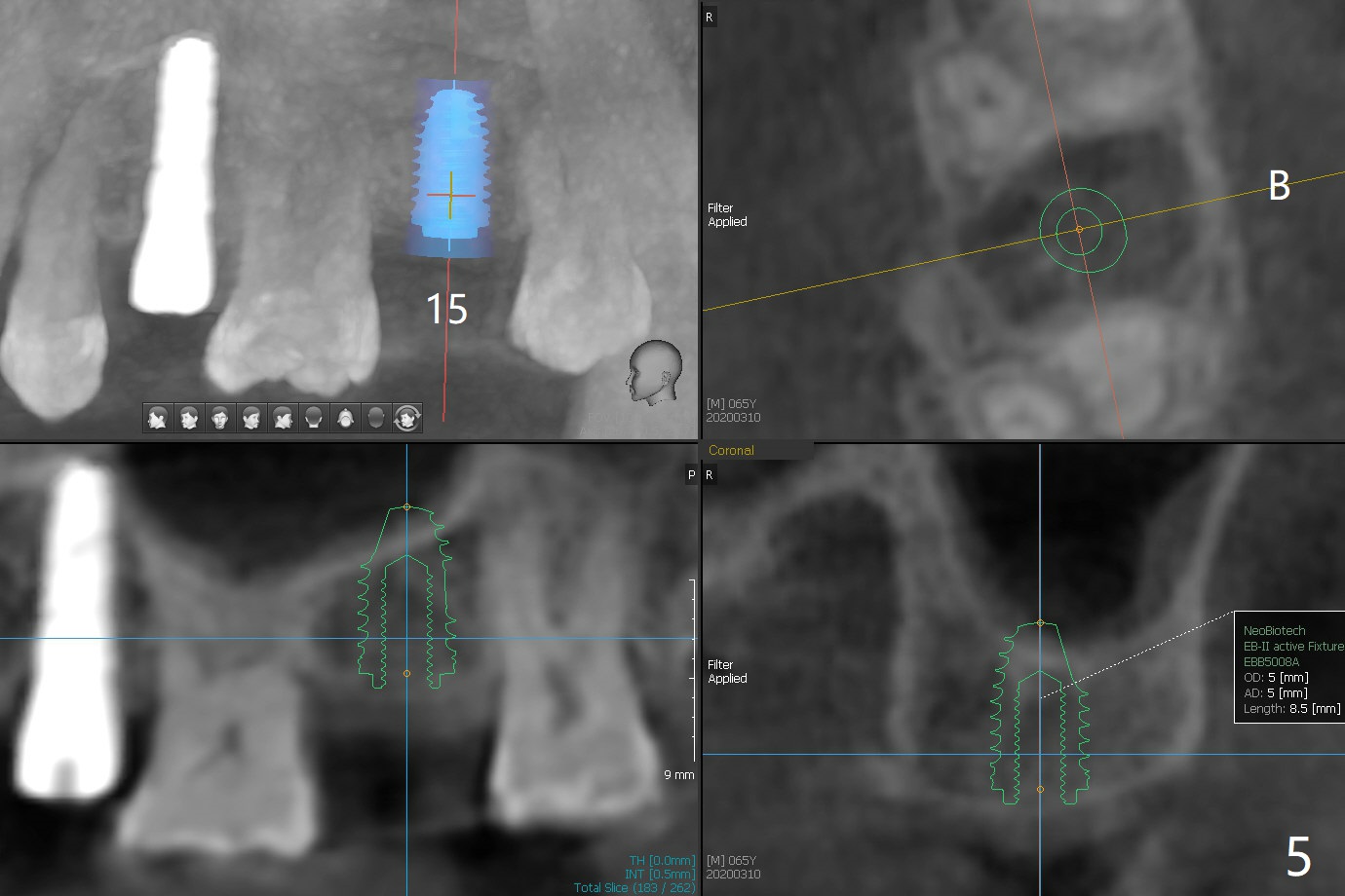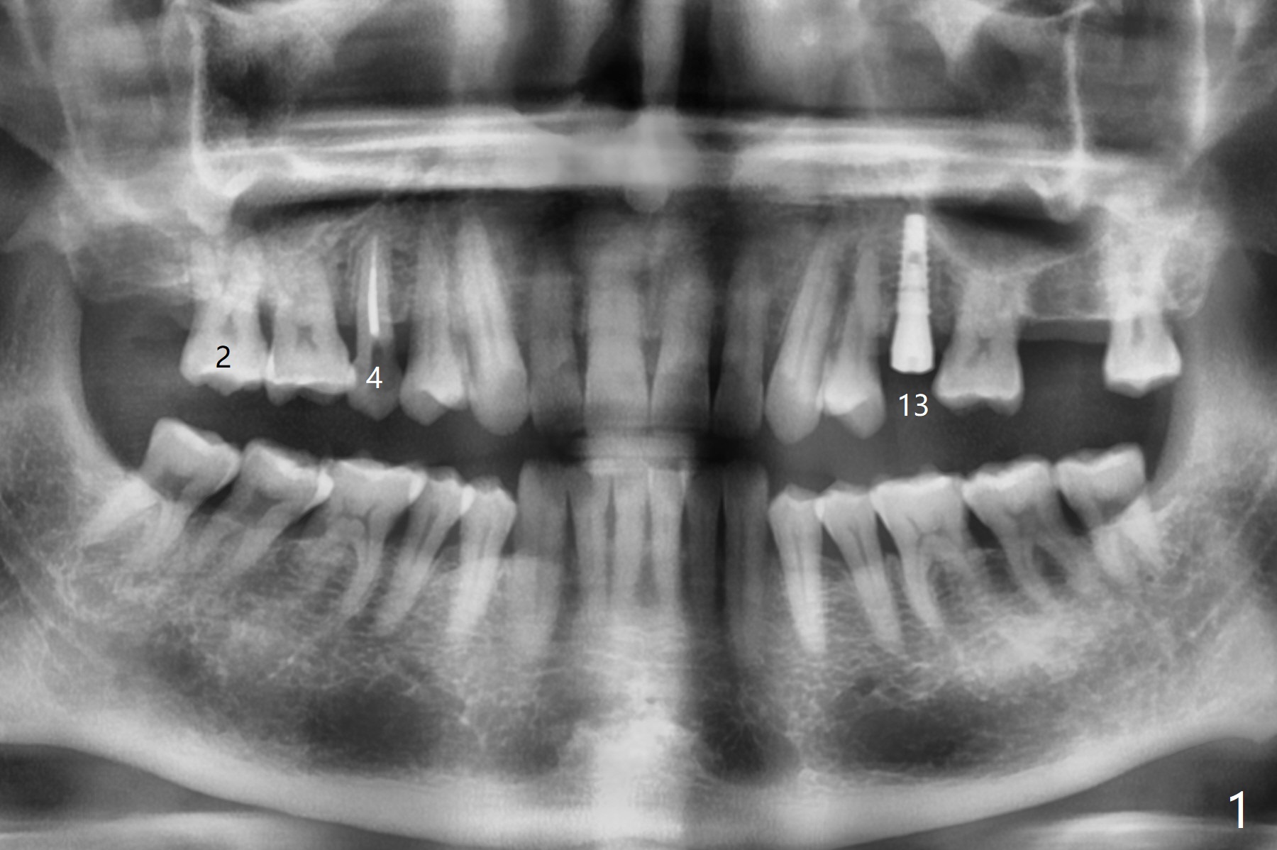 After implant placement at #13 six months post bone graft (Fig.1), reexami-nation shows that the tooth #2 cracks (Fig.2-4). The bony defect area is easier to identify with CT (between MB and P roots of #2) than without CT (M) for #13. There is no bone height reduction after extraction of #15 (Fig.5). Due to new coronal virus outbreak, the patient wants extraction first. The sinus floor perforates (*) apical to MB (Fig.6) and DB (Fig.7) roots. After debridement, sinus lift will be conducted using allograft hydrated with GEM21S liquid portion. The same mix will be used for socket preservation. With high concentration of growth factor, it is hoped that bone density in the sockets will increase quick and high enough for future implant, as compared to #13 of the same patient.