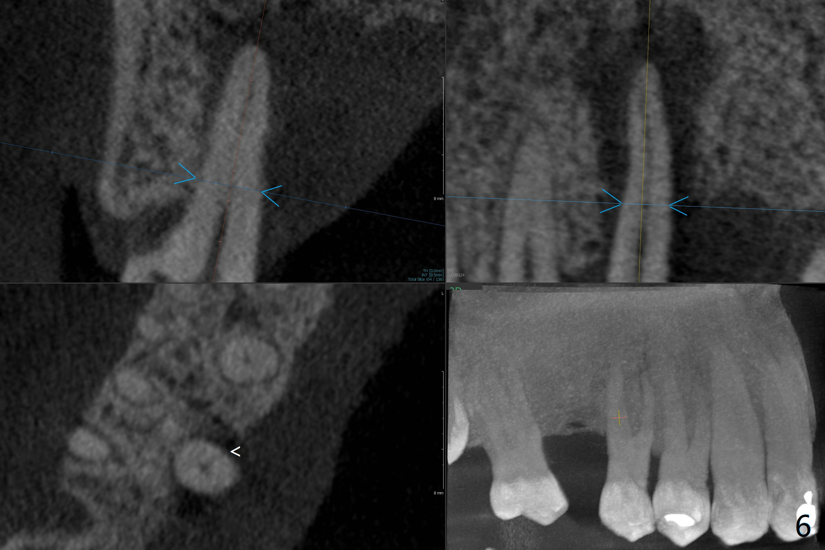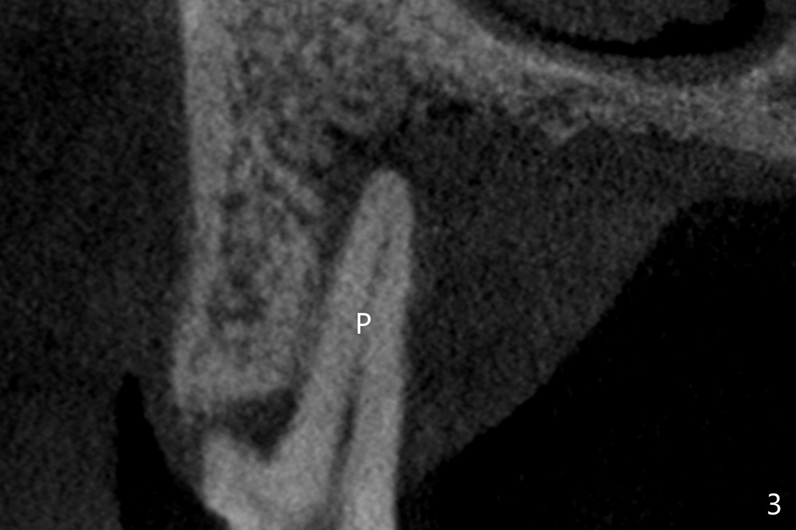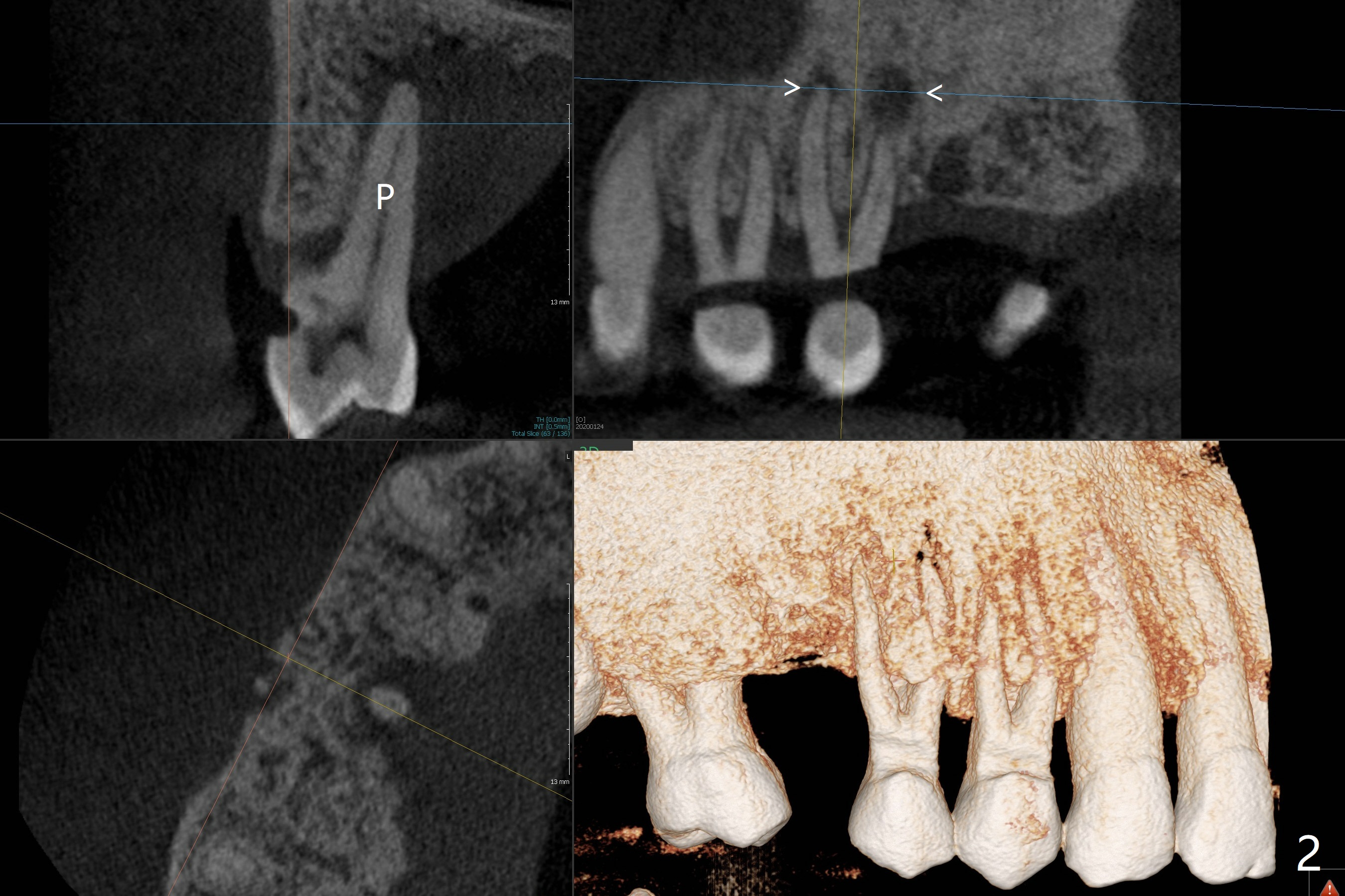 A 52-year-old man (smoker 1 ppd) has toothache in UR. The tooth #4 has severe Class V defect (Fig.1 *), periapical radio-lucency (PARL, arrow-heads) around the buccal roots and mild percu-ssion. PARL is more severe around the palatal root (Fig.2 P). Since it seems difficult to do socket preser-vation, can we do RCT to regrow bone before implant? CT coronal section shows the palatal defect of the palatal root (Fig.3,4), while sagittal one shows J defect of the palatal root, associated with root fracture (Fig.5). In fact the palatal root has transverse fracture at crestal level (Fig.6-8). The tooth #4 will be extracted for immediate implant (Fig.9,10); a 4 mm implant will be placed in the narrow space of #3 at the same time (Fig.11). The patient had symptoms consistent with aortic aneurysm. Since then smoke has been quit.