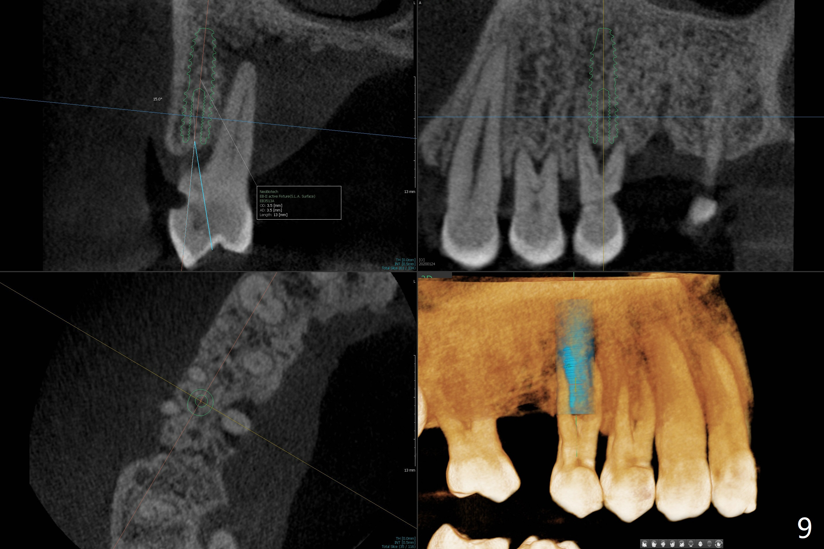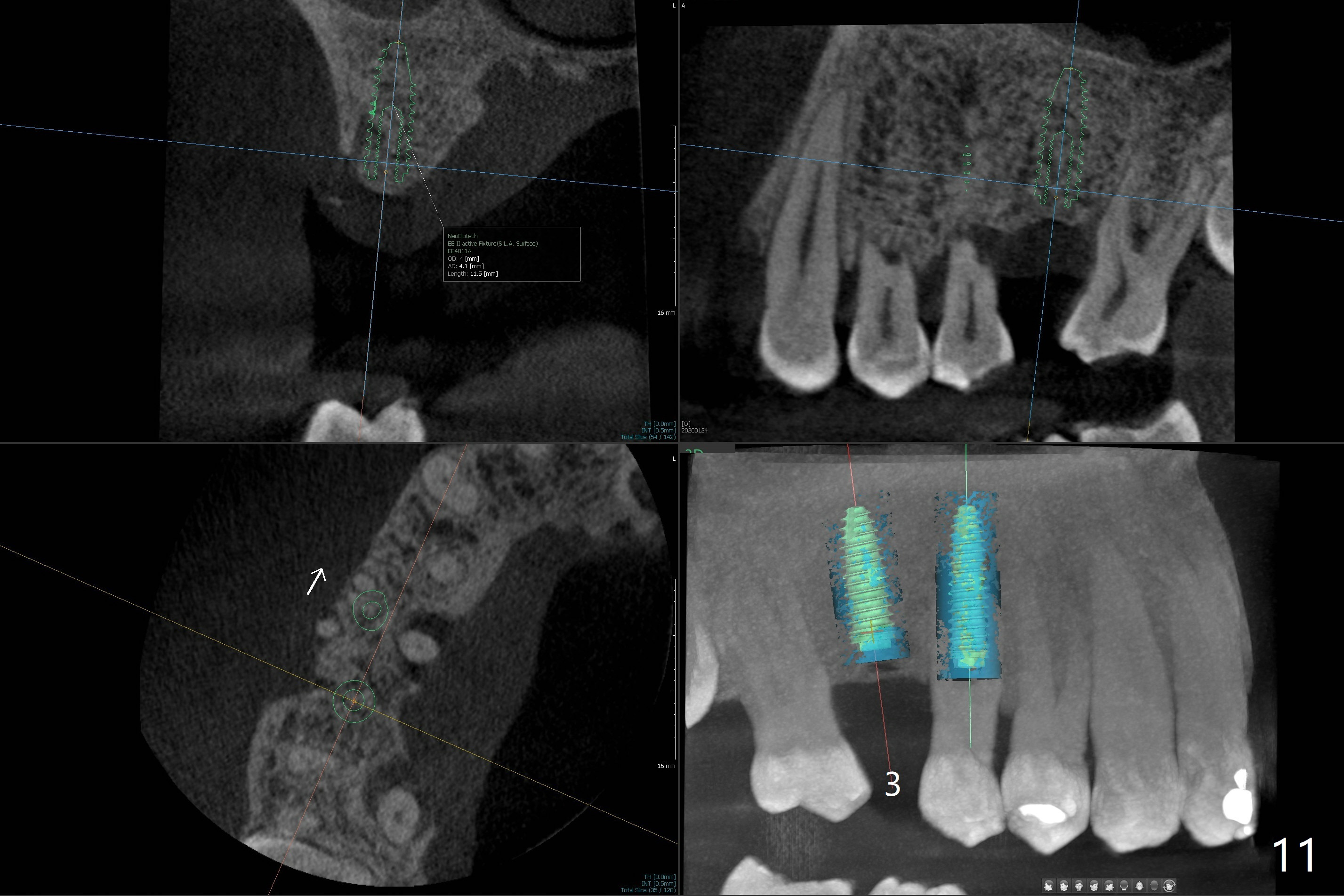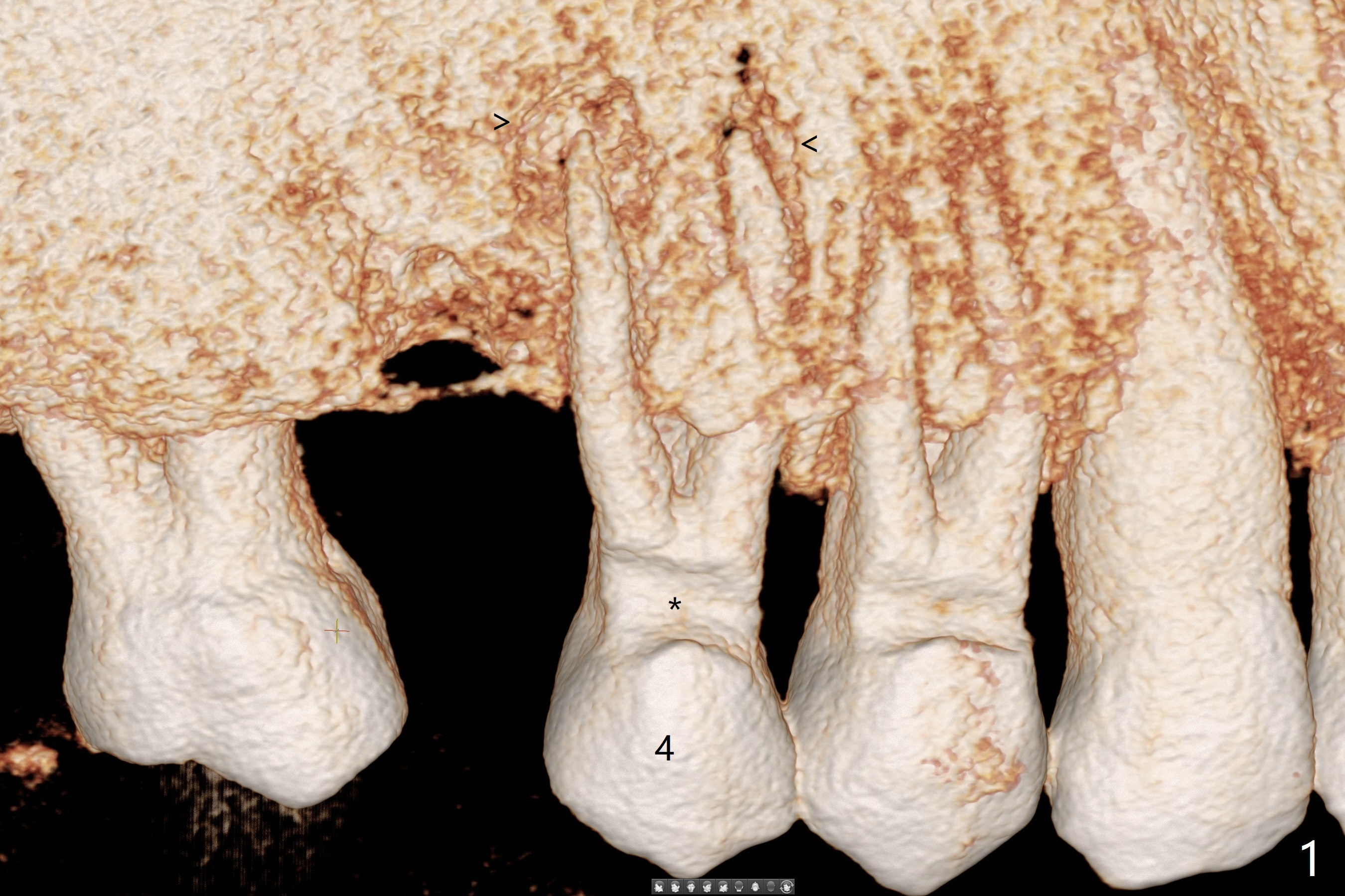 A 52-year-old man (smoker 1 ppd) has toothache in UR. The tooth #4 has severe Class V defect (Fig.1 *), periapical radio-lucency (PARL, arrow-heads) around the buccal roots and mild percu-ssion. PARL is more severe around the palatal root (Fig.2 P). Since it seems difficult to do socket preser-vation, can we do RCT to regrow bone before implant? CT coronal section shows the palatal defect of the palatal root (Fig.3,4), while sagittal one shows J defect of the palatal root, associated with root fracture (Fig.5). In fact the palatal root has transverse fracture at crestal level (Fig.6-8). The tooth #4 will be extracted for immediate implant (Fig.9,10); a 4 mm implant will be placed in the narrow space of #3 at the same time (Fig.11). The patient had symptoms consistent with aortic aneurysm. Since then smoke has been quit.