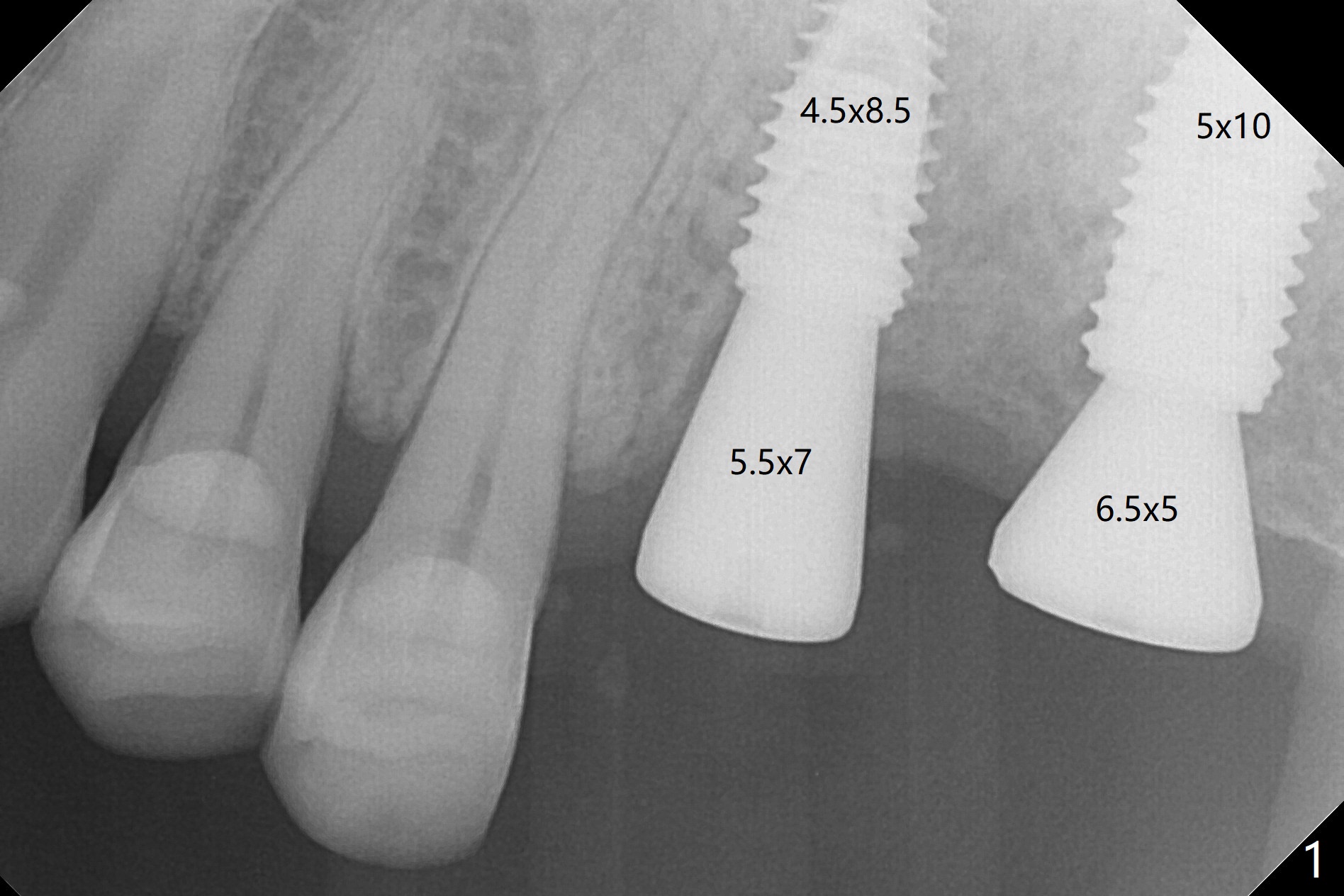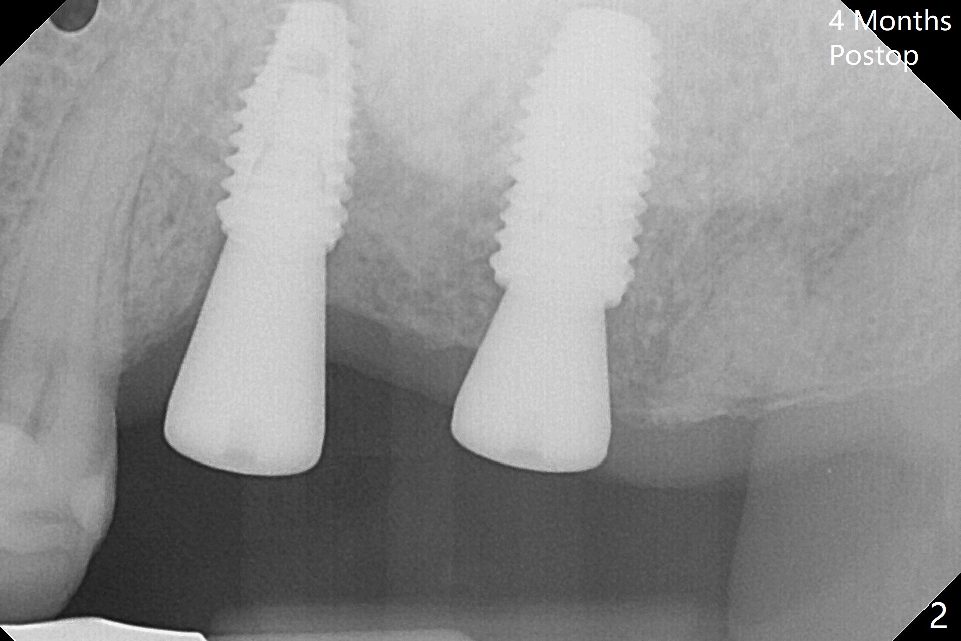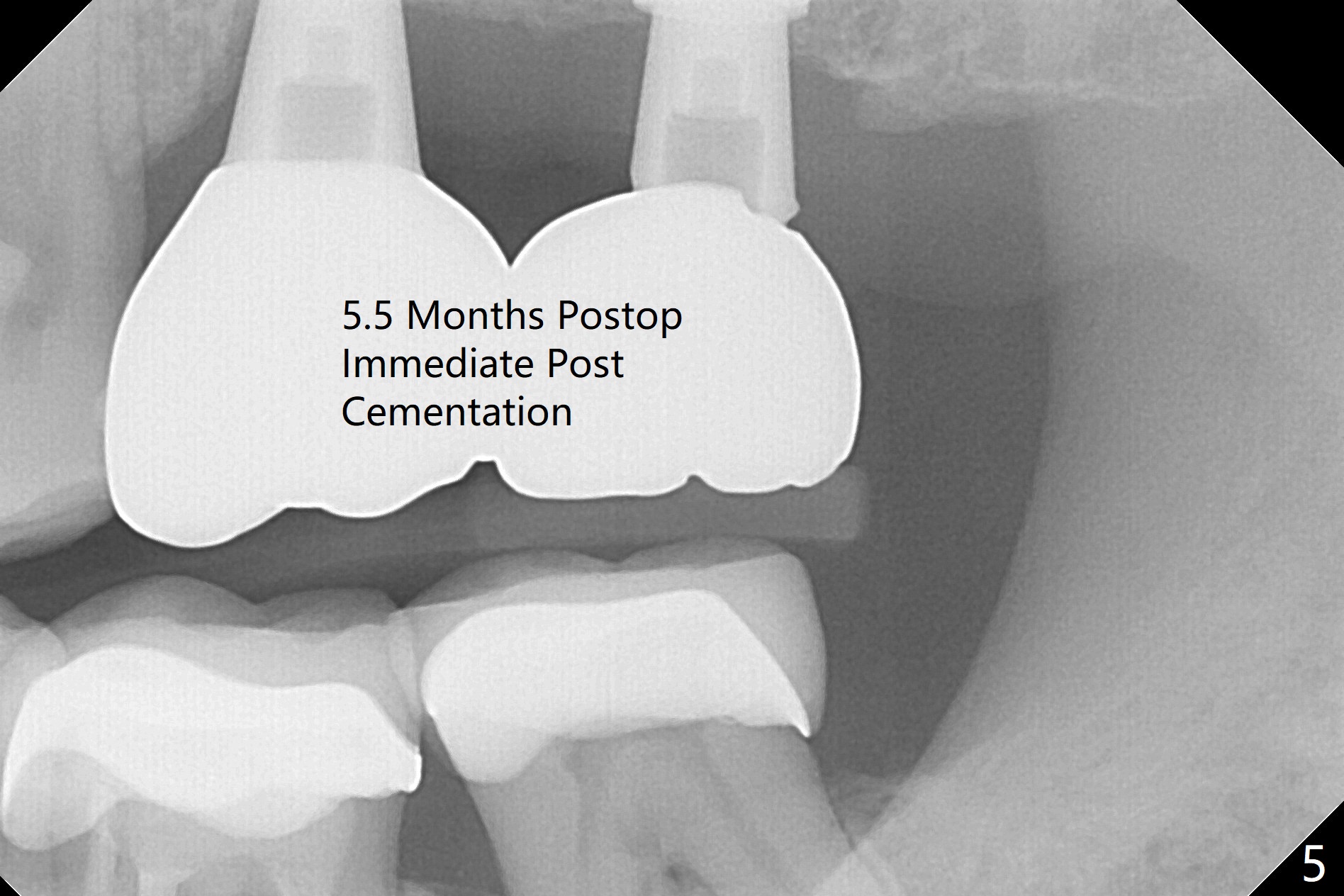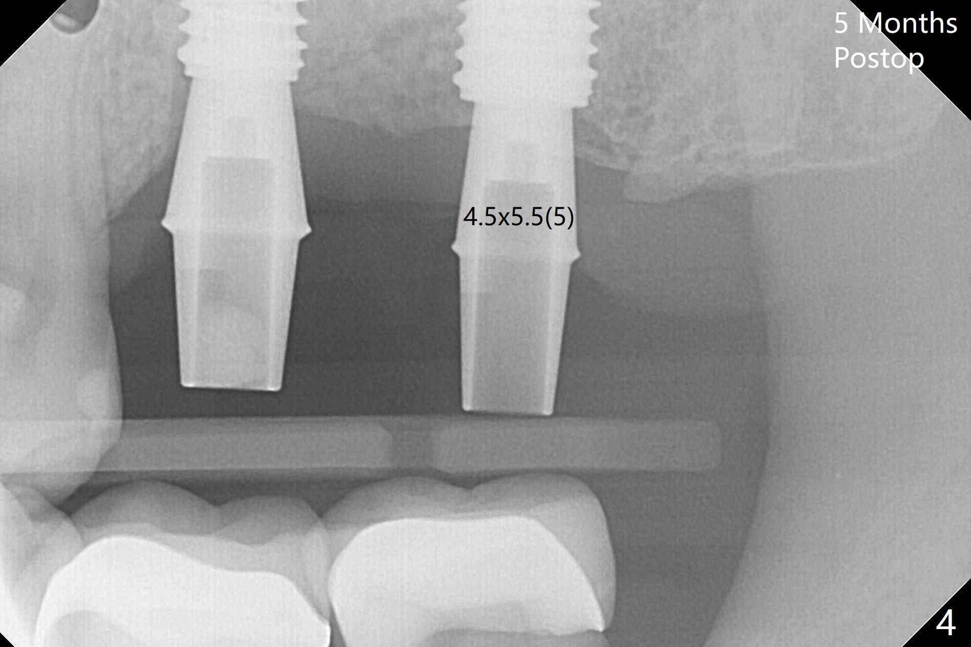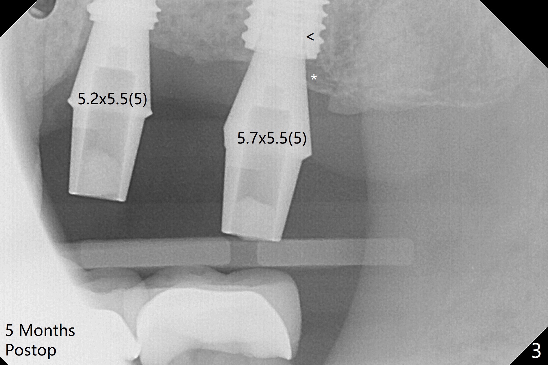 With one carpule of 2% Xylocaine with 1:100,000 Epinephrine, there is no intraop pain associated with placement of 2 implants with guide (Fig.1). Postop pain is minimal. Difficulty is high torque in insertion. At the site of #15, there is no bone shaving associated with 4 mm or less drills. The deeper portion of the bone seems to have denser bone. In spite of using 5 mm tap, which is not recommended, the insertion torque is so high that the implant has to be backed up several times before placement with ~ 50 Ncm. Bone profile is used at #14 before placement of a 5.5x7 mm healing abutment. The healing abutment at #15 dislodges 3 weeks postop and changes to a 5.5x5 mm one. No bone loss is observed 4 months postop (Fig.2). After failure to deliver crowns using impression coping, abutments are placed. The one at #15 is incompletely seated (Fig.3 <) probably due to the contact with the distal crest (*). Change to a smaller one results in complete seating (Fig.4). Cementation of the crowns with access holes is related to no residual cement (Fig.5).