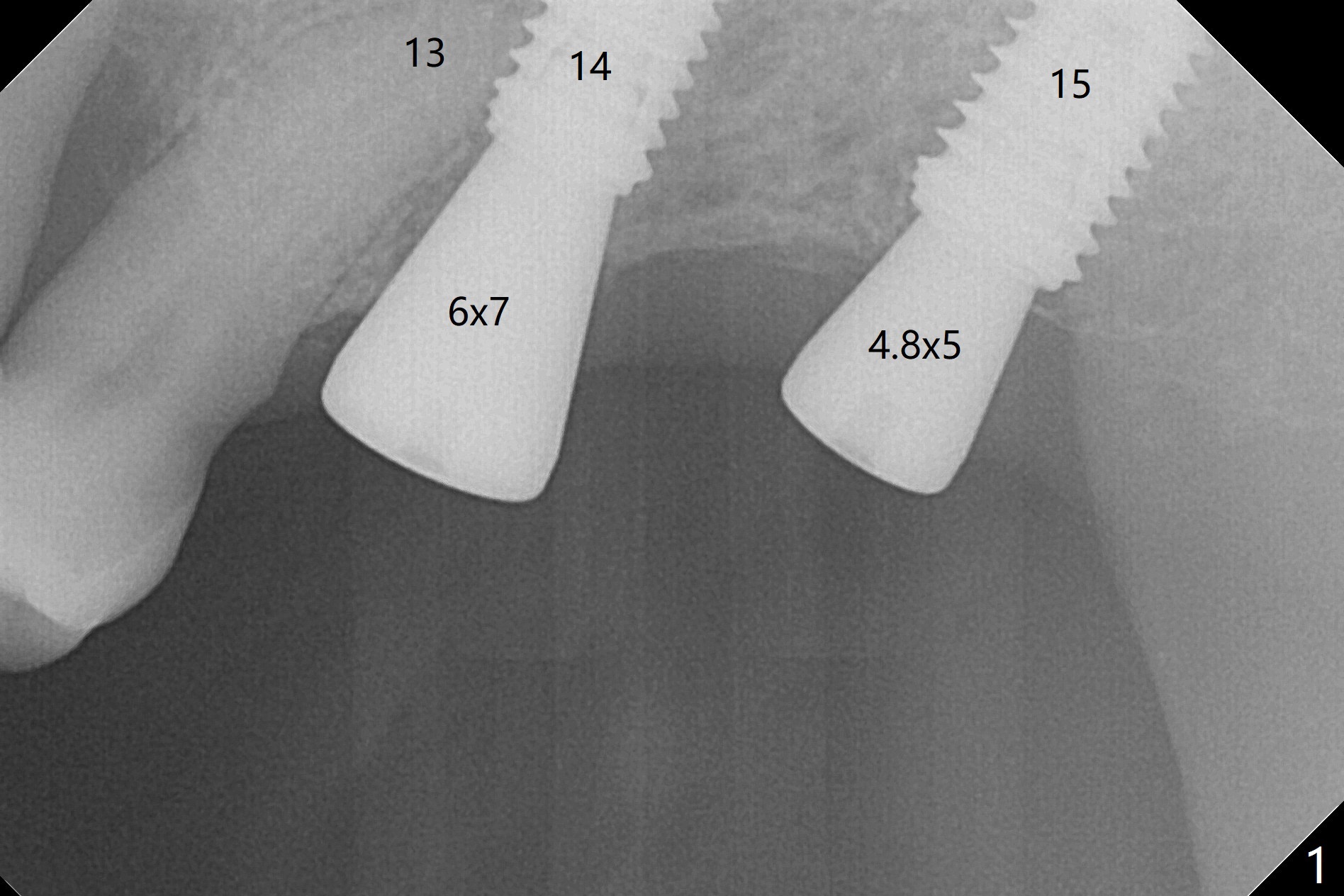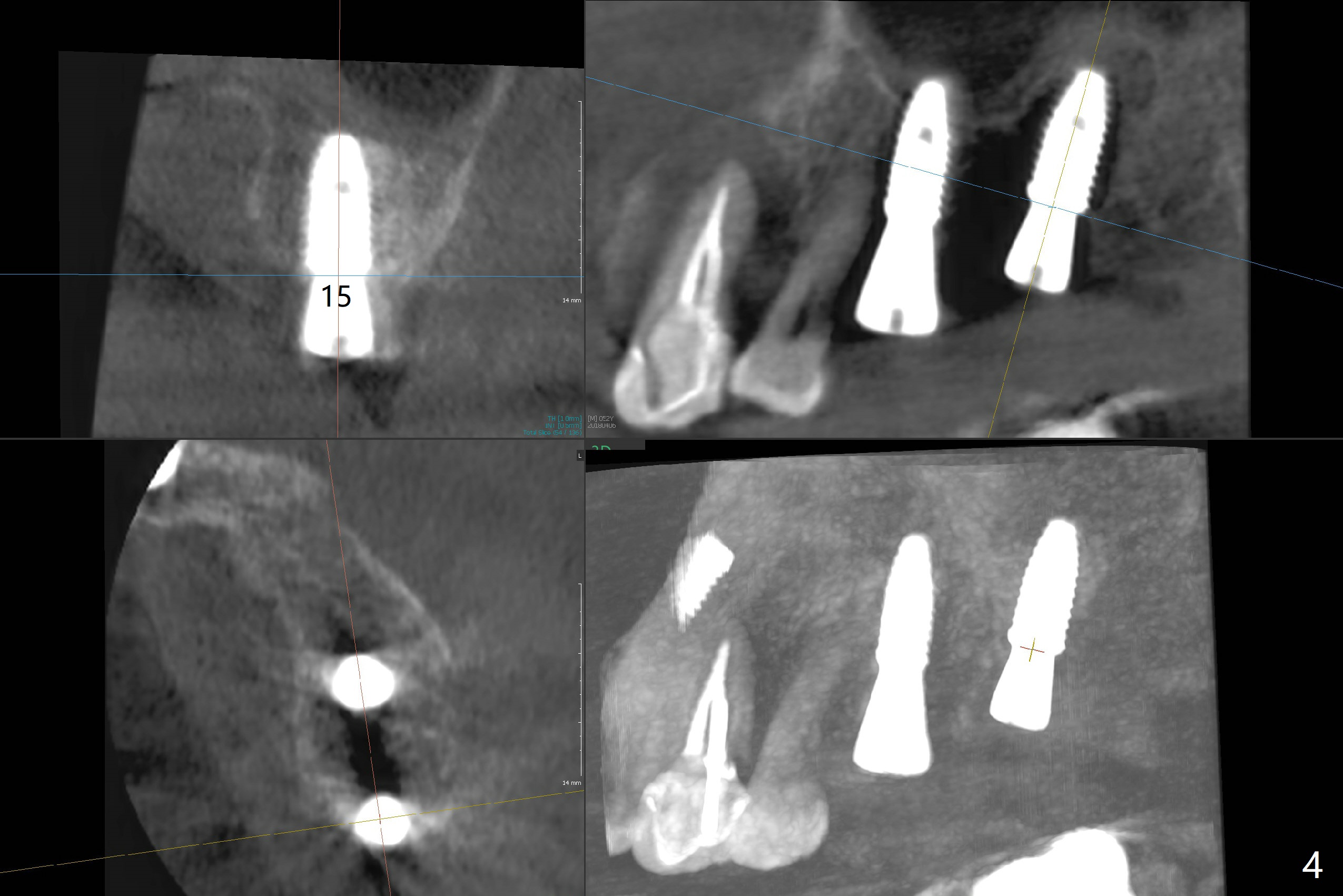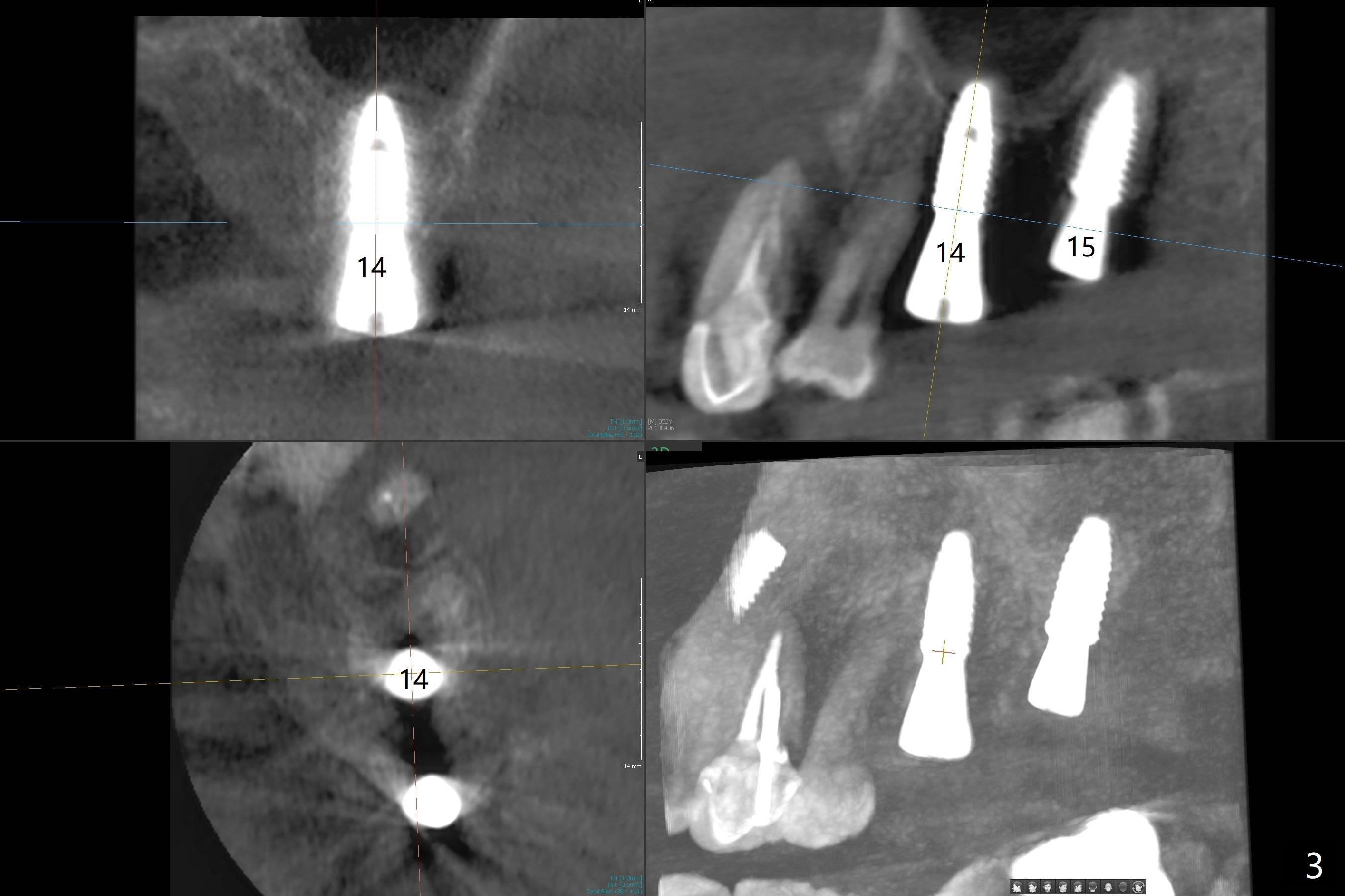 implant at #14 is close to the root of the tooth #13. Clinic exam and CBCT
