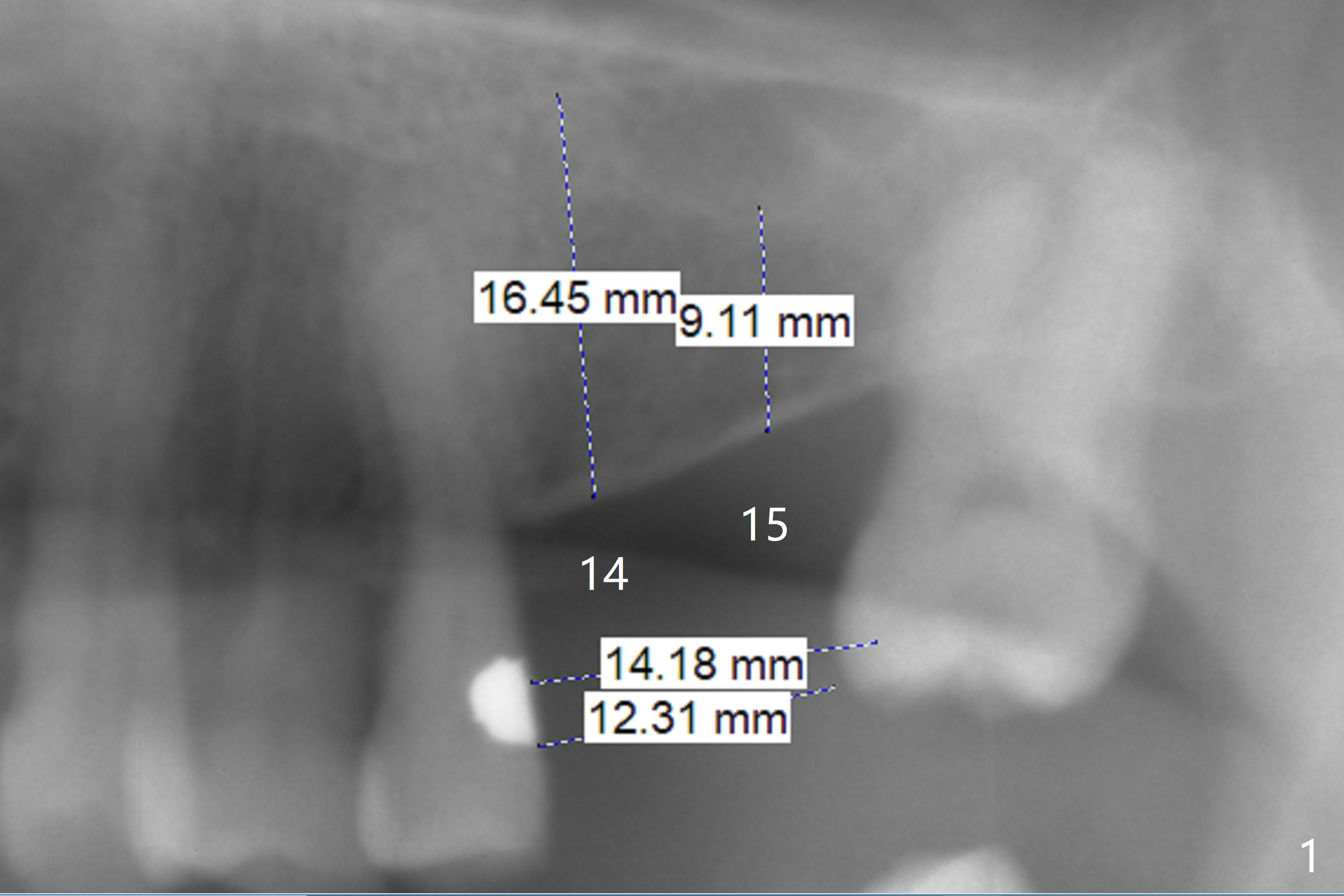 After implants at the lower incisors, the 67-year-old man requests implants at #14,15 (Fig.1). The mesiodistal edentulous space (12.31 mm) is wide one implant and apparently narrow for 2 ones. If the ridge is wide buccopalatally, consider one large or normal-sized implant. Otherwise use 2 of 1-piece 3 mm implants after mesial reduction of the tooth #16 (to 14.18 mm). Make the reduction before CT and impression for guide.