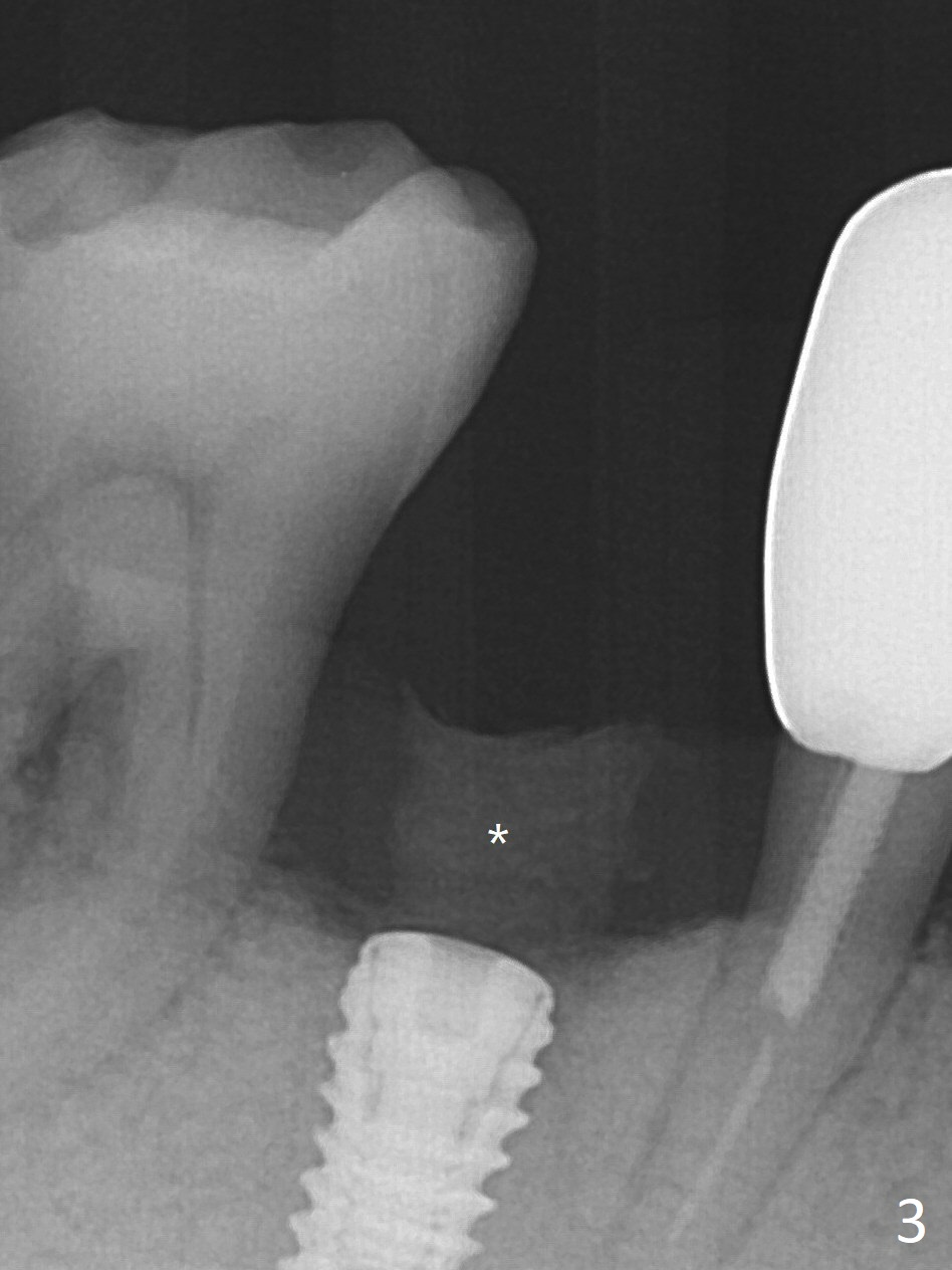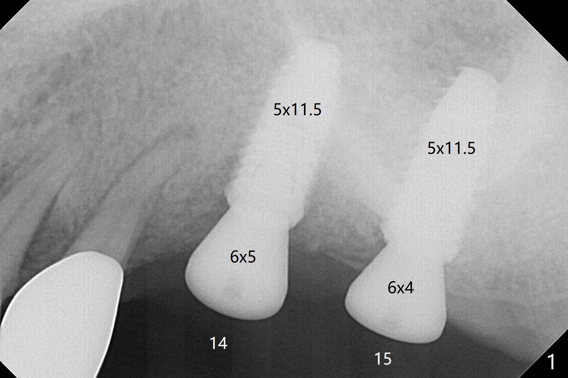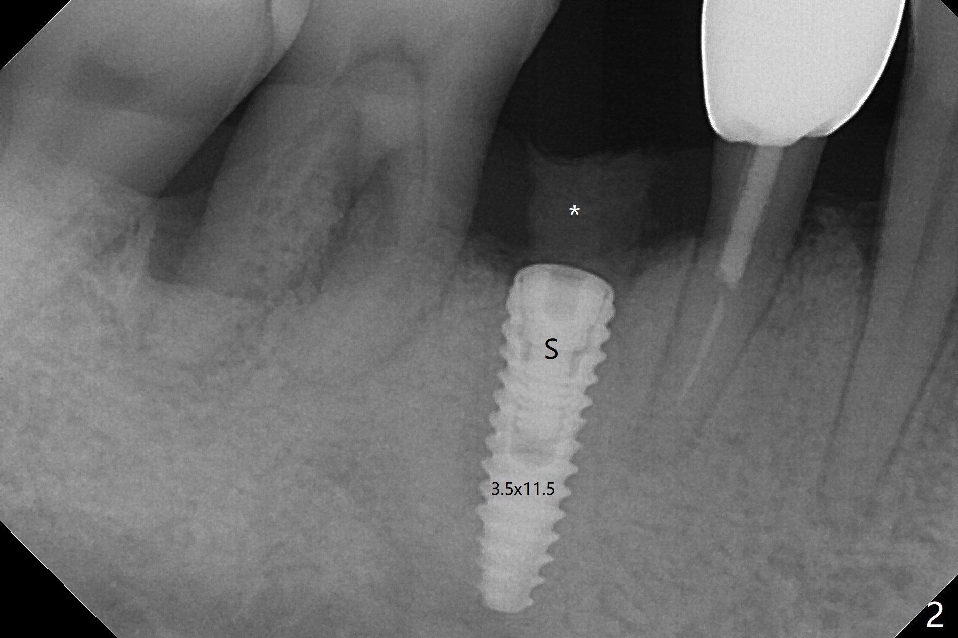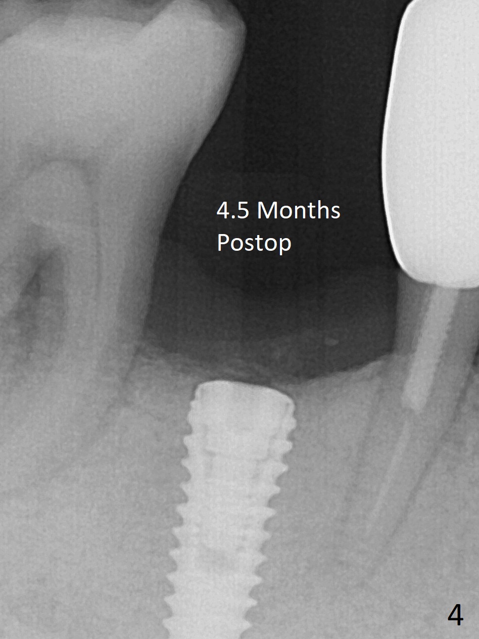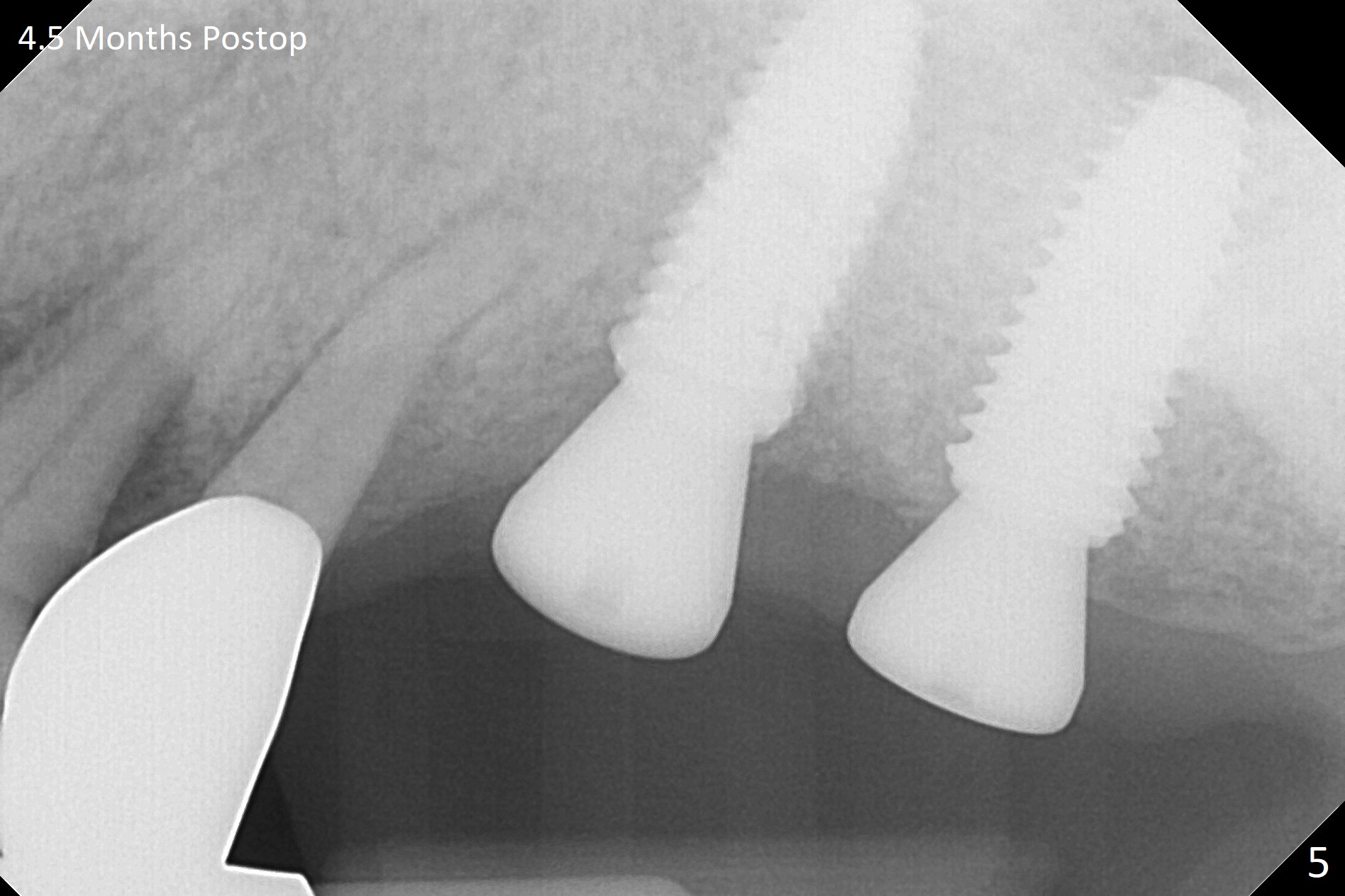 At the time of surgery, there are no 5x10 mm implants in the office for the sites of #14 and 15. Reanalysis of CT shows that there is enough bone for 11.5 mm implants. Before implant placement (Fig.1), there is no perforation of the sinus floor, as shown by probing and nasal blowing test. When a 3.5x11.5 mm implant is placed at #29 in the same appointment, it appears to be supracrestal buccal. Autogenous bone (Fig.2,3 *) is placed in the osteotomy following insertion of a healing screw (S). Periodontal dressing is applied, but it is dislodged after dinner. In fact there is bone coronal to the implant 4.5 months postop (Fig.4), which is confirmed during uncover procedure. There is no abnormality at #14 or 15 4.5 months postop (Fig.5). Impression is taken following extraction of the abnormally shifted opposing tooth #18.