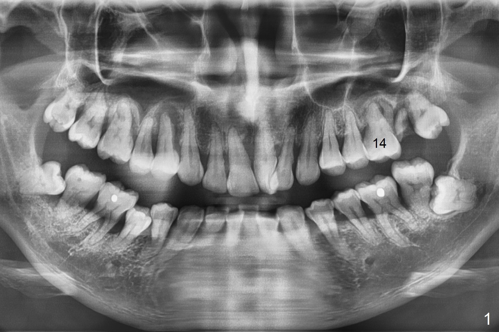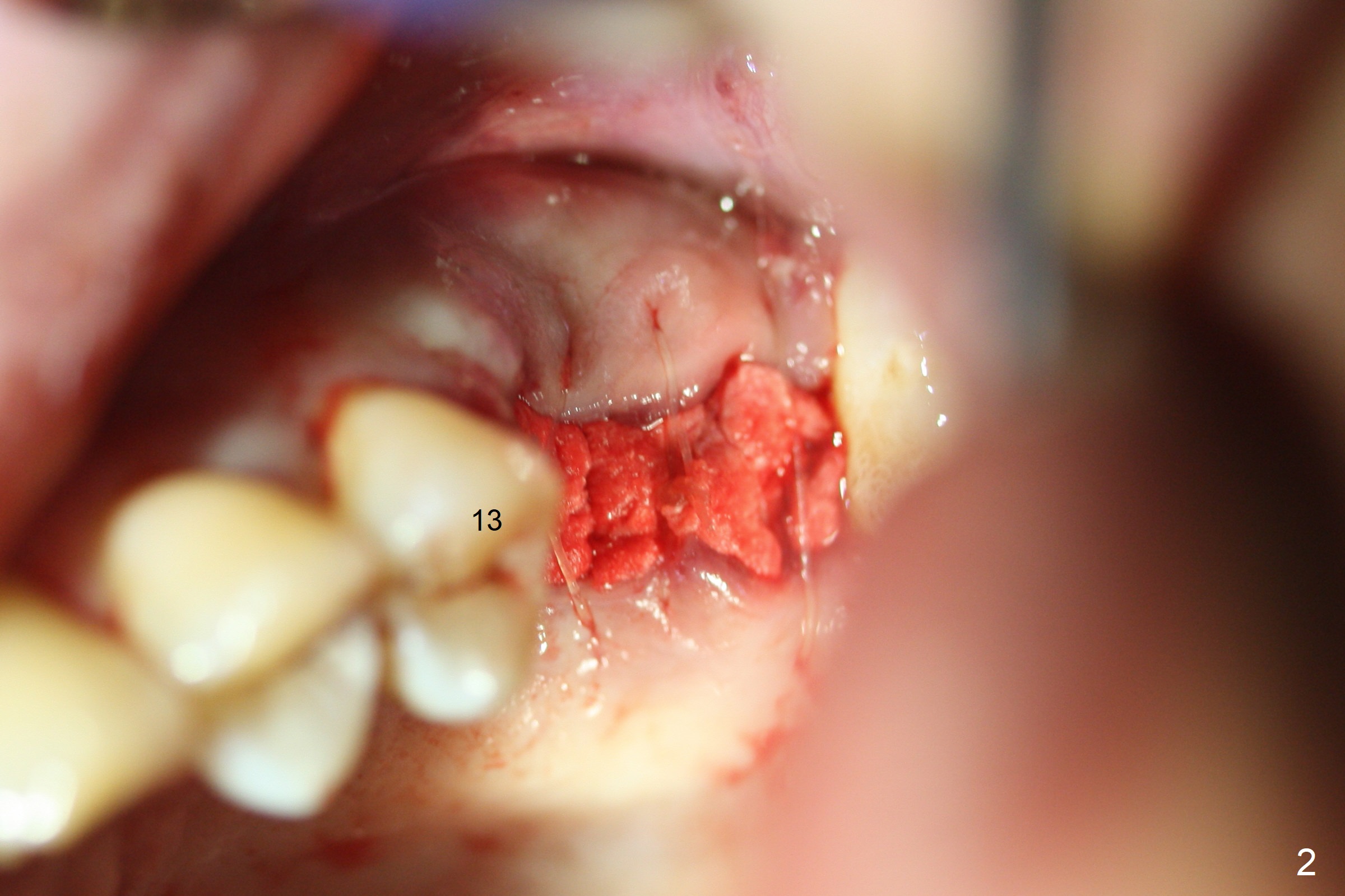 A 34-year-old man (smoker (4 cigarettes per day)) has advanced periodontitis (Fig.1). After upper quadrant SRP, the teeth #14 and 15 are extracted with removal of granulation tissue from #14 palatal socket. Following copious irrigation with NS, a 10x20 mm Osteogen plug is inserted into #14 and 15 sockets. The plug is fixed in place with 4-0 Chromic Gut suture (2 of figure-8 fashion, Fig.2).