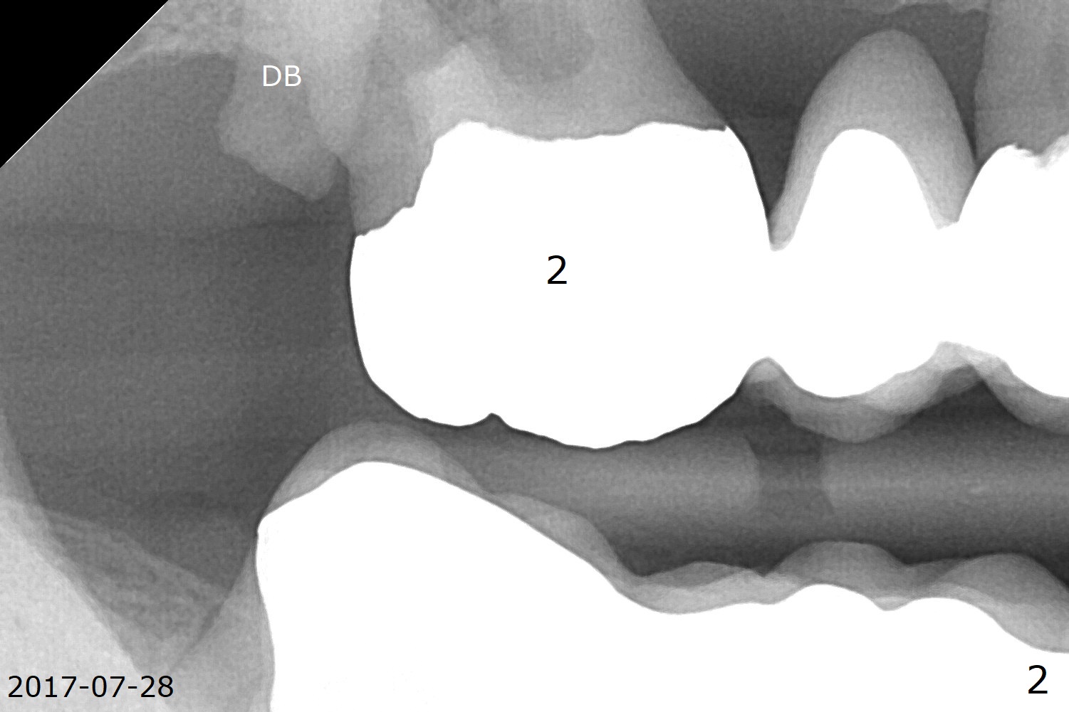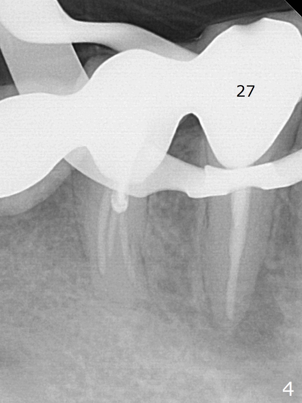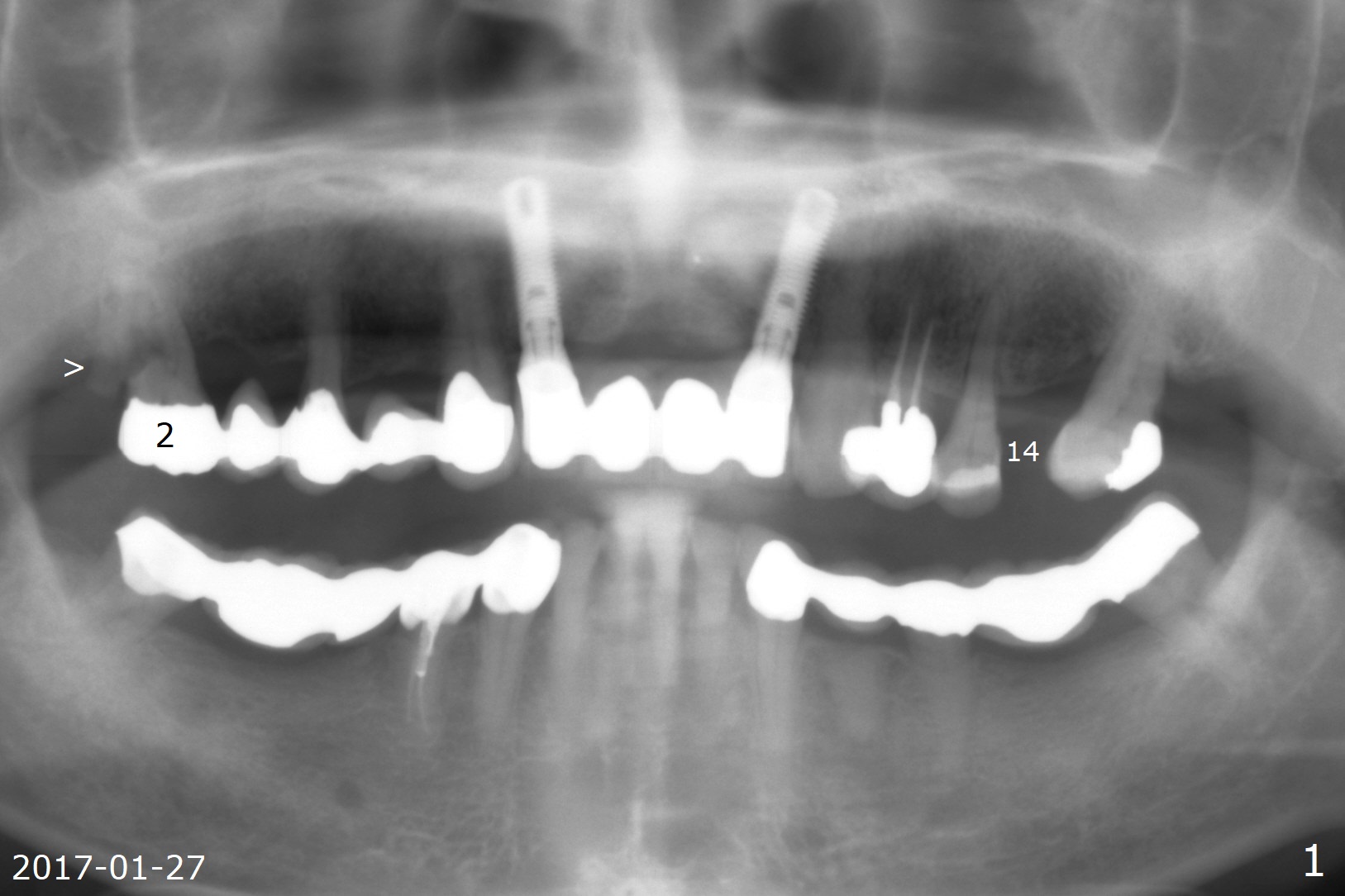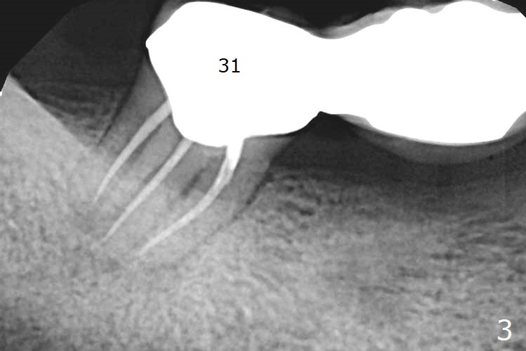 A 66-year-old man has asymptomatic distobuccal (DB) root fracture for ~ 3 years (Fig.1 (>) 2). After #14 implant with limited (M) ortho and 27 and 31 RCT (Fig.3,4), he agrees to have #2 and 3 implants. The tooth #2 has palatal fistula and is tender. Take preop photos. CT should reveal extensive bone loss. Use PRF/sticky bone or GEM21S (if venopuncture is hard) for repair. Save bone from #3 osteotomy for #2 bone graft. Use a special suction with trap after granulation tissue removal.
