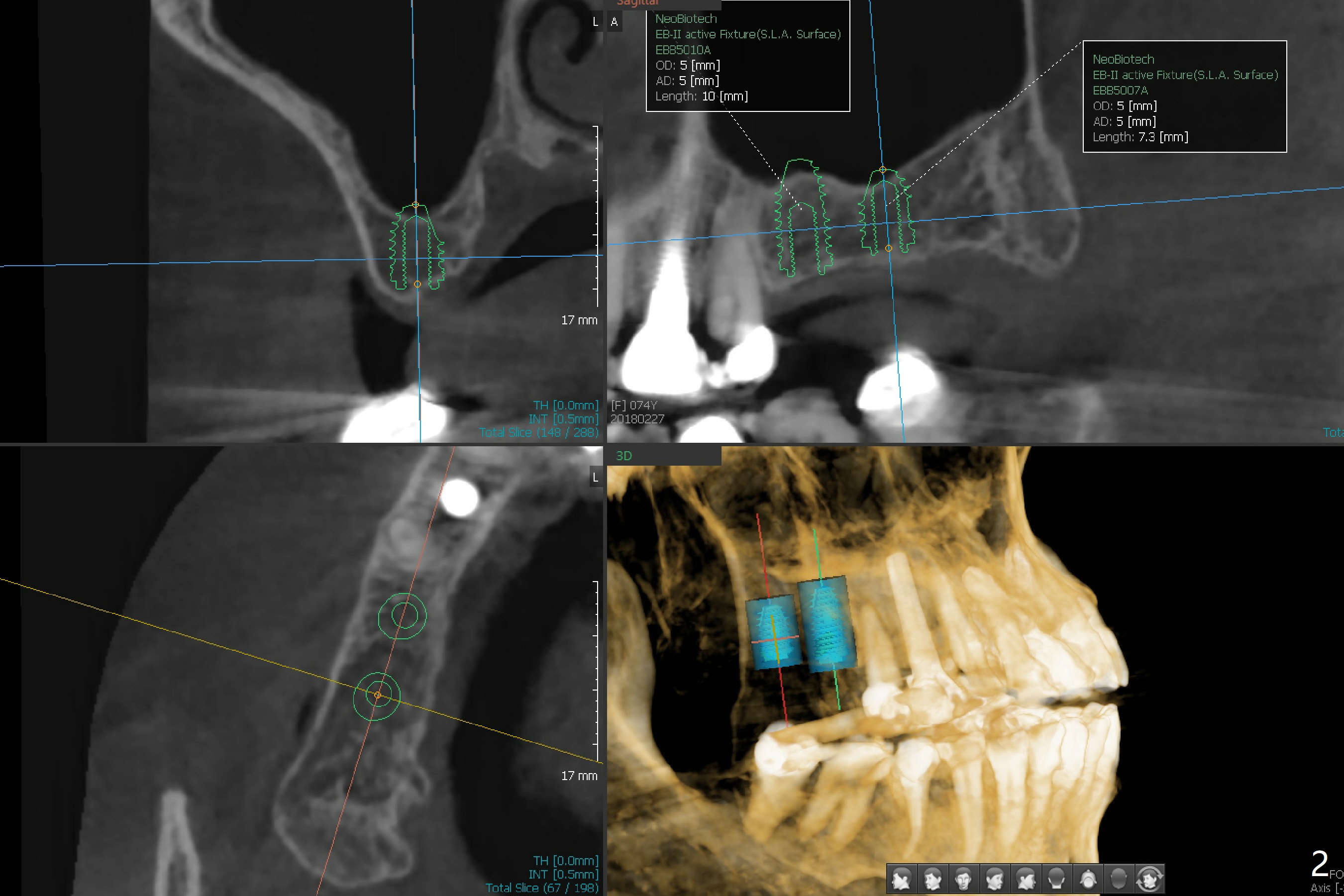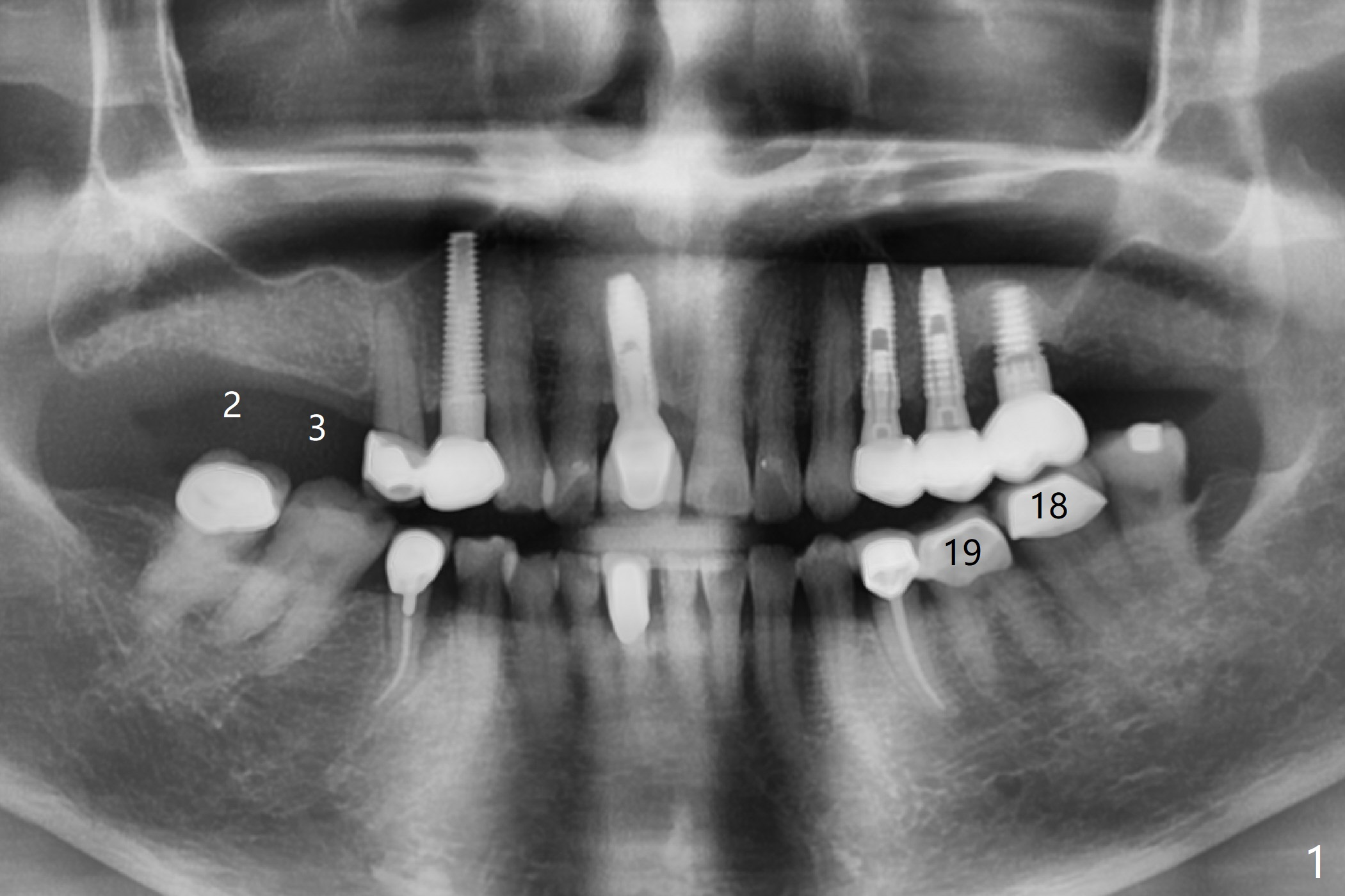 A 74-year-old woman needs cementation at #18 and 19 because of missing teeth at #2 and 3 (Fig.1). It will be efficient to place 2 implants with guided surgery. A challenge is limited bone height (Fig.2); sinus lift is required. After finishing osteotomy, remove the guide for sinus lift using Sinus Lift Master kit. Return the guide and finish implant placement.