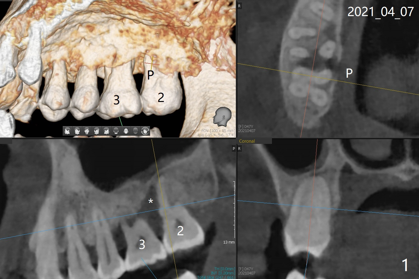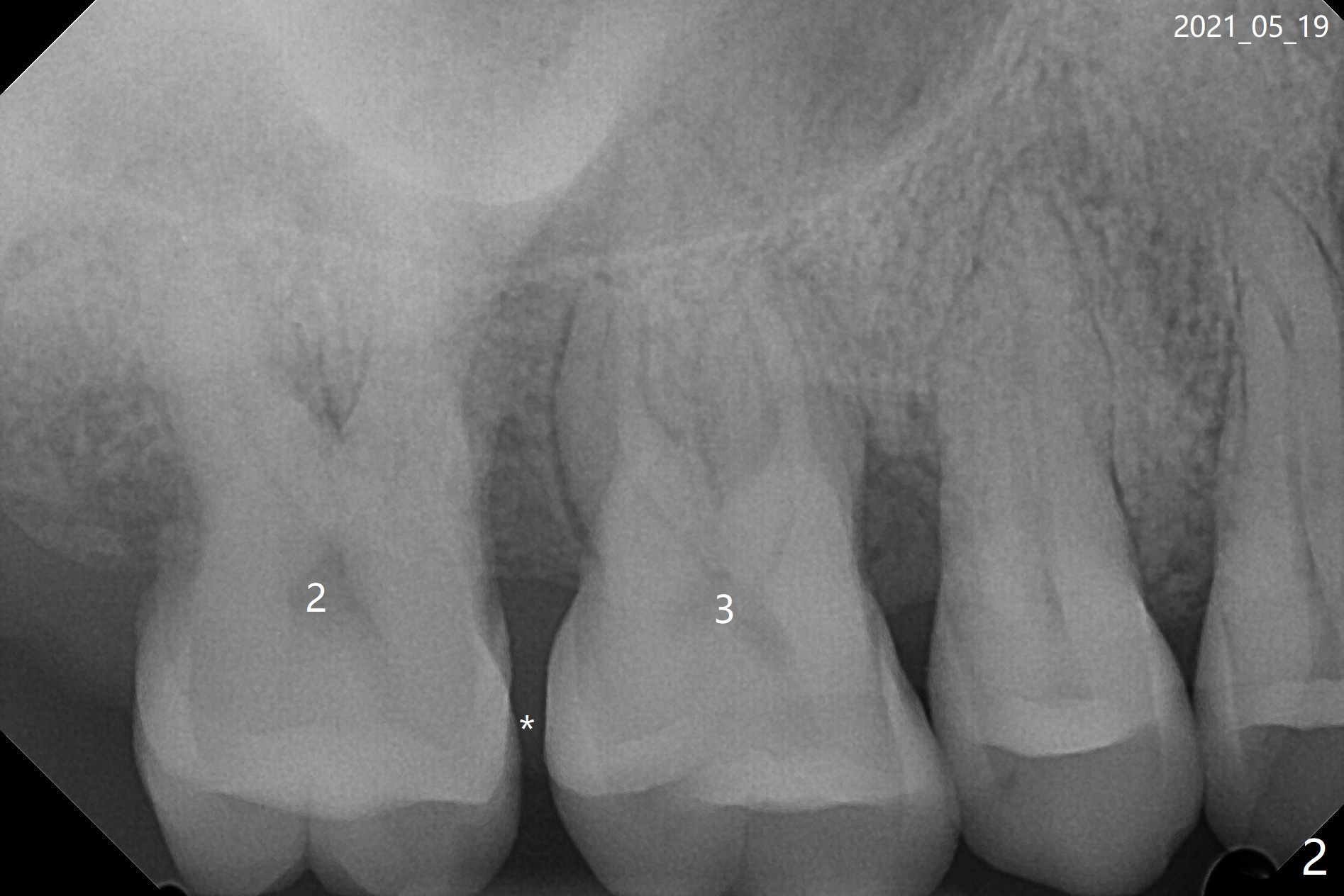 47岁女31号牙即刻种植术后一个月,2,3之间牙周炎发作(图一,二),局麻下,再次局部深些(四个月后),放置Arestin。
