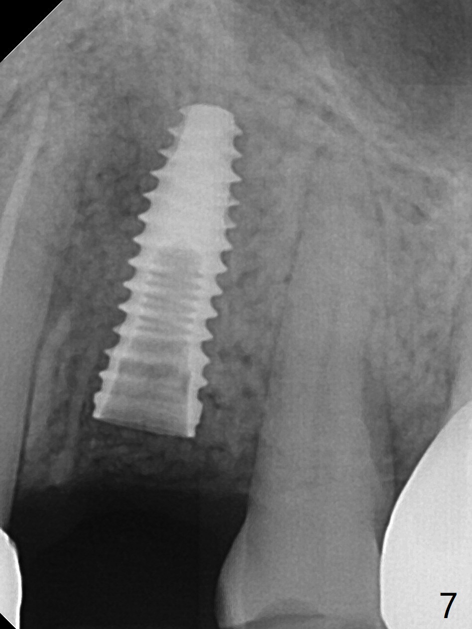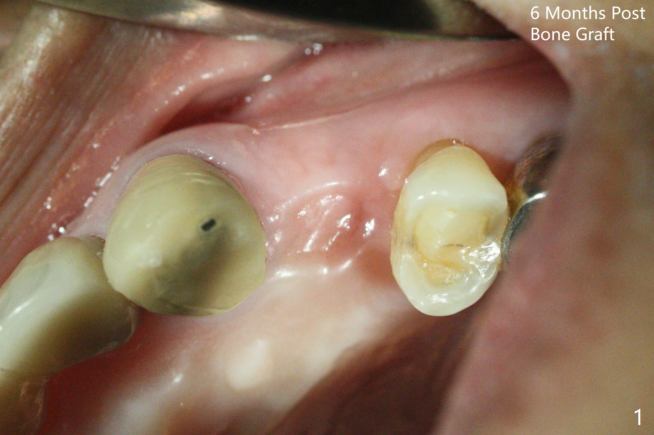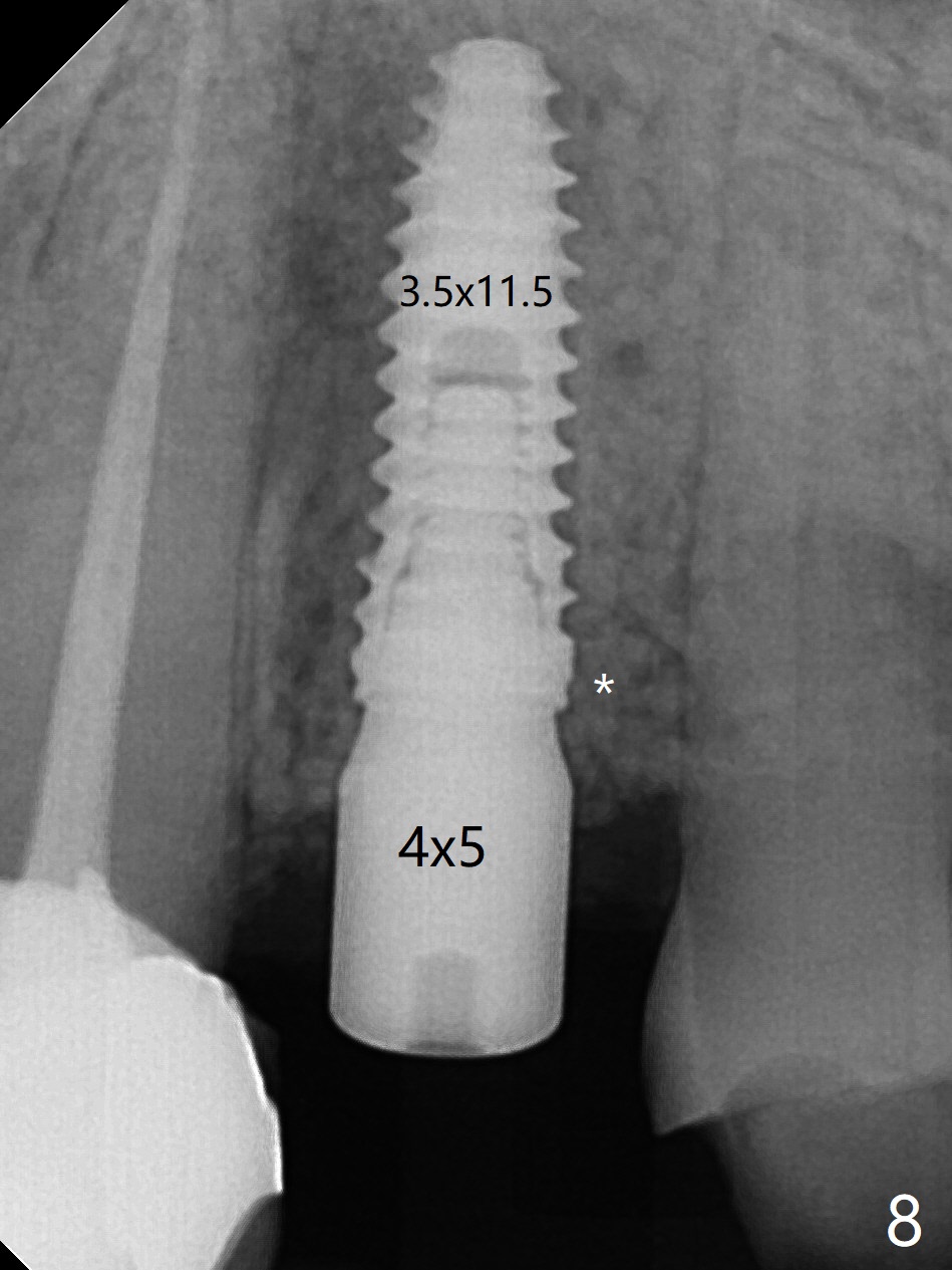 植骨后6个月牙槽窝愈合正常,角化龈和牙槽嵴都宽(图一),导板种植好像不需要切口。利用导板植入,但是离尖牙牙根很近(图二,三)。取出植体后,准备切开改变钻洞方向(图四,五),结果效果不错(图六,七),腭侧骨壁低,安置愈合基台,植骨(图八:*),覆盖胎盘膜,缝合。