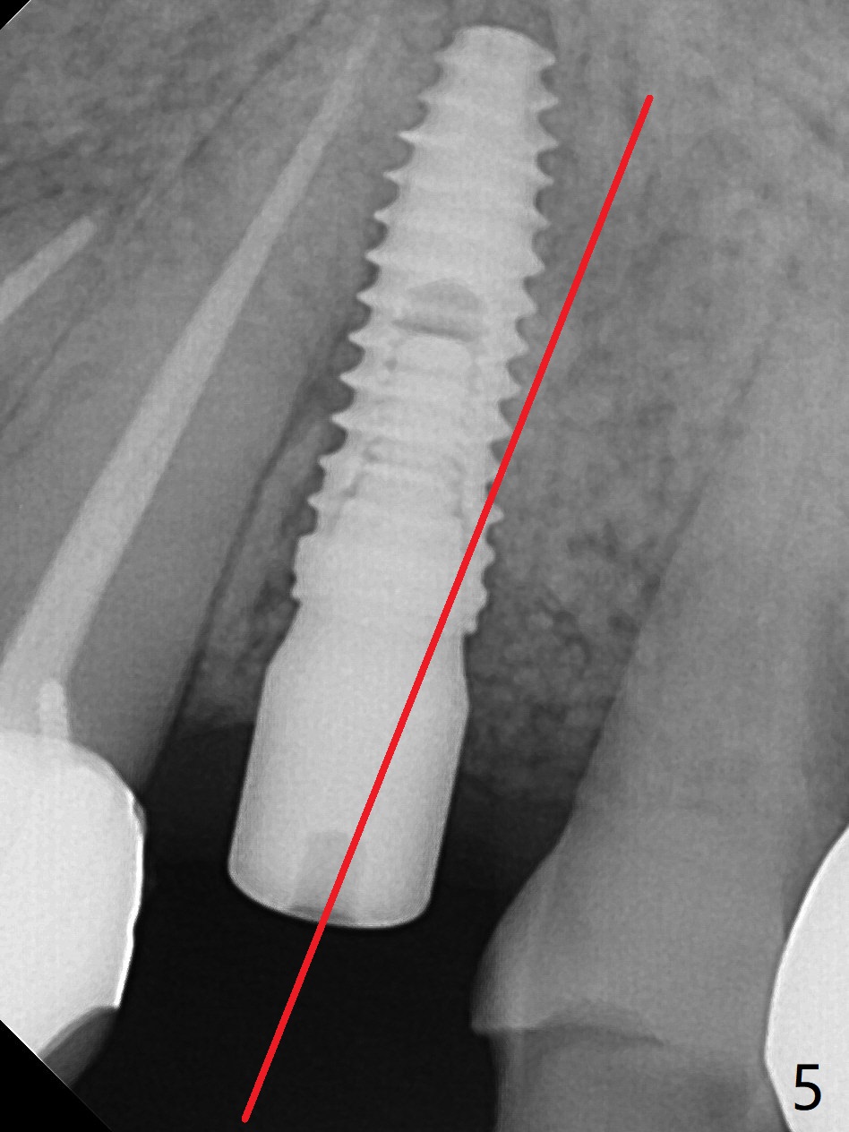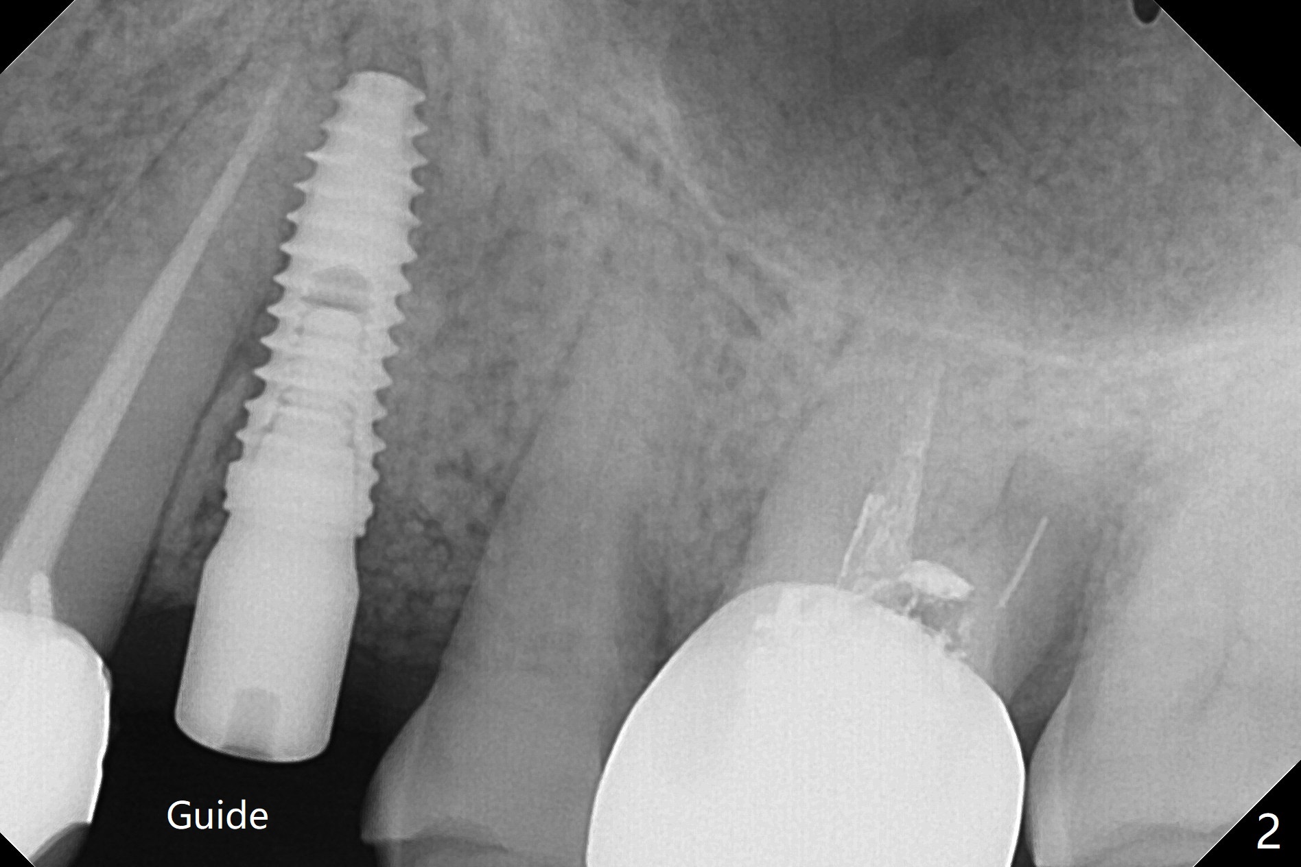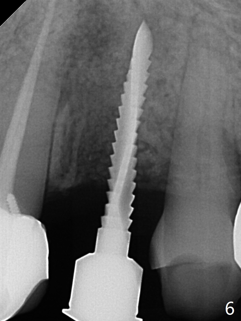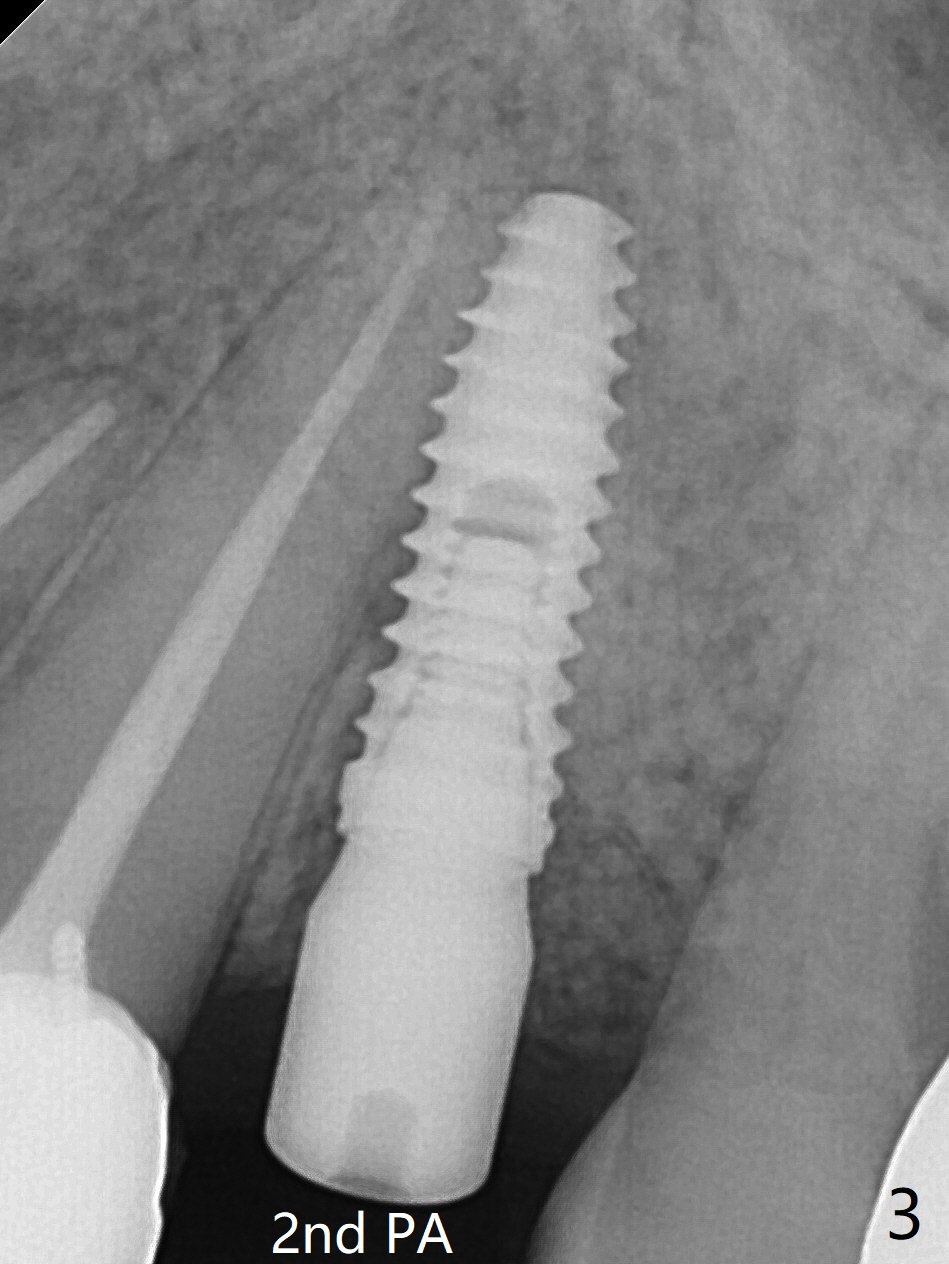 植骨后6个月牙槽窝愈合正常,角化龈和牙槽嵴都宽(图一),导板种植好像不需要切口。利用导板植入,但是离尖牙牙根很近(图二,三)。取出植体后,准备切开改变钻洞方向(图四,五),结果效果不错(图六,七),腭侧骨壁低,安置愈合基台,植骨(图八:*),覆盖胎盘膜,缝合。