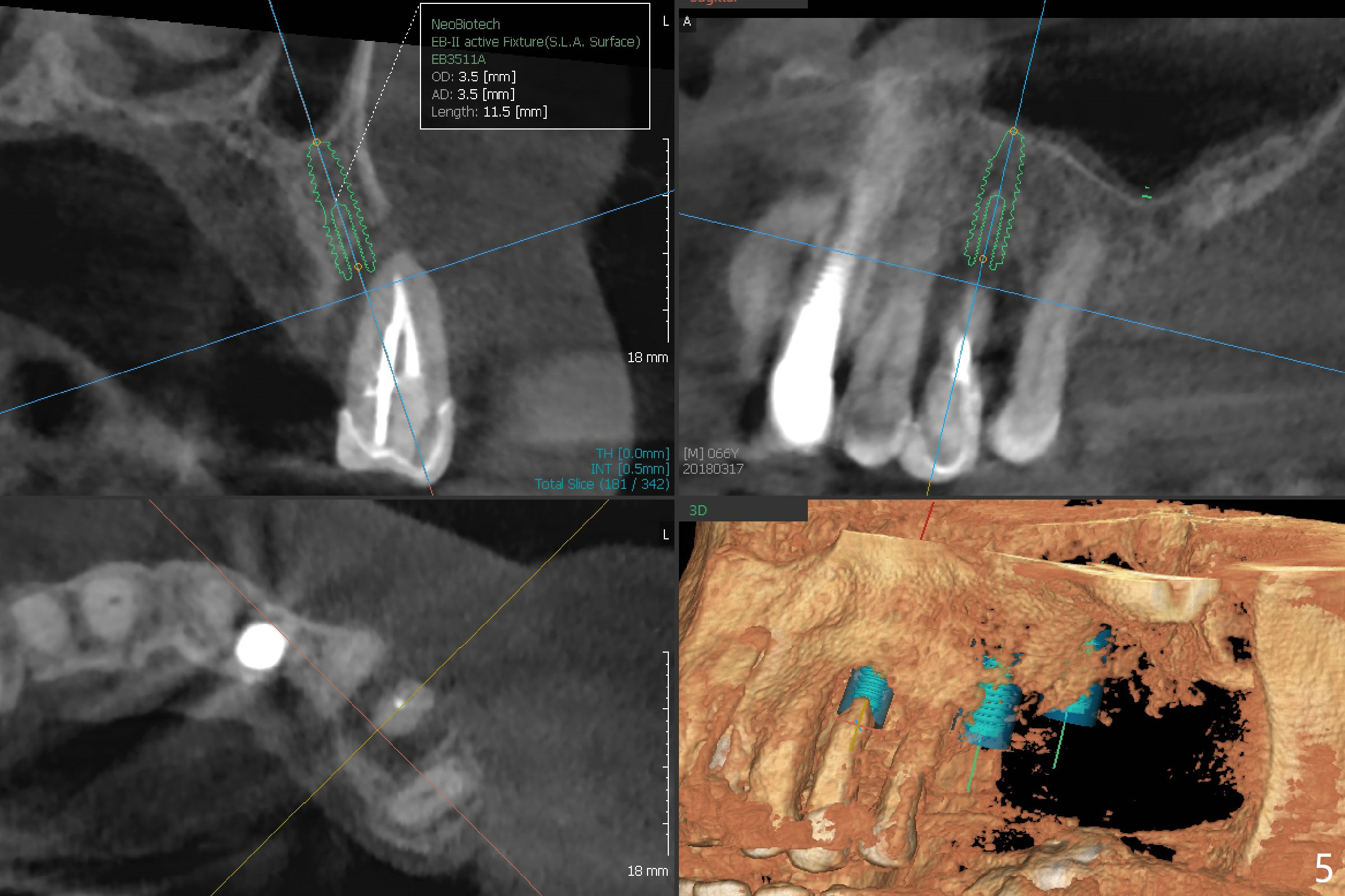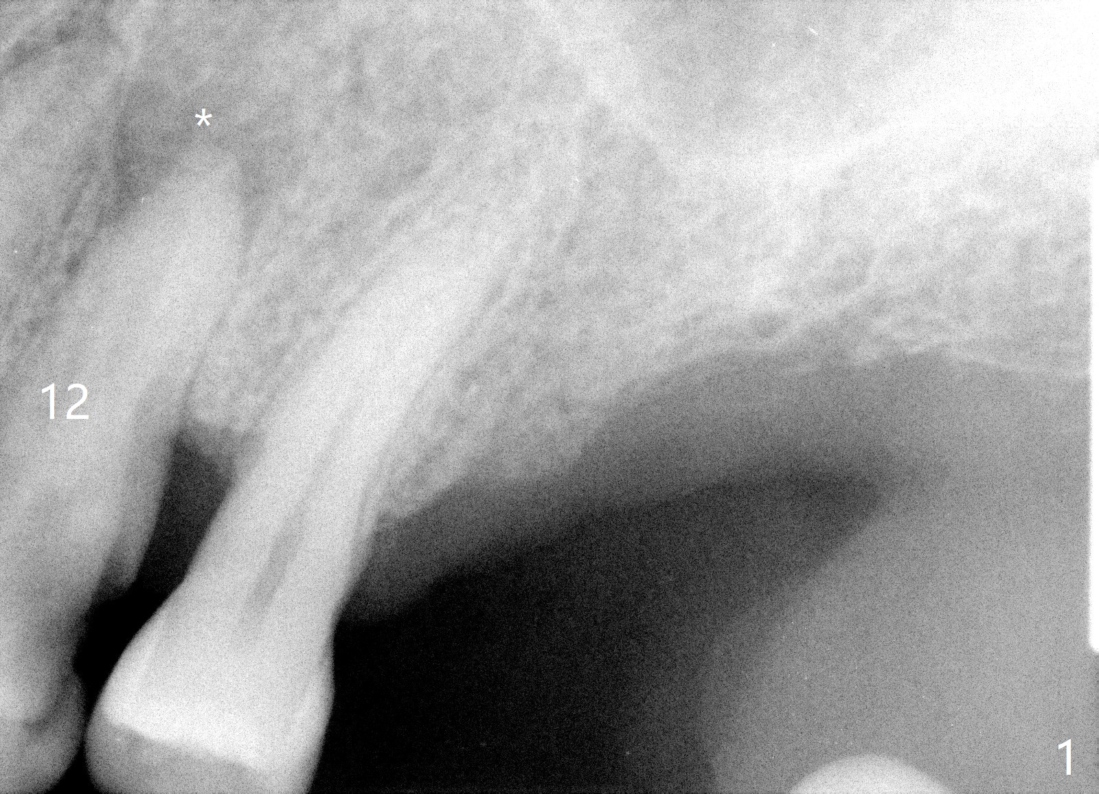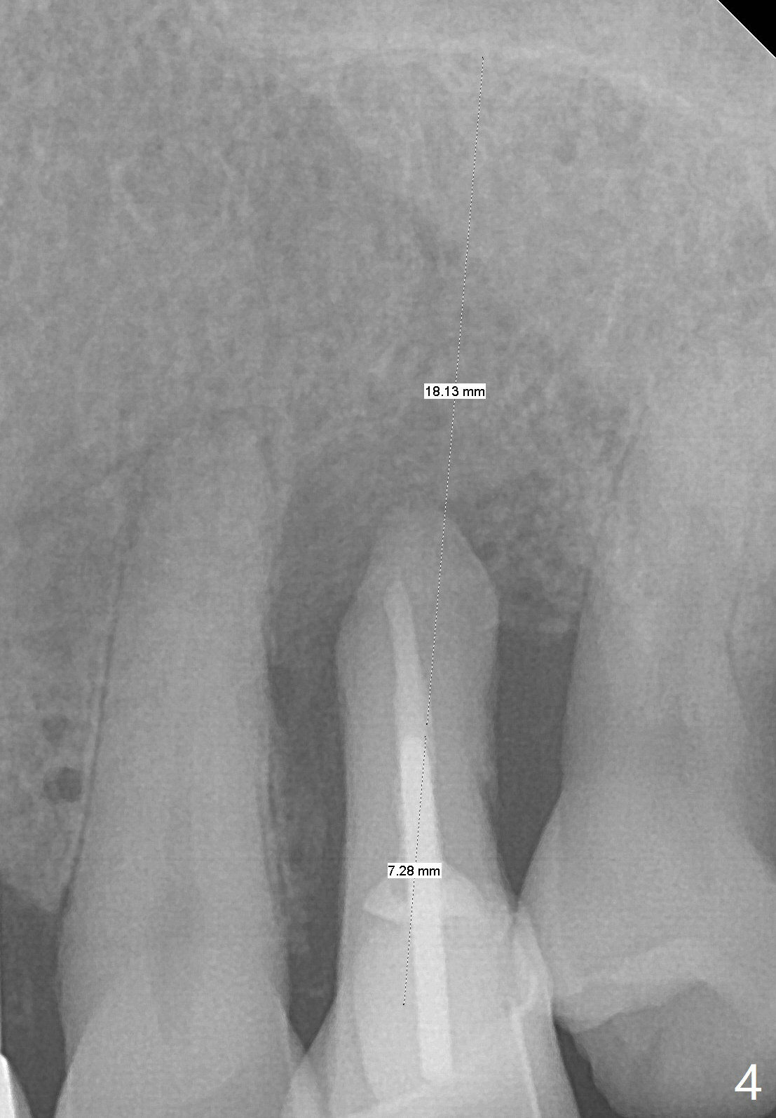 A 61-year-old man with chronic periodontitis presented to clinic for several implant placement (#3 10 14/15 18 30). For the tooth #12 (Fig.1), RCT was rendered (Fig.2). The tooth is non-salvageable 4.5 years post-treatment (Fig.3). Uneven bone loss mesiodistally makes implant placement challenging (Fig.4). A long implant will be used with ~3 mm subcrestal (mesially) and ~3 mm supracrestal (distally). A 3.5 or 4.0x13 mm implant will be placed subcrestal palatally and supracrestal buccally (Fig.5).