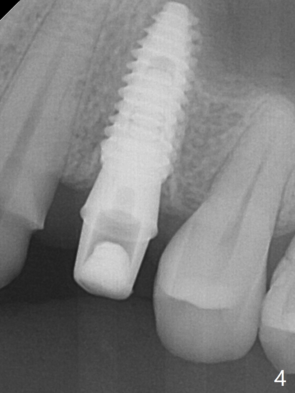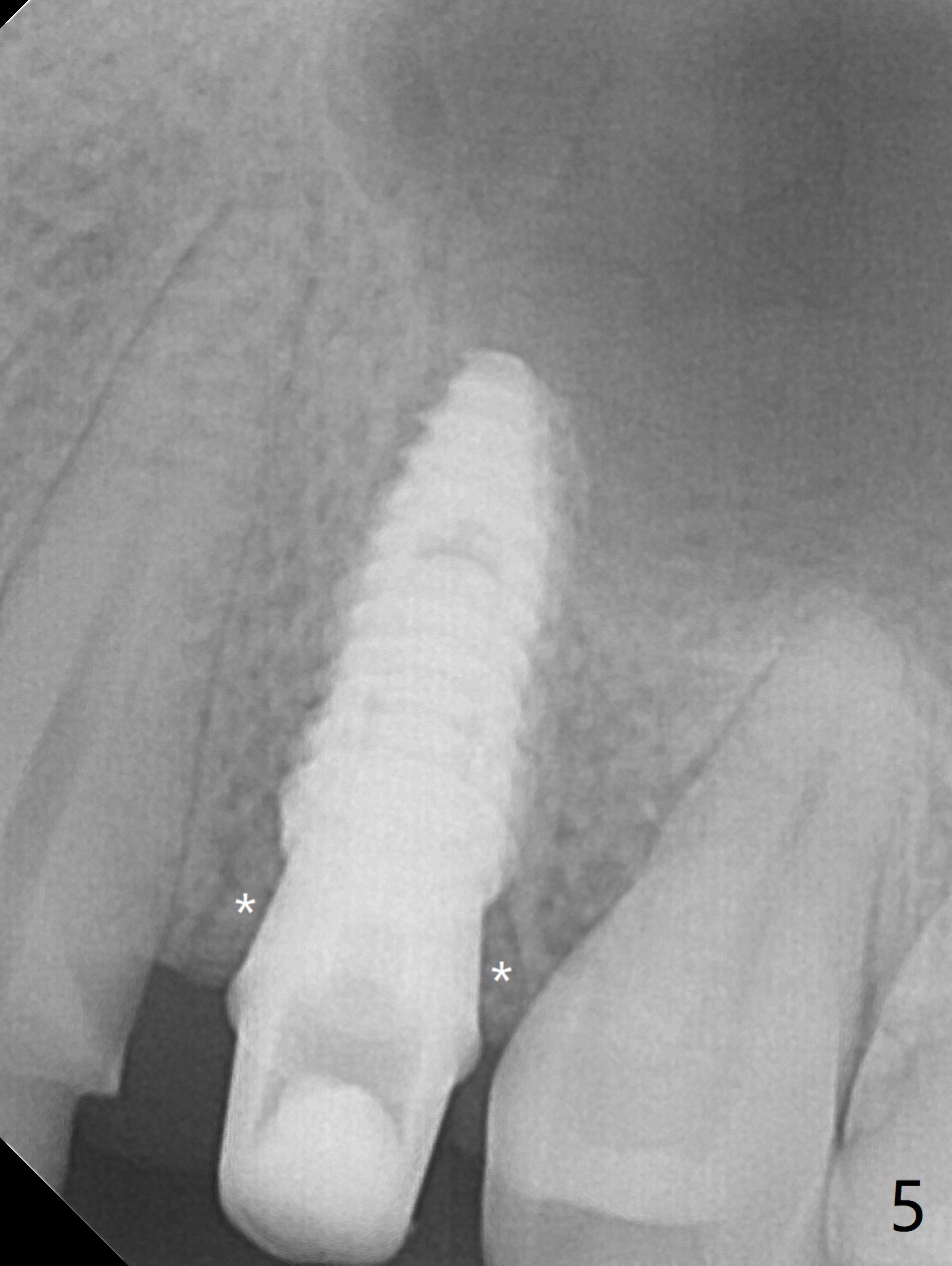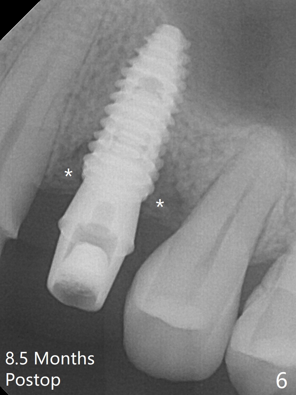 After extraction of the residual roots at #12 and crown prep at #11, osteotomy at #12 is established with Pointed Lindamann bur and 2.2 mm bur for ~ 15 mm. There feels to be sinus floor perforation; a parallel pin is inserted deeper than expected (Fig.1), but there is no membrane perforation. Following sequential osteotomy, a 4x10 mm dummy implant is placed partially with stability (Fig.2). When the same sized definitive implant is placed subcrestally (Fig.3-5 (*: Vera Graft)), the stability remains (~60 Ncm) in spite of the fact that the trajectory is changed once. The coronal socket does not seem to heal 8.5 months postop, in part due to poor hygiene of splinted provisional (Fig.6).