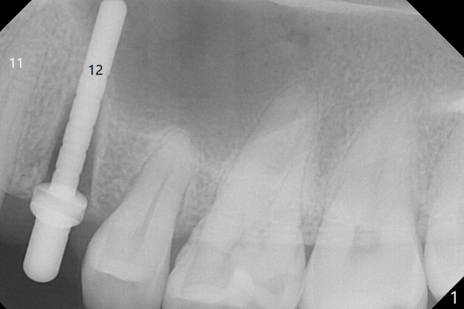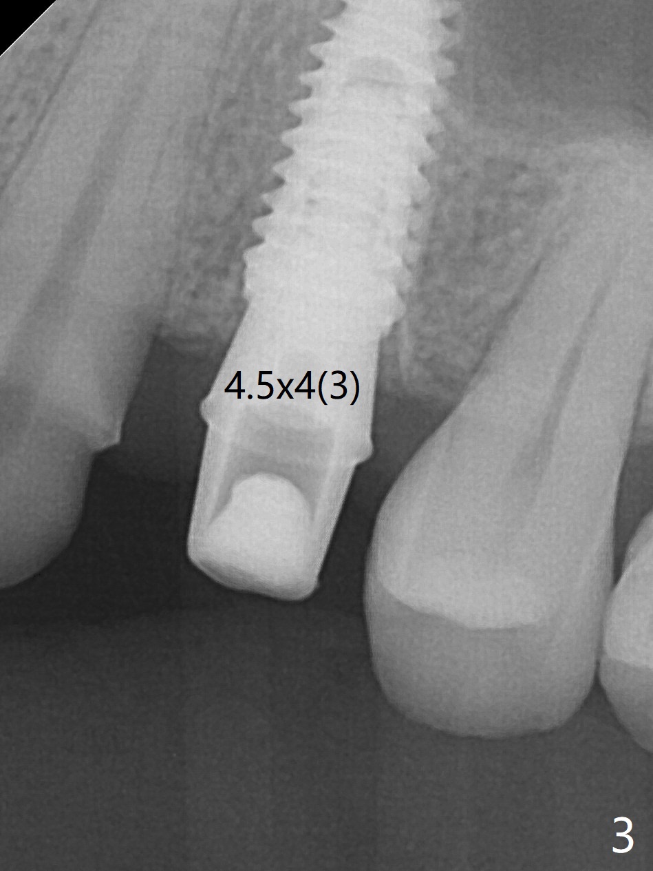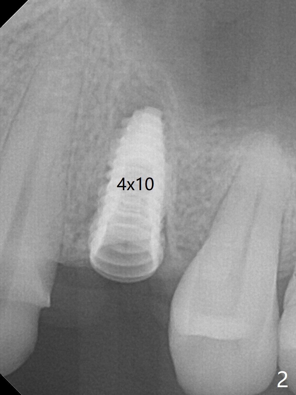 After extraction of the residual roots at #12 and crown prep at #11, osteotomy at #12 is established with Pointed Lindamann bur and 2.2 mm bur for ~ 15 mm. There feels to be sinus floor perforation; a parallel pin is inserted deeper than expected (Fig.1), but there is no membrane perforation. Following sequential osteotomy, a 4x10 mm dummy implant is placed partially with stability (Fig.2). When the same sized definitive implant is placed subcrestally (Fig.3-5 (*: Vera Graft)), the stability remains (~60 Ncm) in spite of the fact that the trajectory is changed once. The coronal socket does not seem to heal 8.5 months postop, in part due to poor hygiene of splinted provisional (Fig.6).
