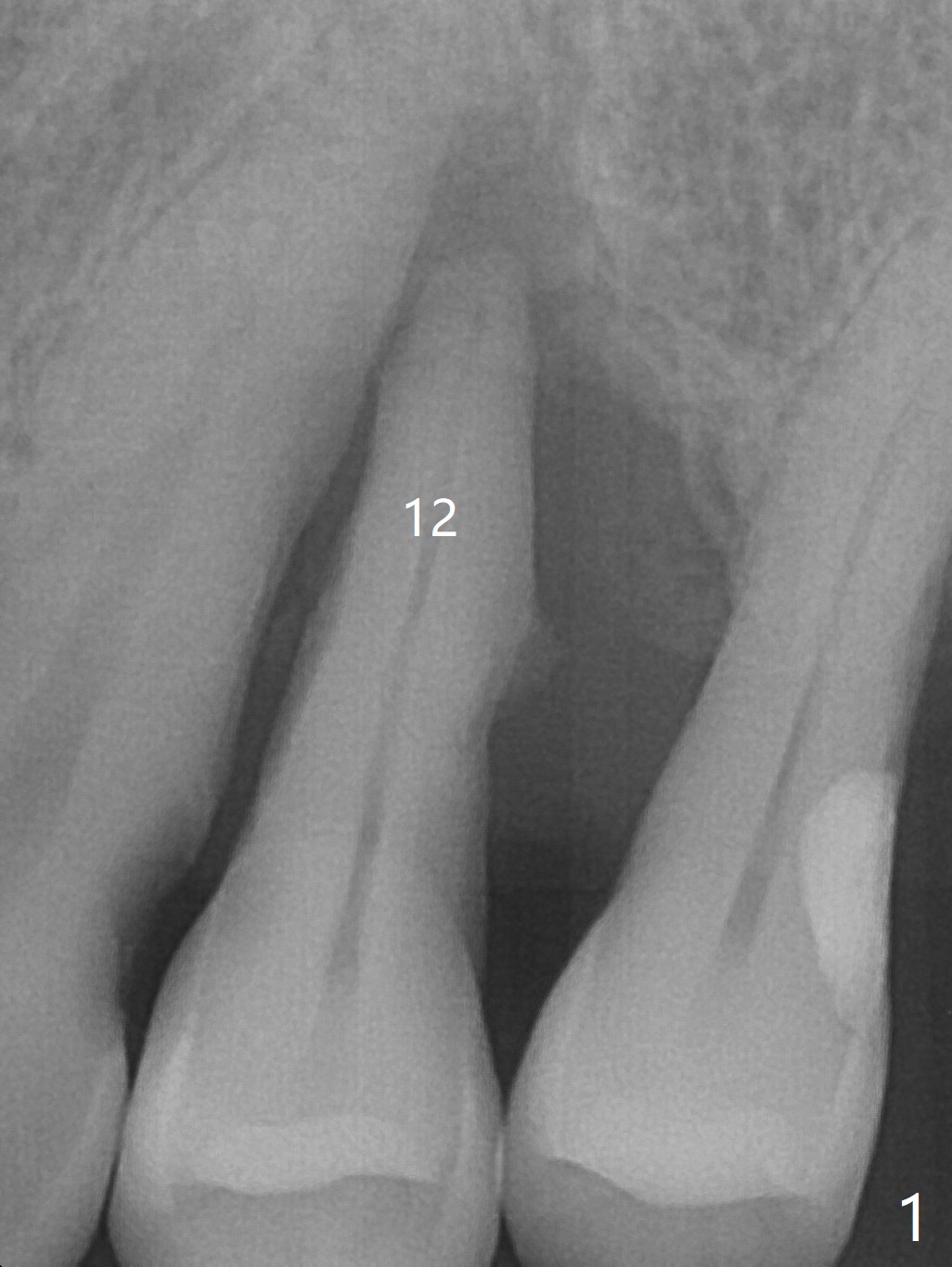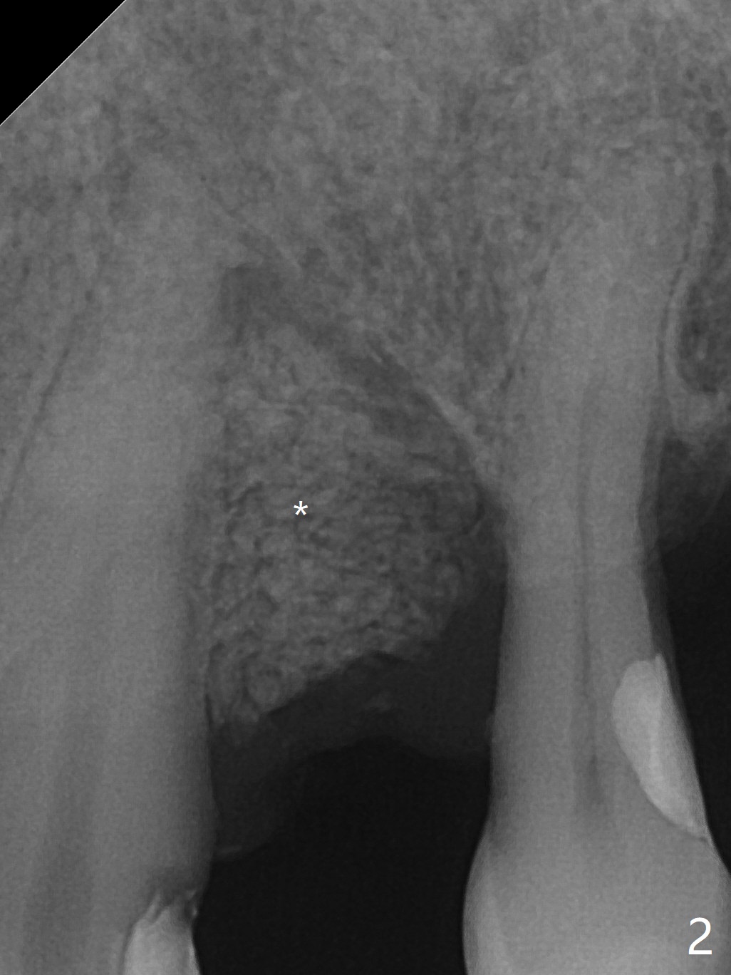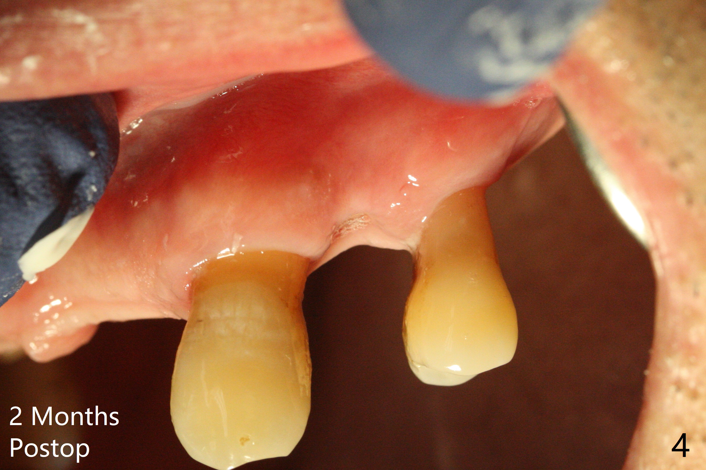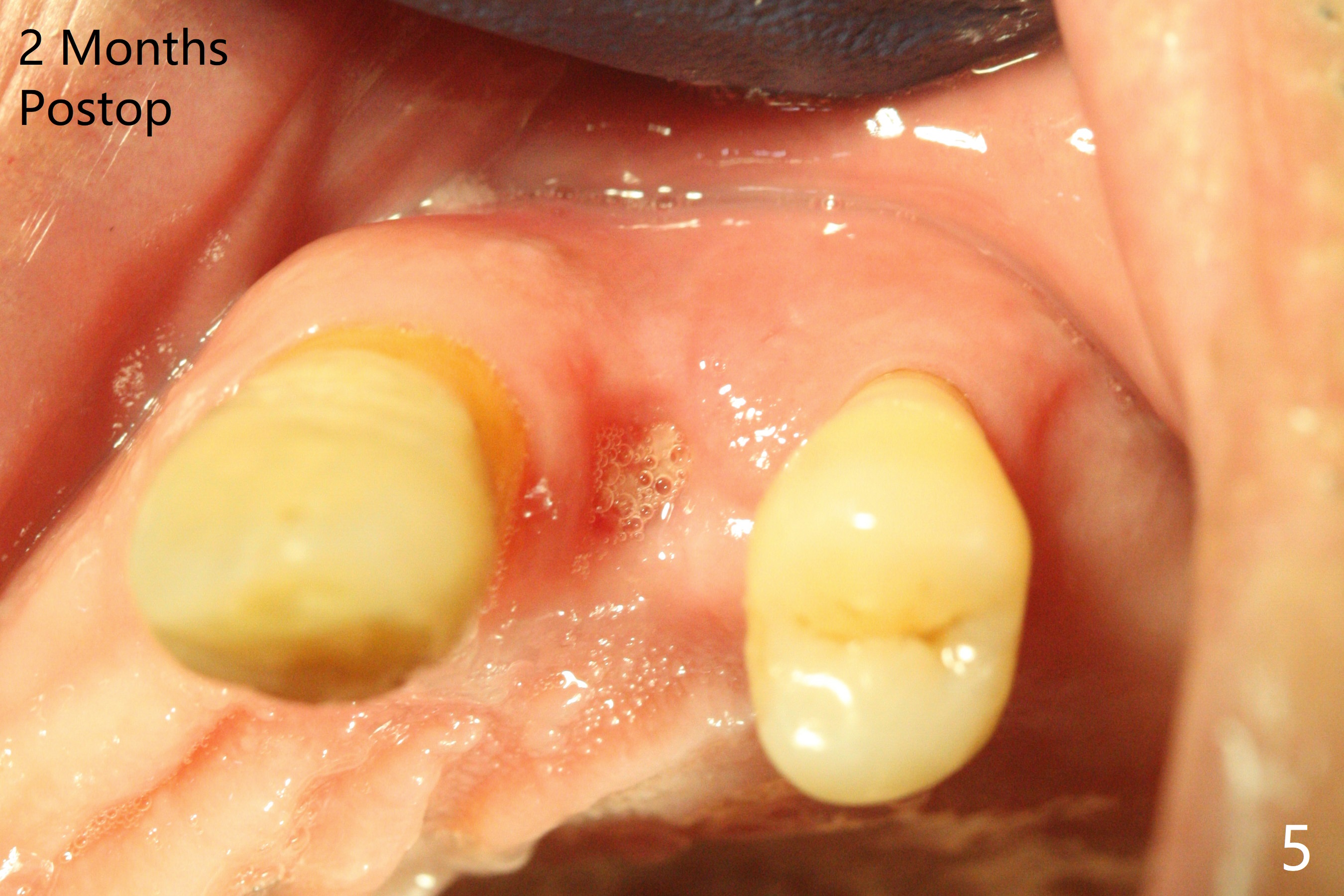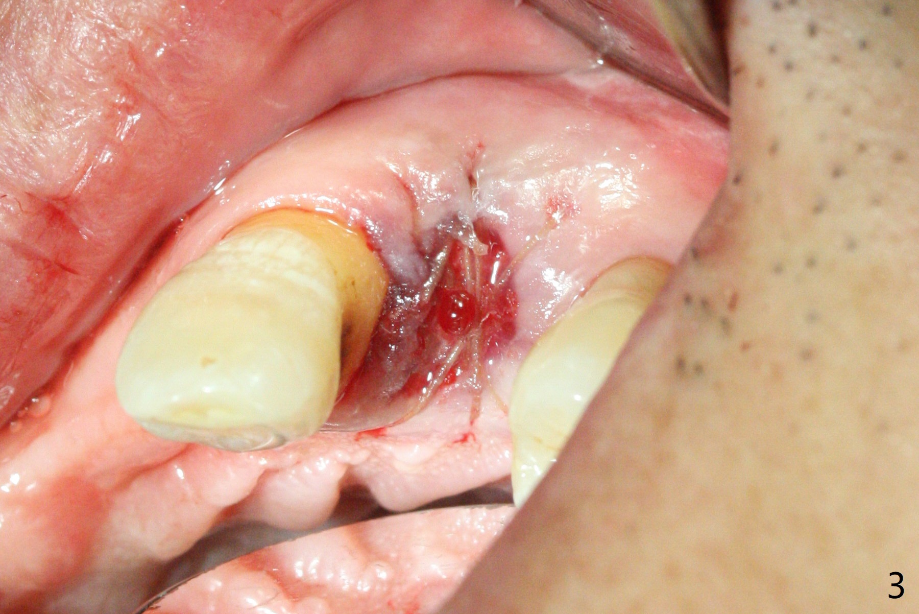 A 55-year-old man has been our patient intermittently for the last 15 years. Before removal of the tooth #12 with loss of the buccal plate (Fig.1), he requests bone graft for the health (strength) of the neighboring teeth (Fig.2 *). To keep the 6-month membrane in place longer, periodontal glue is used after suturing (Fig.3 (blue)). There is buccal collapse 2 months post socket preservation (Fig.4,5). Titanium mesh or Cytoplast should have been placed.