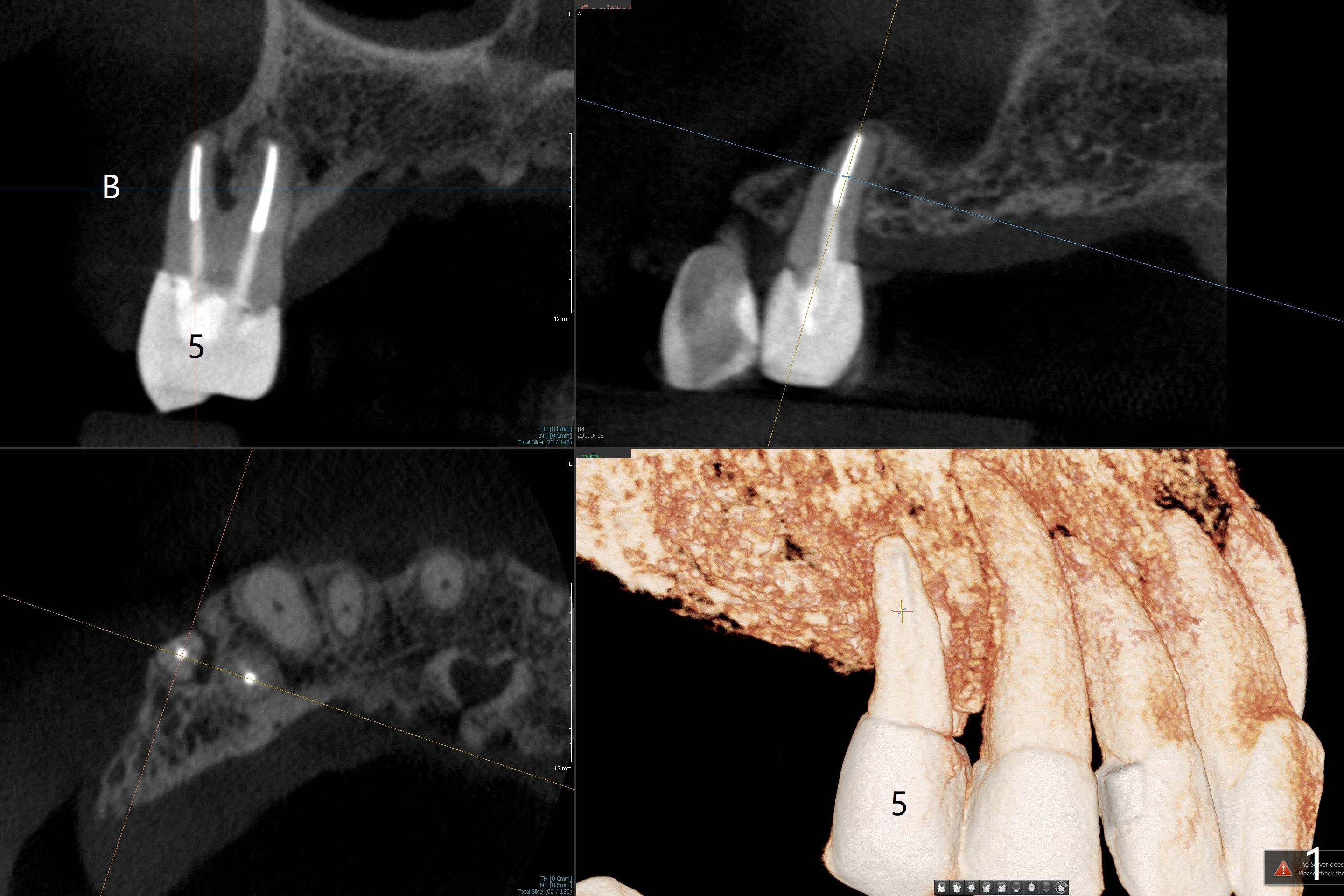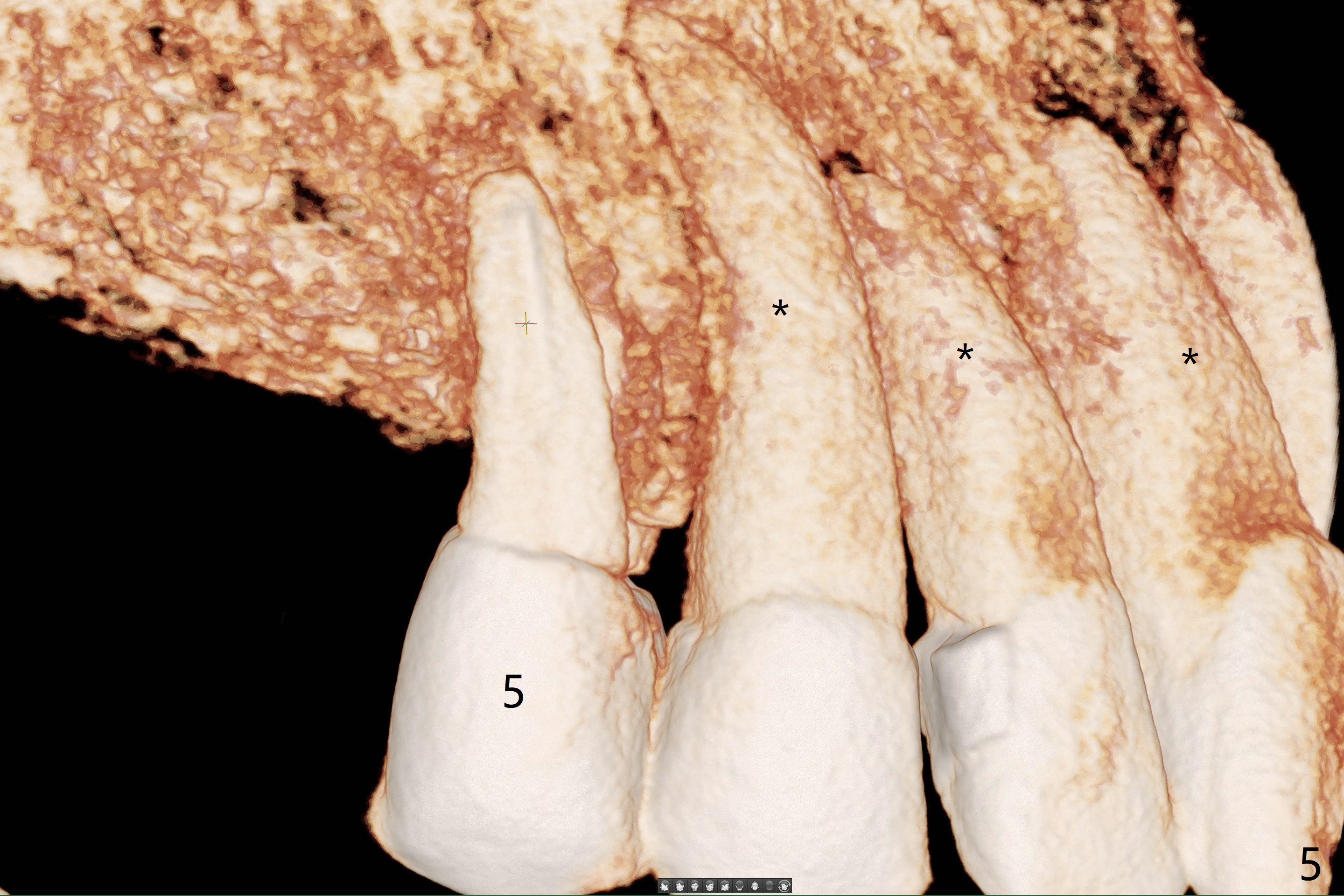 A 71-year-old woman with RPDs develops a fistula buccal to the tooth #5 (Fig.1). The buccal root seems to be fractured as indicated by arrowheads in Fig.2,3 (coronal and sagittal sections). The diagnosis of the fracture is confirmed by the abrupt change in density shown in Profile and the coronal section in Fig.4. Three-dimensional image demonstrates bone over the root surface of the teeth 6 and 8 (Fig.5 *), as compared to no bone over the the buccal root of the tooth #5. Due to financial constraint, the buccala root amputation is proposed as a treatment option. Is it viable?
