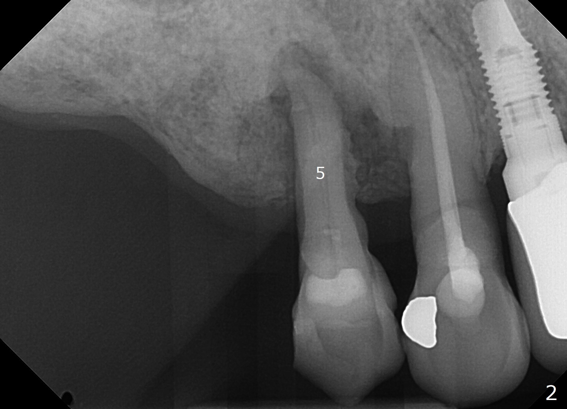 A 70-year-old woman with multiple restoration and several missing teeth (Fig.1) has sensitivity to sweet and cold at #4 (Fig.2). There is moderate gingival recession, slightly more severe buccal. CT will be taken to determine whether immediate implant is indicated. The buccal plate is most likely missing. If the vein is too thin for PRF, GEM21S will be used with possible GEM Cap RCM.