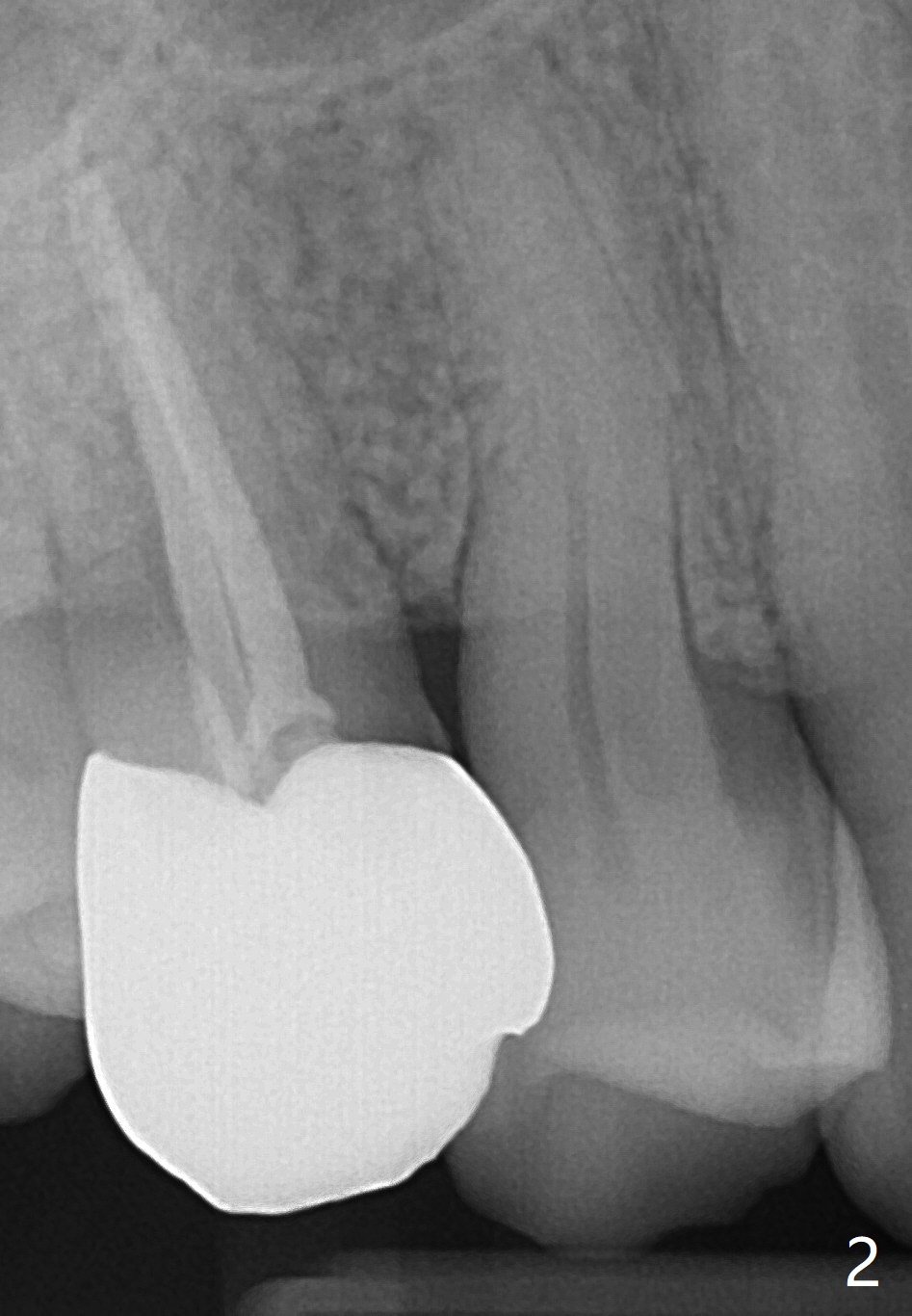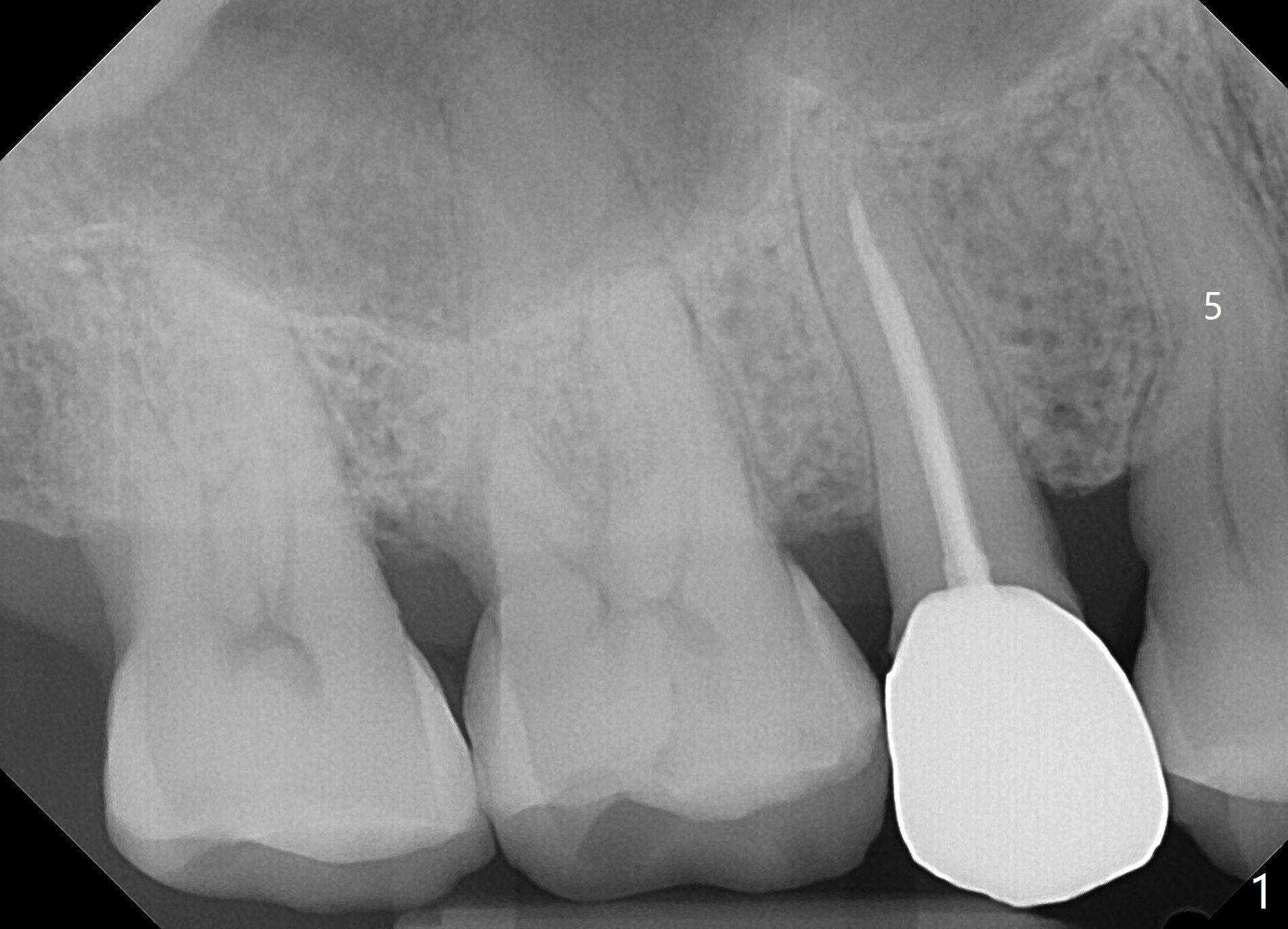 A 63-year-old man develops cold and hot sensitivity in the upper right 1st premolar after crack noise. The tooth #5 has a mesiodistal crack line (Fig.1-2). Two weeks later, the palatal cusp fractures subgingival. There is no time for guide (Fig.3). Since the root is curved and apparently difficult to extract, prepare surgical hand piece for socket shield.