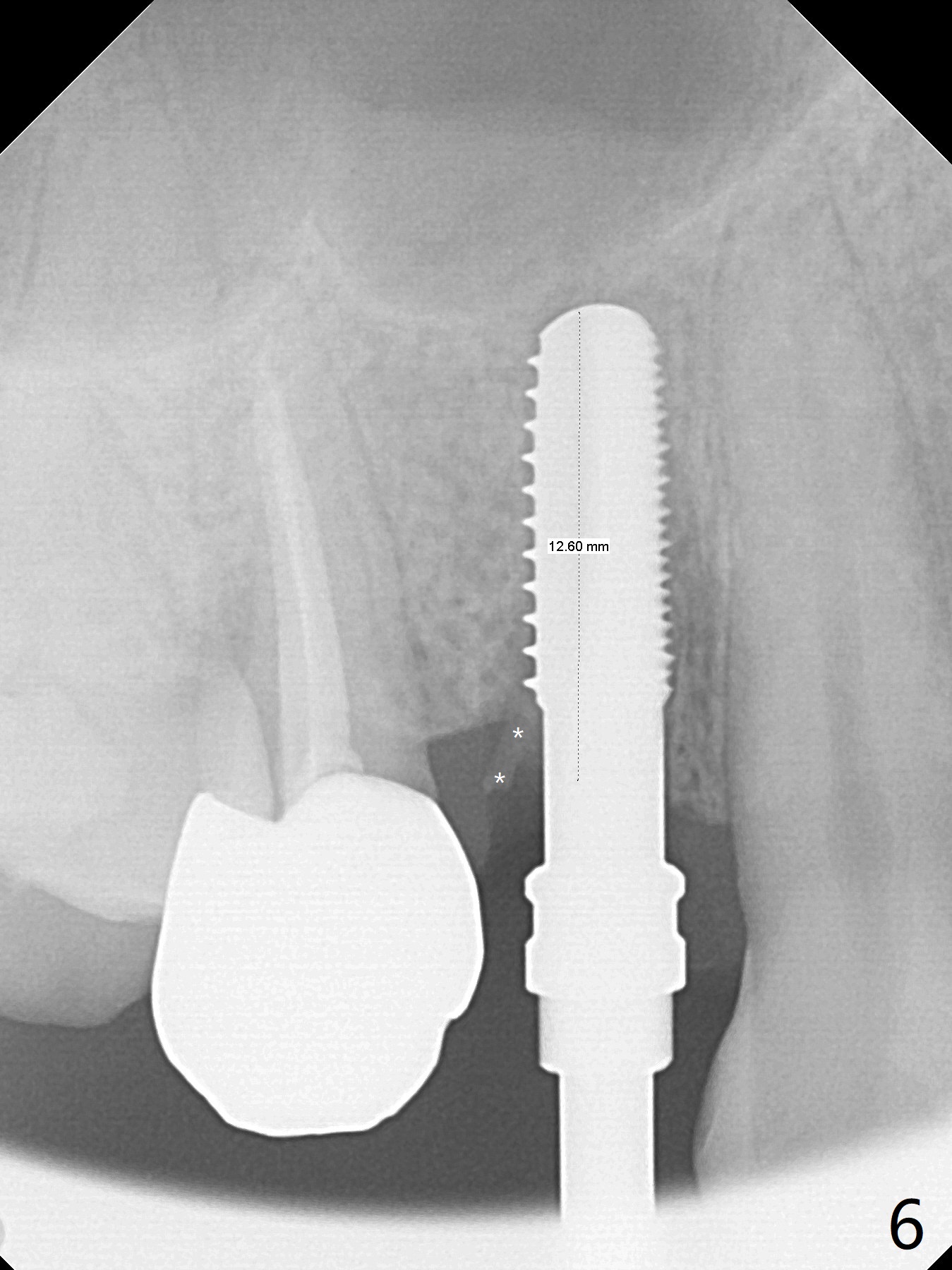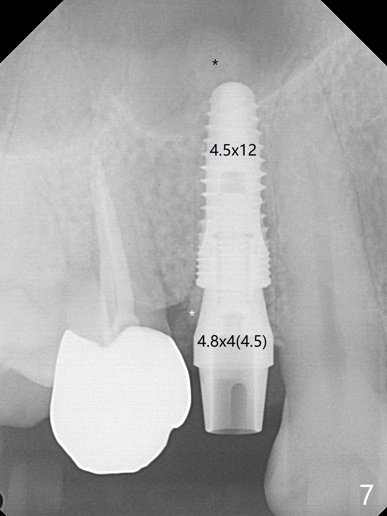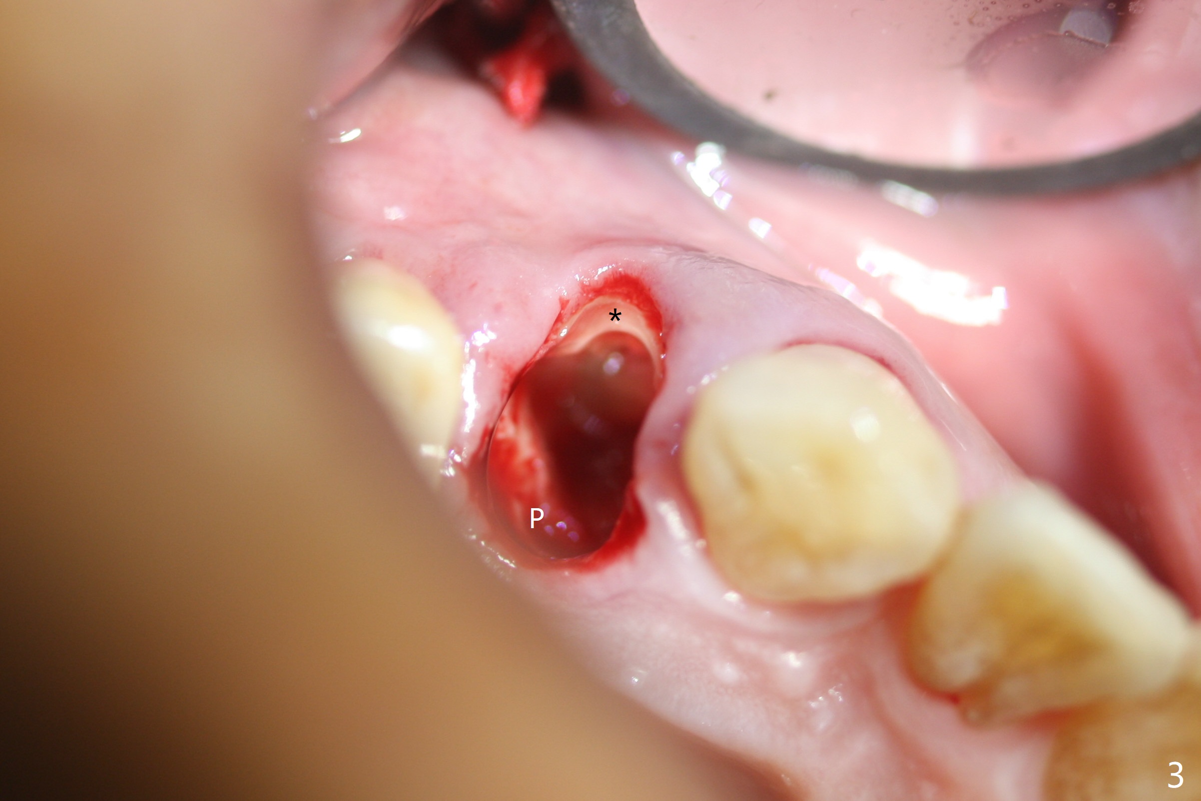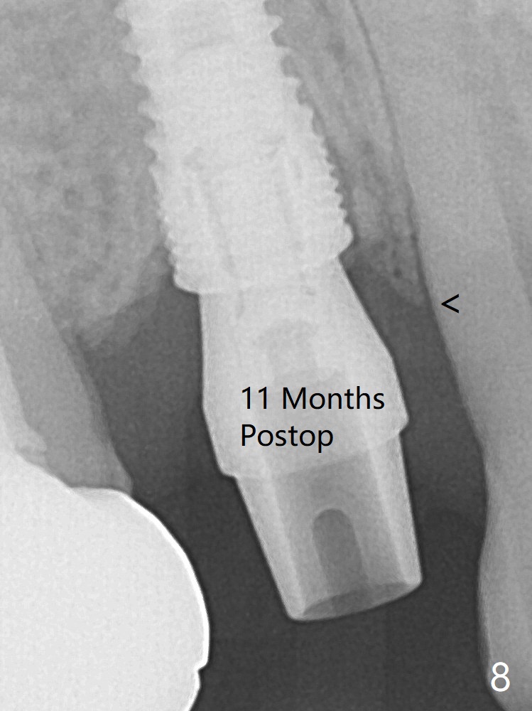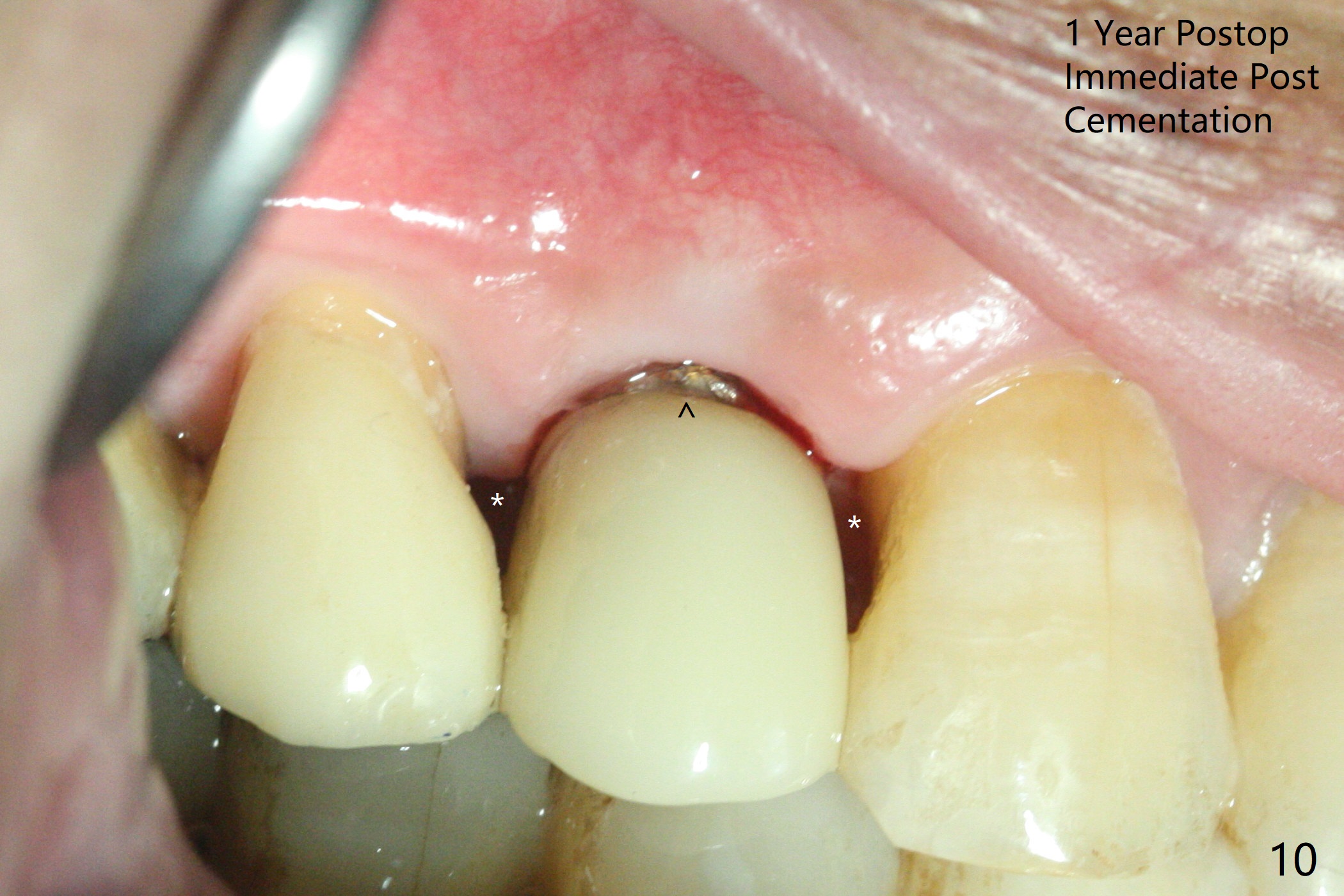 The buccal plate is normal at the tooth #5 (Fig.1) with the loose palatal fragment (Fig.2 P). Extraction leads to root fracture. Sectioning removes the palatal portion of the root and keeps the buccal semilunar piece (Fig.3 *); the mesiopalatal plate is resorbed (P). Initial osteotomy is off (Fig.4 (R: remaining root)). Redirection improves the trajectory (Fig.5). With the 2nd redirection (Fig.6 (4.5 mm tap)), a 4.5x12 mm implant is placed with 50 Ncm and sinus lift (Fig.7 black *); bone graft is placed with emphasis on the palatal defect (white *). As usual, an immediate provisional is fabricated. In fact the abutment may be not completely seated because of contact with the mesial crest. Prepare anesthetic and 5.5 mm profile drill. Take parallel BW or PA. Take occlusal photos to show no buccal or mesiopalatal atrophy. After 5.5 mm profile drill 11 months postop, the abutment has no contact with the mesial crest (Fig.8 <). Since the proximal contact between #3 and 4 is light with food impaction, the provisional at #5 is fabricated with tight distal contact. When the patient returns for final crown cementation (Fig.9), the food impaction is minimal between #3 and 4. The distal black triangle (Fig.10 *) and exposure of the abutment margin (^) are partially related to provisional fabrication and should dissolve over time considering socket shield.
