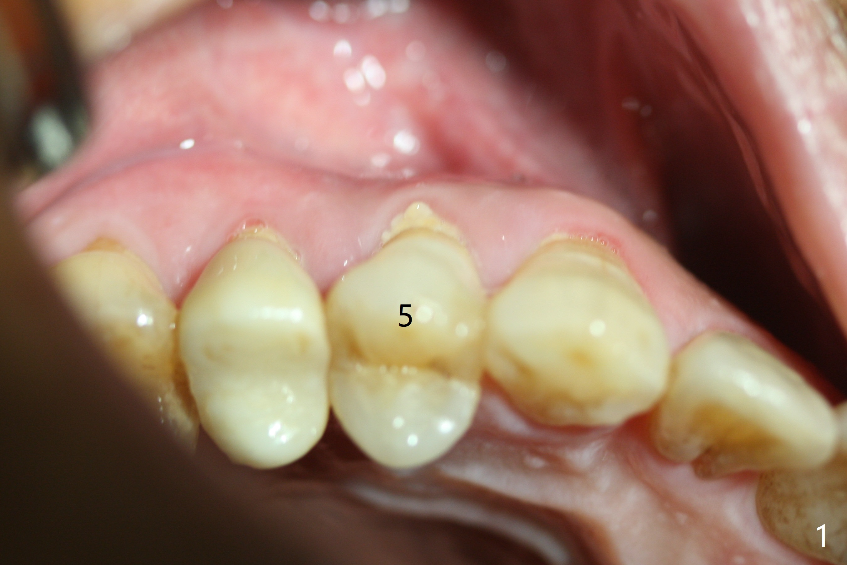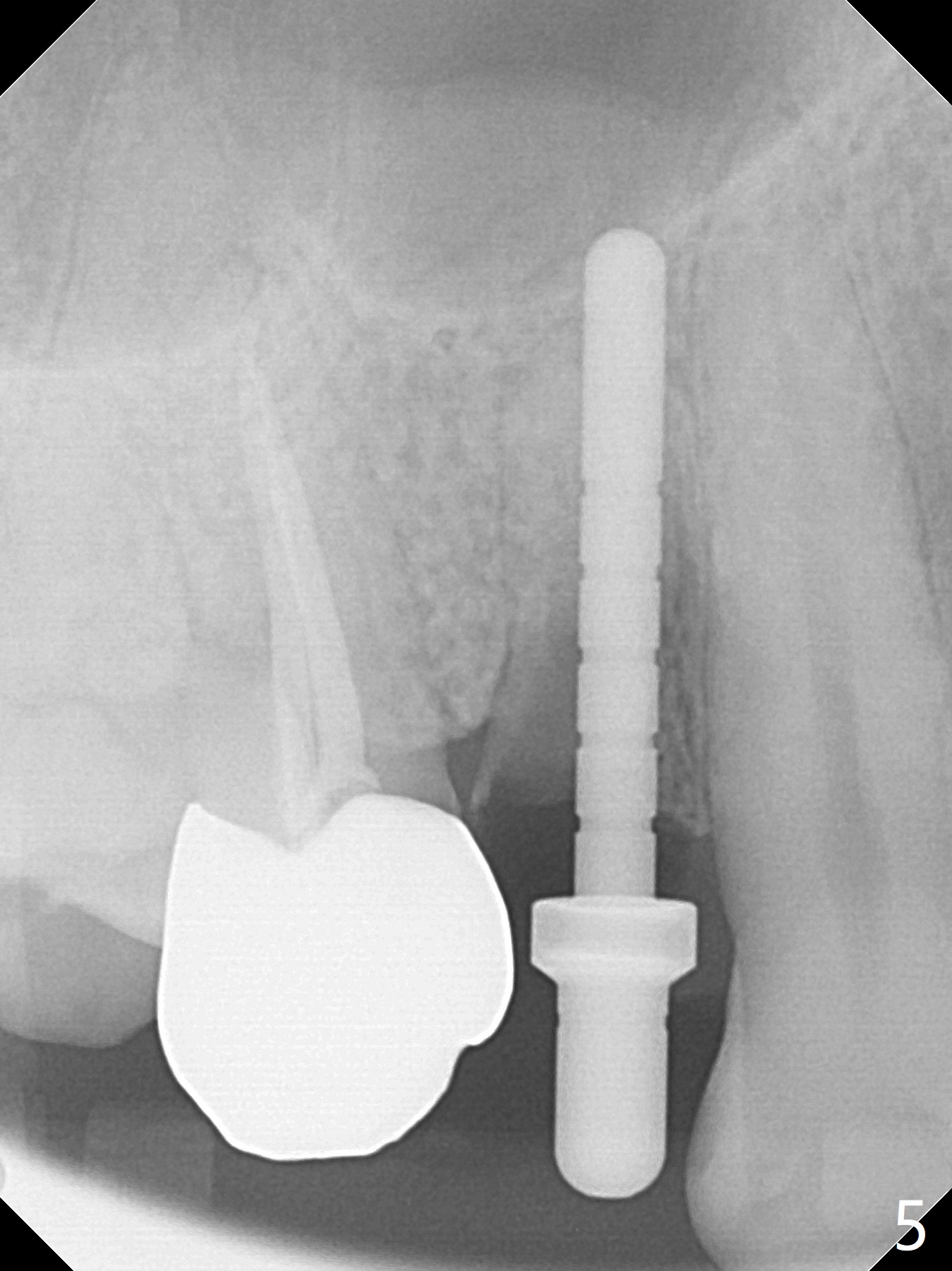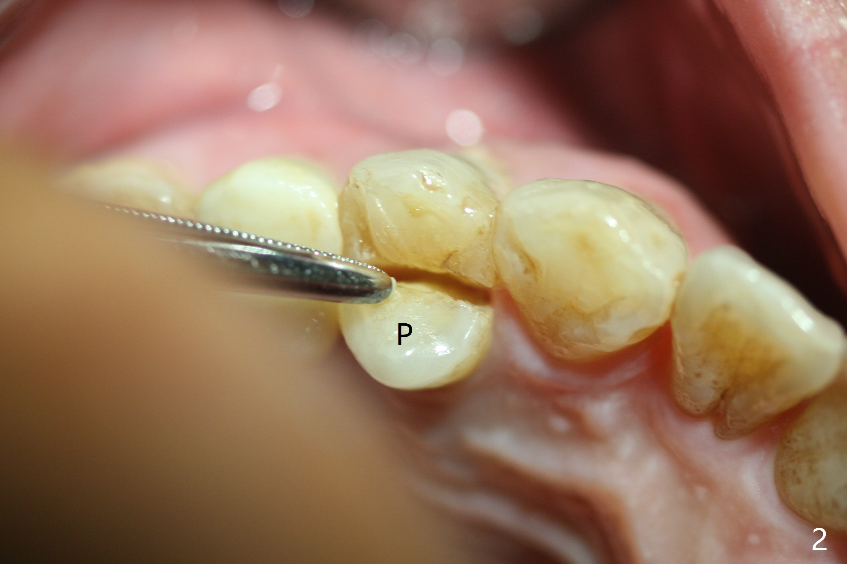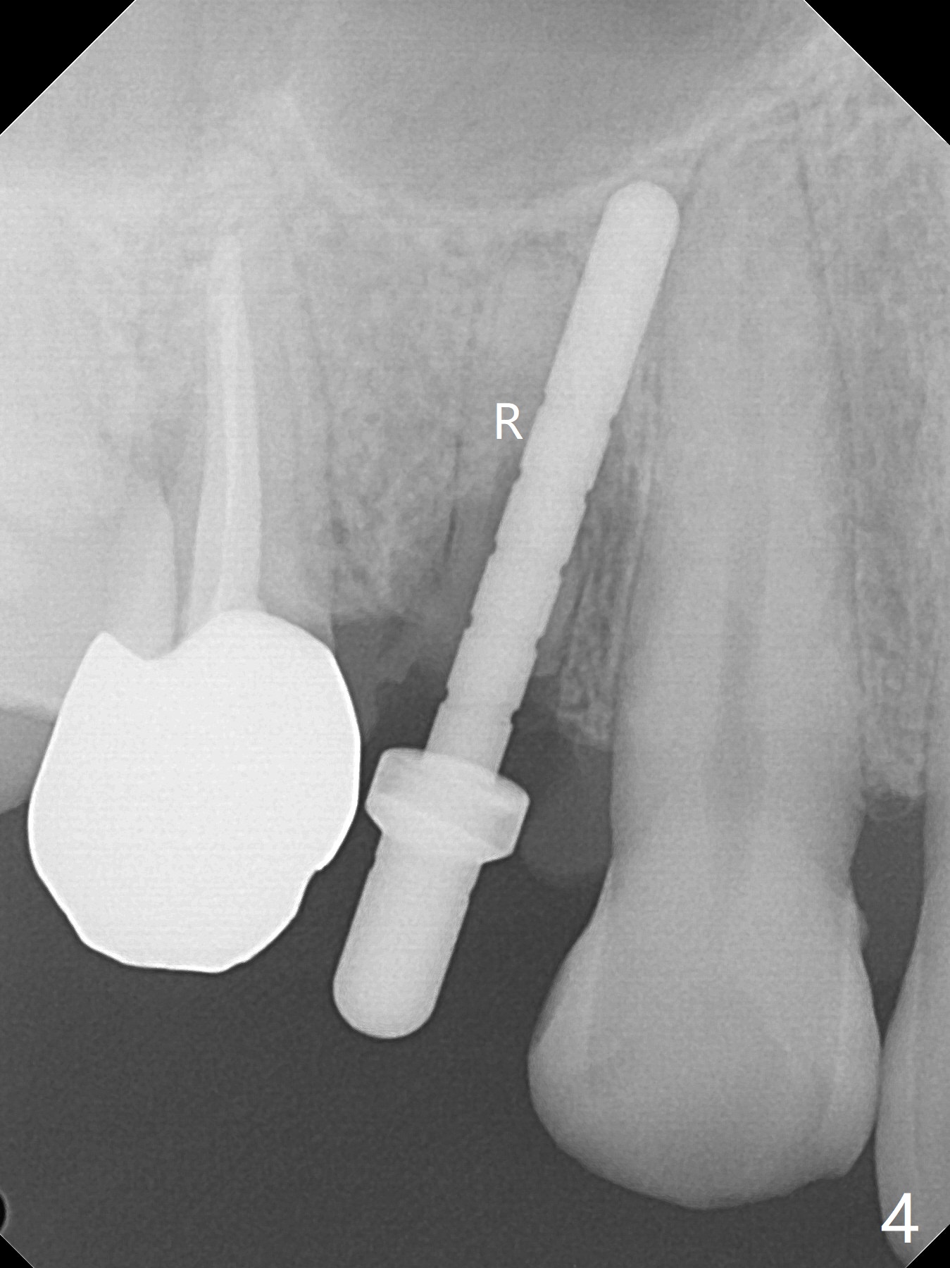 The buccal plate is normal at the tooth #5 (Fig.1) with the loose palatal fragment (Fig.2 P). Extraction leads to root fracture. Sectioning removes the palatal portion of the root and keeps the buccal semilunar piece (Fig.3 *); the mesiopalatal plate is resorbed (P). Initial osteotomy is off (Fig.4 (R: remaining root)). Redirection improves the trajectory (Fig.5). With the 2nd redirection (Fig.6 (4.5 mm tap)), a 4.5x12 mm implant is placed with 50 Ncm and sinus lift (Fig.7 black *); bone graft is placed with emphasis on the palatal defect (white *). As usual, an immediate provisional is fabricated. In fact the abutment may be not completely seated because of contact with the mesial crest. Prepare anesthetic and 5.5 mm profile drill. Take parallel BW or PA. Take occlusal photos to show no buccal or mesiopalatal atrophy. After 5.5 mm profile drill 11 months postop, the abutment has no contact with the mesial crest (Fig.8 <). Since the proximal contact between #3 and 4 is light with food impaction, the provisional at #5 is fabricated with tight distal contact. When the patient returns for final crown cementation (Fig.9), the food impaction is minimal between #3 and 4. The distal black triangle (Fig.10 *) and exposure of the abutment margin (^) are partially related to provisional fabrication and should dissolve over time considering socket shield.