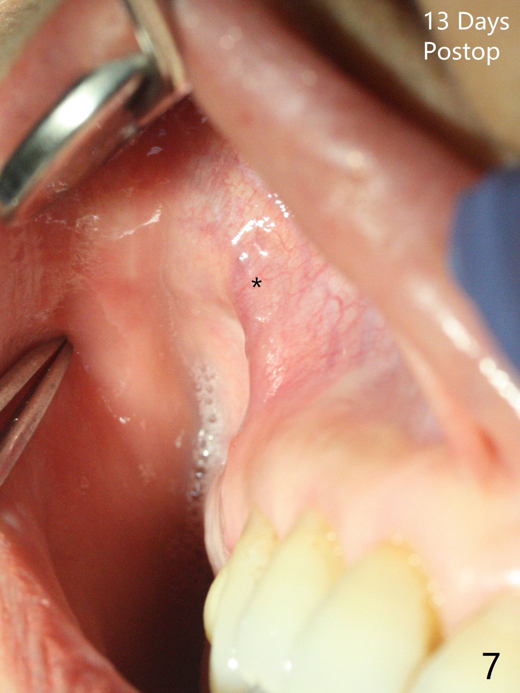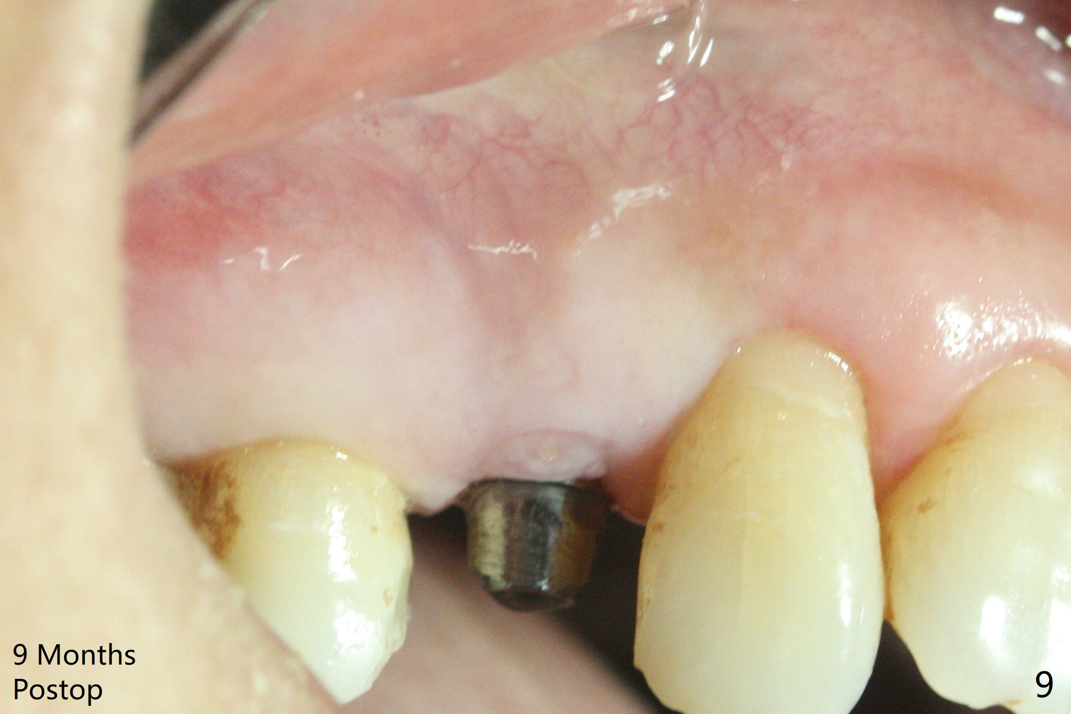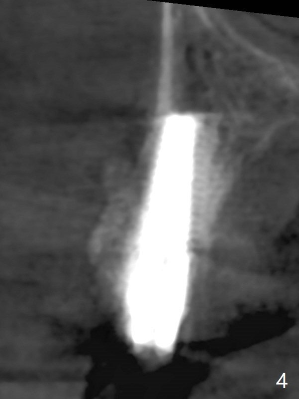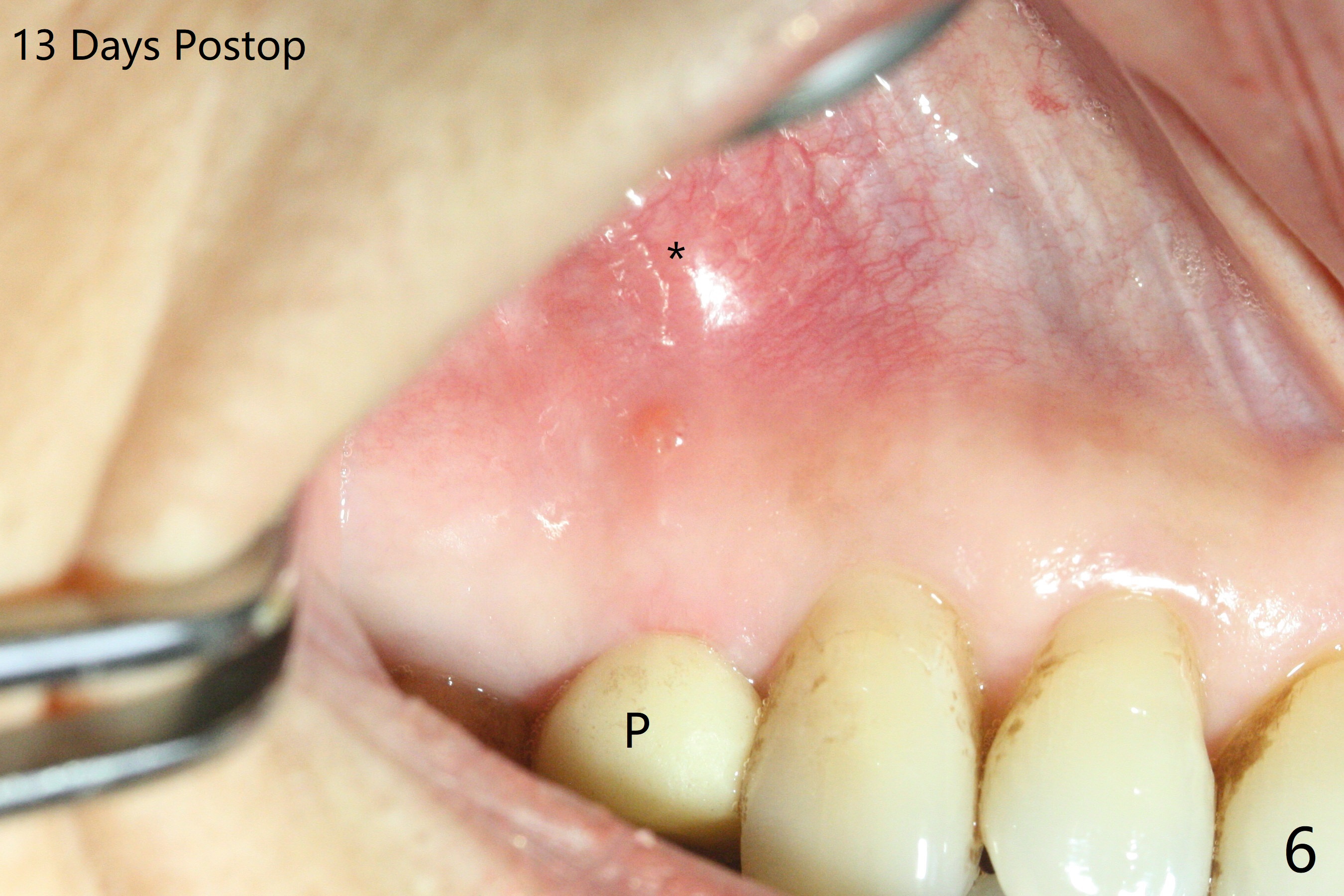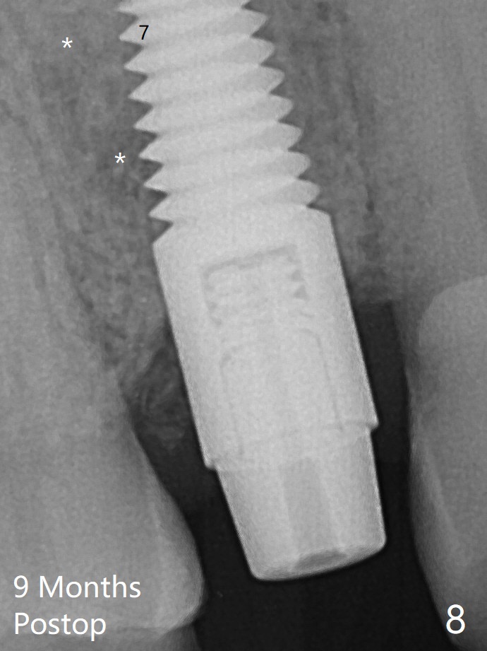 After extraction of the tooth #4 with fistula (Fig.1), the buccal bony defect is superior to the fistula. Before placement of a 4.5x17 mm tissue-level implant (Fig.2) and after osteotomy for bone-level one, PRF and mixture of autogenous bone and allograft are pushed from the socket through the buccal defect for repair (Fig.3 arrowheads). The trajectory of the implant (Fig.4) is consistent with design (Fig.5). The fistula reduces in size and in redness, while the apical elevation (as related to the underlying bone graft) remains prominent 13 days postop (Fig.6,7 *). The distal defect has been apparently repaired 9 months postop (Fig.8 *, as compared to immediately post bone graft in Fig.2). The distal defect has been apparently repaired 9 months postop (Fig.8 *, as compared to immediately post bone graft in Fig.2). The fistula disappears (Fig.9).