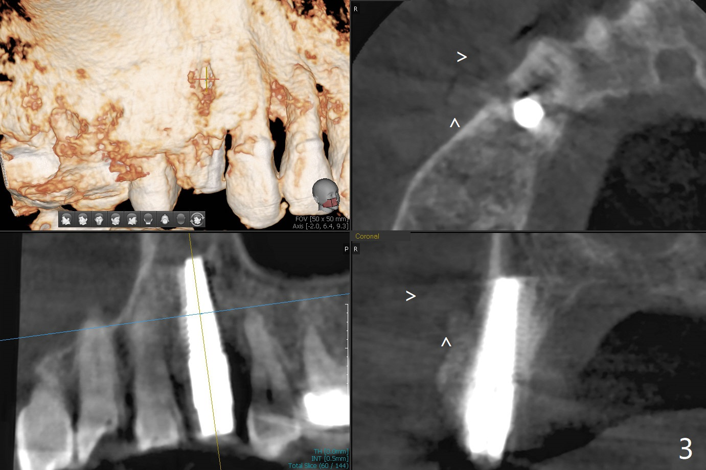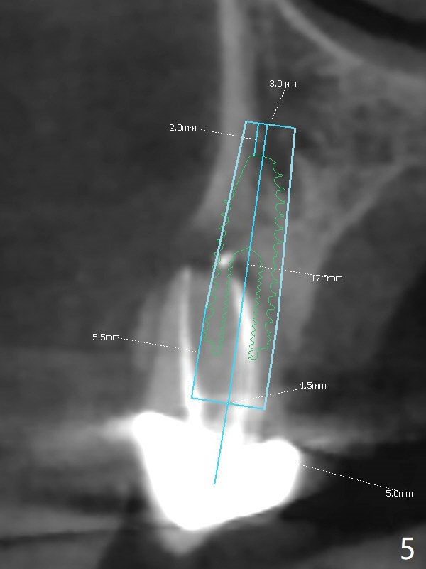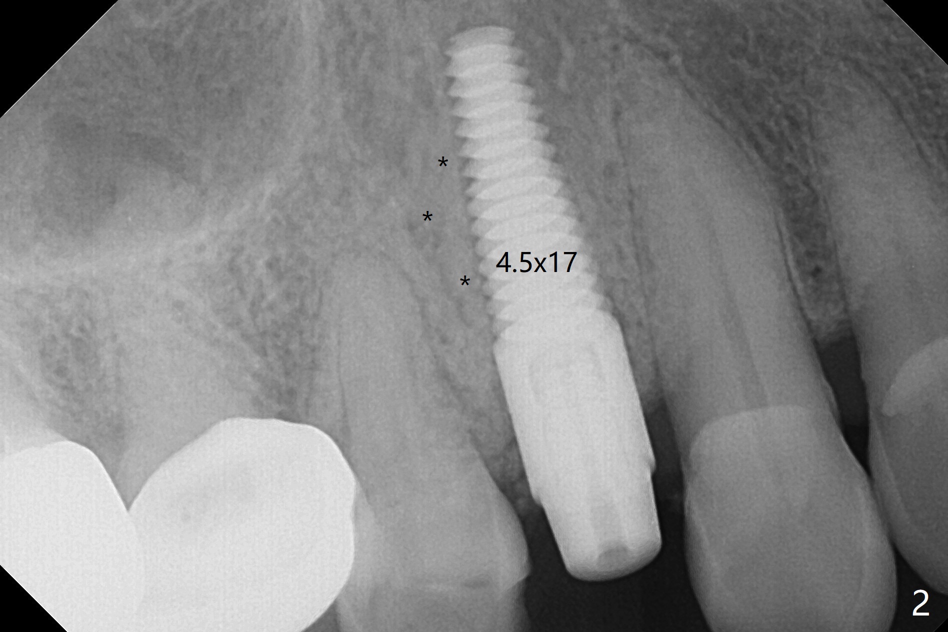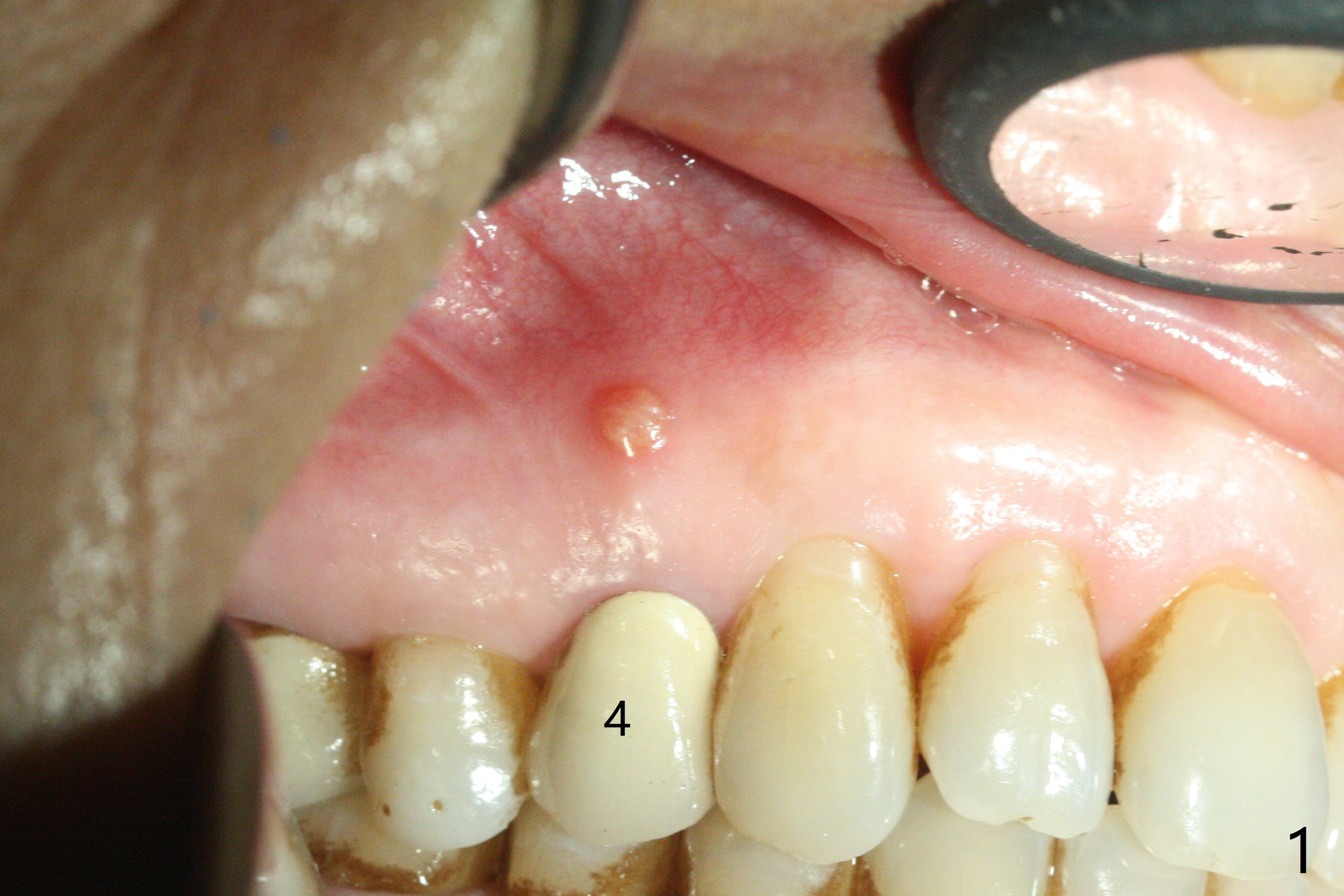 After extraction of the tooth #4 with fistula (Fig.1), the buccal bony defect is superior to the fistula. Before placement of a 4.5x17 mm tissue-level implant (Fig.2) and after osteotomy for bone-level one, PRF and mixture of autogenous bone and allograft are pushed from the socket through the buccal defect for repair (Fig.3 arrowheads). The trajectory of the implant (Fig.4) is consistent with design (Fig.5). The fistula reduces in size and in redness, while the apical elevation (as related to the underlying bone graft) remains prominent 13 days postop (Fig.6,7 *). The distal defect has been apparently repaired 9 months postop (Fig.8 *, as compared to immediately post bone graft in Fig.2). The distal defect has been apparently repaired 9 months postop (Fig.8 *, as compared to immediately post bone graft in Fig.2). The fistula disappears (Fig.9).