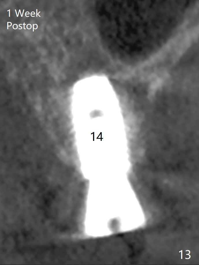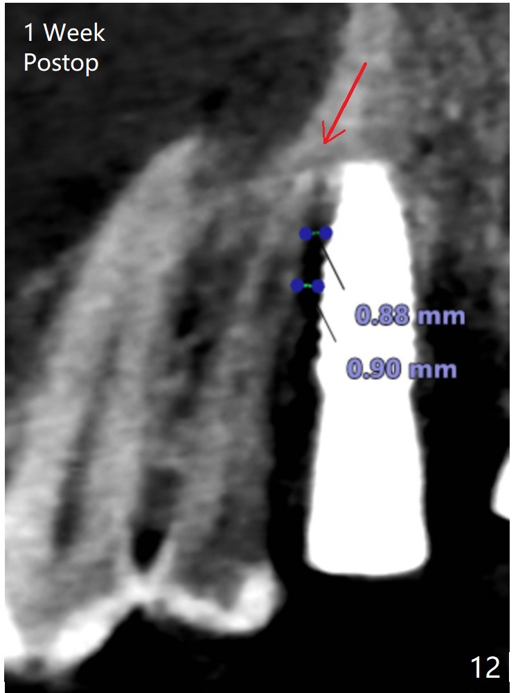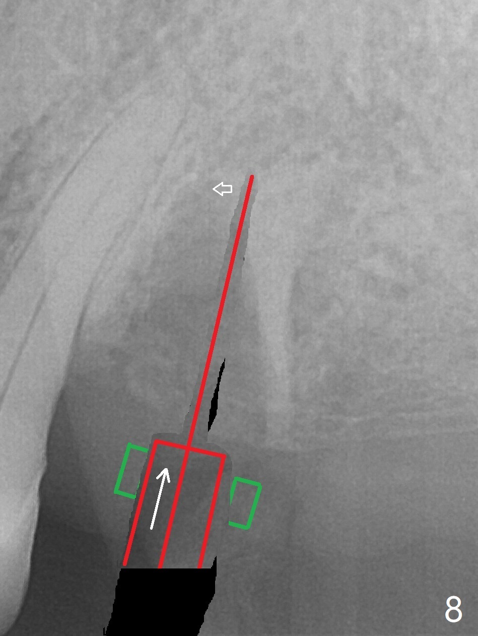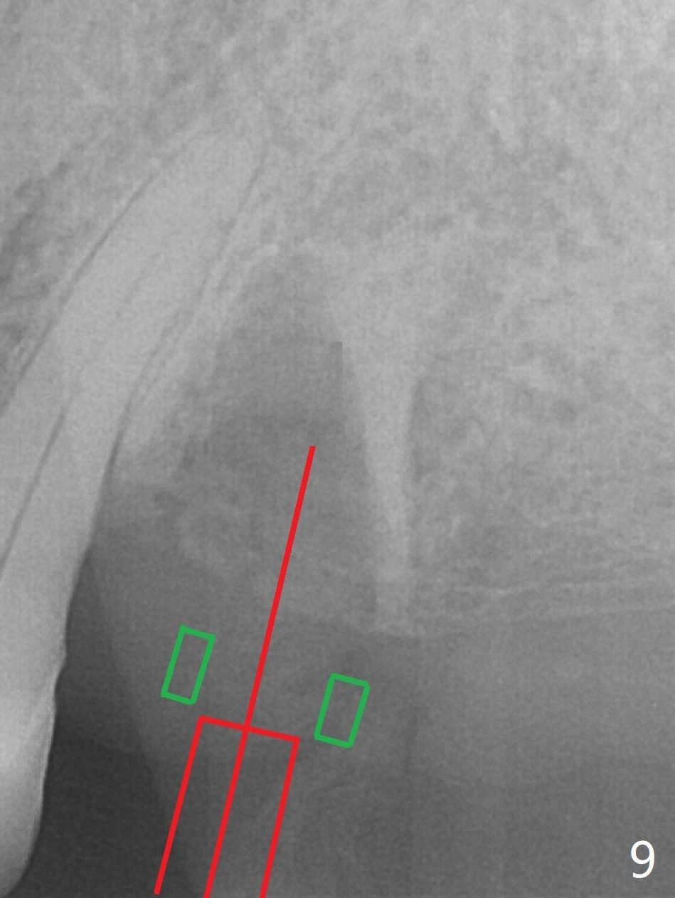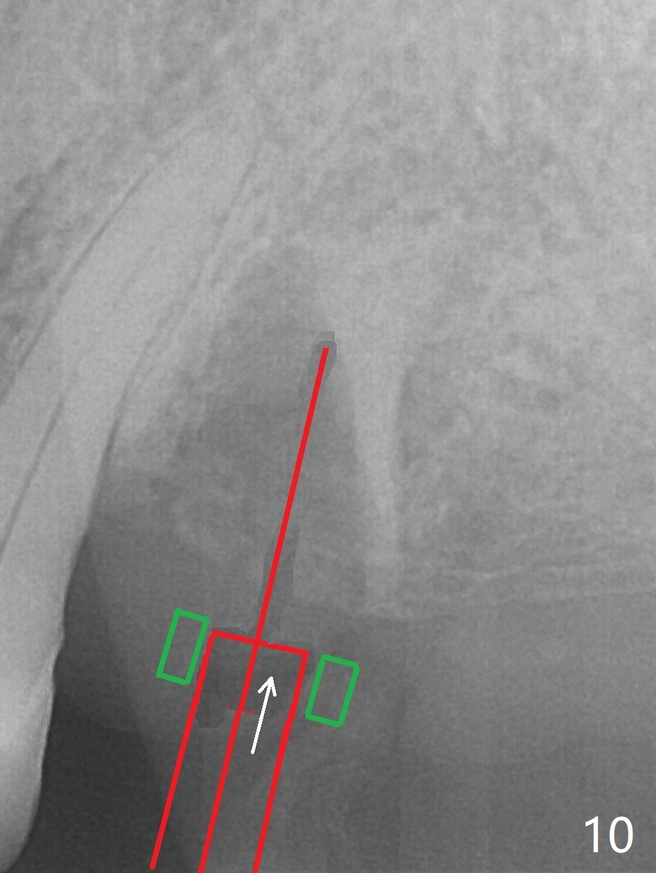 After extraction of the tooth #13 residual root, the bone in the distal wall of the socket looks white. Intraop PA rules out root structure (Fig.1 *). Osteotomy is conducted according to drill sequence. Bitewings are taken to check implant placement level (Fig.2,3). Following implant level adjustment and healing abutment installment (Fig.4,5 (*: bone graft)), the implant at #13 is found to be close the root of #12 (Fig.6 *), i.e., not parallel to the implant at #14. Introspectively, 2.2x10 mm drill seems to be long. When it touches the bone, the cylinder portion of the drill (Fig.7 red) does not engage into the sleeve (green). When it goes into the bone, it may have been deflected mesial due to the slope of the distal wall of the socket (hard bone, Fig.8 open arrow)). If a shorter drill (such as 2.2x7.3 or 8.5 mm) were used (Fig.9), the deflection would be minimal if drilling is slow (Fig.10). CT taken 1 week postop shows that the implant at #13 is approximately 1 mm near the root of the tooth #12, but the neurovascular bundle to the latter seems not to have been interrupted (Fig.11,12). The buccopalatal trajectory at #14 is within normal limit (Fig.11,13 (B: buccal)). There is no periapical radiolucency at #12 five months postop (Fig.14). However the cemented abutments are incompletely seated (<). The patient is reluctant to return for impression 17 months postop (due to coronavirus); with attention, the same abutment at #13 is reseated completely; an abutment with longer cuff and narrower diameter is also seated completely (Fig.15).